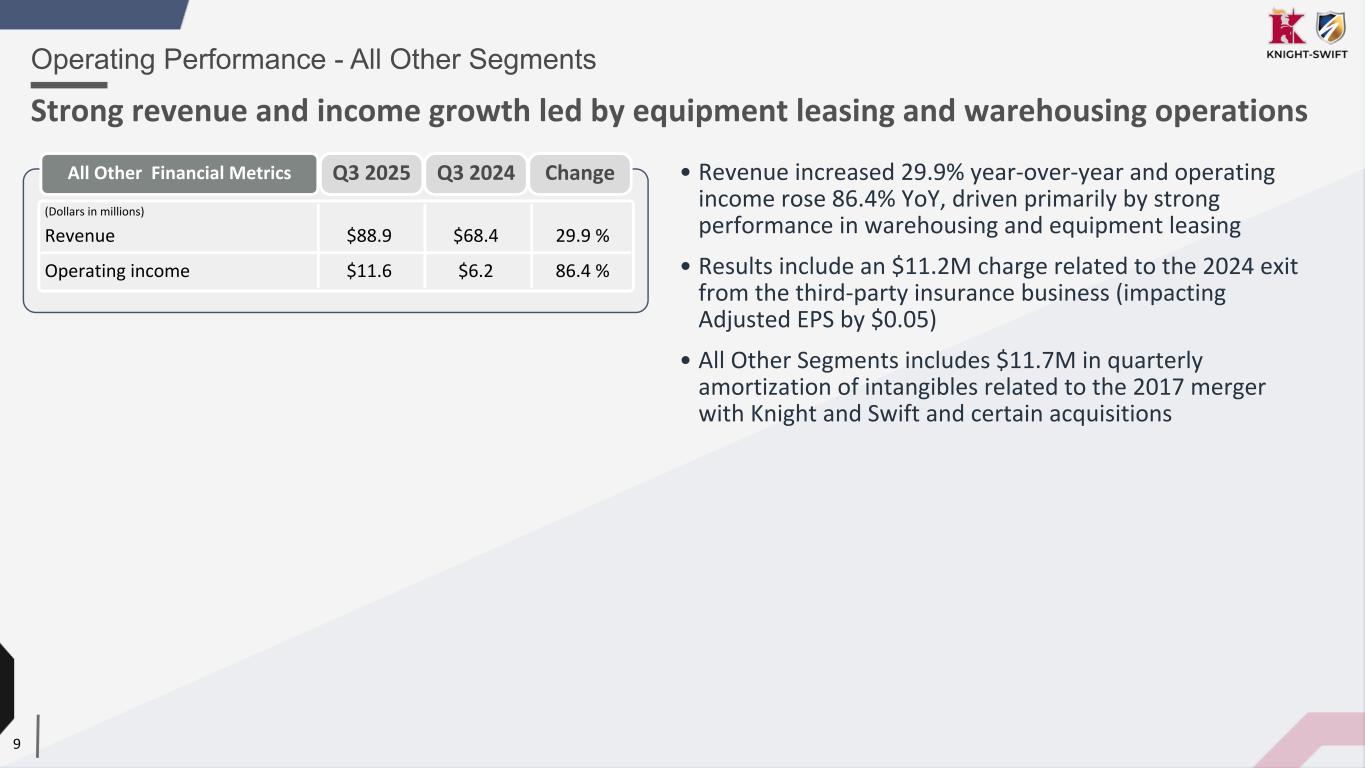 8 • Adjusted Operating Ratio improved 160 bps year-over-year driven by reductions in cost and improvements in network balance. • Improved load count 8.2% sequentially from 2Q 2025 while improving Adjusted Operating Ratio 430 bps • Disciplined pricing generating 3.5% average revenue per load increase year-over-year Operating Performance - Intermodal Returned to profitability through disciplined pricing and cost management (Dollars in millions) Revenue ex intersegment $94.1 $102.7 (8.4 %) Operating (loss) $(2.3) $(1.4) (65.7 %) Adjusted Operating Income (loss) 1 $0.2 $(1.4) 111.2 % Operating ratio 102.4% 101.4% 100 bps Adjusted Operating Ratio 1 99.8% 101.4% (160 bps) Intermodal Financial Metrics Average revenue per load $2,660 $2,569 3.5 % Load count 35,375 39,968 (11.5 %) Average tractors 573 622 (7.9 %) Average containers 12,535 12,569 (0.3 %) Intermodal Operating Statistics Q3 2025 Q3 2024 Change Q3 2025 Q3 2024 Change 1 See GAAP to non-GAAP reconciliation in the schedules following this presentation.