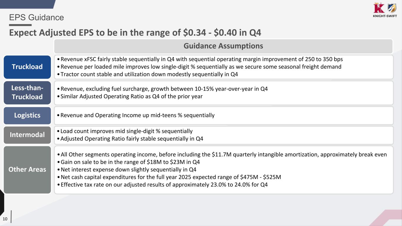 9 • Revenue increased 29.9% year-over-year and operating income rose 86.4% YoY, driven primarily by strong performance in warehousing and equipment leasing • Results include an $11.2M charge related to the 2024 exit from the third-party insurance business (impacting Adjusted EPS by $0.05) • All Other Segments includes $11.7M in quarterly amortization of intangibles related to the 2017 merger with Knight and Swift and certain acquisitions Operating Performance - All Other Segments Strong revenue and income growth led by equipment leasing and warehousing operations (Dollars in millions) Revenue $88.9 $68.4 29.9 % Operating income $11.6 $6.2 86.4 % All Other Financial Metrics Q3 2025 Q3 2024 Change