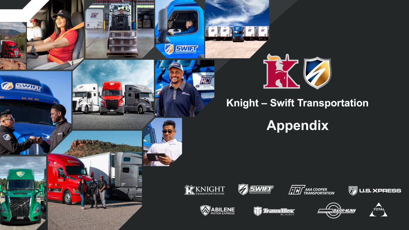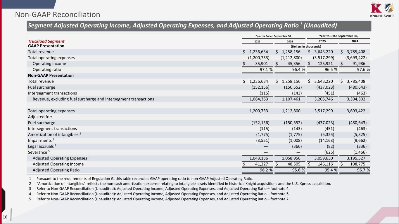 15 Adjusted Net Income Attributable to Knight-Swift and Adjusted EPS 1 2 (Unaudited) Quarter Ended September 30, Year-to-Date September 30, 2025 2024 2025 2024 GAAP: Earnings per diluted share $ 0.05 $ 0.19 $ 0.45 $ 0.30 Adjusted for: Income tax expense attributable to Knight-Swift 0.05 0.09 0.19 0.14 Income before income taxes attributable to Knight-Swift 0.09 0.27 0.64 0.43 Amortization of intangibles 3 0.12 0.12 0.36 0.35 Impairments 4 0.21 0.01 0.28 0.07 Legal accruals 5 — — — 0.01 Transaction fees 6 — — — — Severance expense 7 — — 0.01 0.04 Change in fair value of deferred earnout 8 — (0.01) — (0.01) Loss on investment 9 — 0.07 — 0.07 Write-off of deferred debt issuance costs 10 0.01 — 0.01 — Adjusted income before income taxes 0.45 0.47 1.31 0.98 Provision for income tax expense at effective rate 11 (0.13) (0.14) (0.36) (0.28) Non-GAAP: Adjusted EPS $ 0.32 $ 0.34 $ 0.95 $ 0.70 Note: Because the numbers reflected in the table above are calculated on a per share basis, they may not foot due to rounding. 1 Pursuant to the requirements of Regulation G, these tables reconcile consolidated GAAP net income attributable to Knight-Swift to non-GAAP consolidated Adjusted Net Income Attributable to Knight-Swift. 2 Refer to Non-GAAP Reconciliation (Unaudited): Adjusted Operating Income and Adjusted Operating Ratio – footnote 2. 3 Refer to Non-GAAP Reconciliation (Unaudited): Adjusted Operating Income and Adjusted Operating Ratio – footnote 3. 4 Refer to Non-GAAP Reconciliation (Unaudited): Adjusted Operating Income and Adjusted Operating Ratio – footnote 4. 5 Refer to Non-GAAP Reconciliation (Unaudited): Adjusted Operating Income and Adjusted Operating Ratio – footnote 5. 6 Refer to Non-GAAP Reconciliation (Unaudited): Adjusted Operating Income and Adjusted Operating Ratio – footnote 6. 7 Refer to Non-GAAP Reconciliation (Unaudited): Adjusted Operating Income and Adjusted Operating Ratio – footnote 7. 8 Refer to Non-GAAP Reconciliation (Unaudited): Adjusted Operating Income and Adjusted Operating Ratio – footnote 8. 9 "Loss on investment" reflects the write-off of a minority investment in a transportation-adjacent technology venture which ceased operations in the third quarter of 2024 and is recorded within the All Other Segments. 10 "Write-off of deferred debt issuance costs" was incurred from replacing the 2021 Debt Agreement and 2023 Debt Agreement with the 2025 Debt Agreement. 11 For the third quarter of 2025, an adjusted effective tax rate of 29.6% was applied in our Adjusted EPS calculation. For the year-to-date period ending September 30, 2025, an adjusted effective tax rate of 27.8% was applied in our Adjusted EPS calculation. For the third quarter of 2024, an adjusted effective tax rate of 29.3% was applied in our Adjusted EPS calculation to exclude certain discrete items. For the year-to-date period ending September 30, 2024, an adjusted effective tax rate of 28.5% was applied in our adjusted EPS calculation to exclude certain discrete items. djusted Net Income Attributable to Knight-Swift and Adjusted EPS 1 2 (Unaudited) Non-GAAP Reconciliation