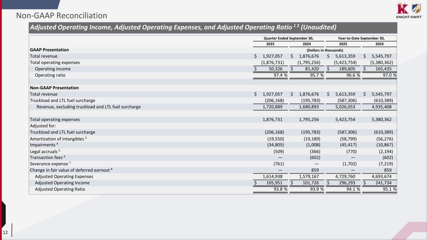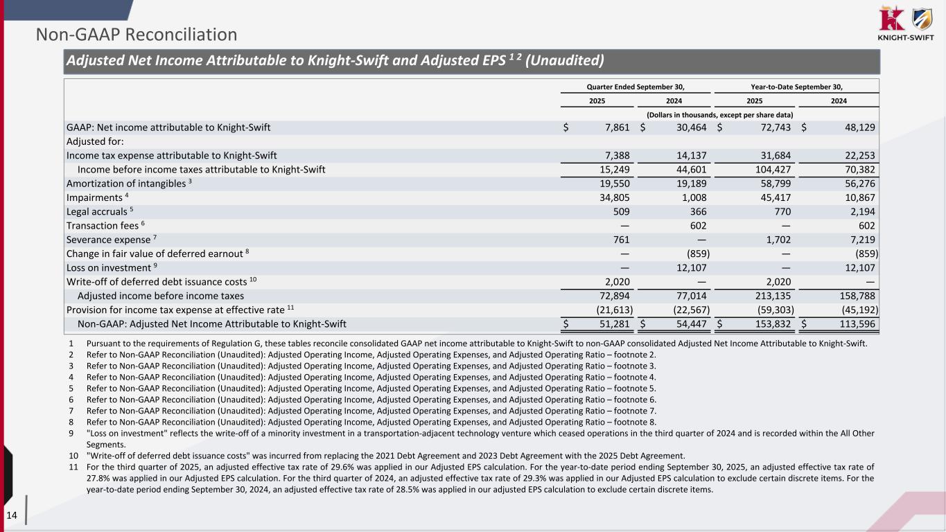 13 Adjusted Operating Income, Adjusted Operating Expenses, and Adjusted Operating Ratio (Unaudited) 1 Pursuant to the requirements of Regulation G, this table reconciles consolidated GAAP operating ratio to consolidated non-GAAP Adjusted Operating Ratio. 2 The reported results do not include the results of operations of the LTL division of DHE prior to its acquisition by Knight-Swift on July 30, 2024 in accordance with the accounting treatment applicable to the transaction. 3 "Amortization of intangibles" reflects the non-cash amortization expense relating to intangible assets identified in the 2017 Merger, the ACT acquisition, the U.S. Xpress acquisition, and other acquisitions, as well as the non-cash amortization expense related to the fair value of favorable leases assumed in the DHE acquisition included within "Rental expense" in the condensed consolidated statements of comprehensive income. 4 "Impairments" reflects the non-cash impairment: • Third quarter 2025 impairments reflect the non-cash impairments of tradenames associated with the decision to rebrand the MME and DHE brands of our LTL businesses under the AAA Cooper brand (within the LTL segment), as well as certain discontinued software projects (within the Intermodal Segment), and certain real property leases (within the Truckload Segment). Second quarter 2025 impairments reflects non-cash impairments related to certain real property owned and leased (within the Truckload Segment). First quarter 2025 reflects non-cash impairments related to certain real property leases (within the Truckload segment). • Third quarter and year-to-date 2024 reflects the non-cash impairments of building improvements, certain revenue equipment held for sale, leases, and other equipment (within the Truckload segment and All Other Segments). 5 "Legal accruals" are included in "Miscellaneous operating expenses" in the condensed consolidated statements of comprehensive income and reflect the following: • First and third quarter 2025 legal expense reflects the increased estimated exposure for accrued legal matters based on recent settlement agreements. • Year-to-date 2024 legal expense reflects the increased estimated exposures for accrued legal matters based on recent settlement agreements. 6 "Transaction fees" reflects certain legal and professional fees associated with the July 30, 2024 acquisition of DHE. The transaction fees are included within "Miscellaneous operating expenses" in the condensed statements of comprehensive income. 7 "Severance expense" is included within "Salaries, wages, and benefits" in the condensed statements of comprehensive income. 8 "Change in fair value of deferred earnout" reflects the benefit for the change in fair value of a deferred earnout related to various acquisitions, which is recorded in "Miscellaneous operating expenses". Non-GAAP Reconciliation