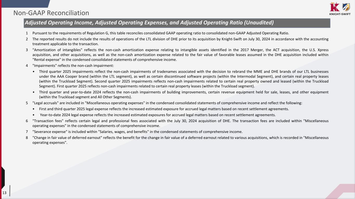 12 Adjusted Operating Income, Adjusted Operating Expenses, and Adjusted Operating Ratio 1 2 (Unaudited) Quarter Ended September 30, Year-to-Date September 30, 2025 2024 2025 2024 GAAP Presentation (Dollars in thousands) Total revenue $ 1,927,057 $ 1,876,676 $ 5,613,359 $ 5,545,797 Total operating expenses (1,876,731) (1,795,256) (5,423,754) (5,380,362) Operating income $ 50,326 $ 81,420 $ 189,605 $ 165,435 Operating ratio 97.4 % 95.7 % 96.6 % 97.0 % Non-GAAP Presentation Total revenue $ 1,927,057 $ 1,876,676 $ 5,613,359 $ 5,545,797 Truckload and LTL fuel surcharge (206,168) (195,783) (587,306) (610,389) Revenue, excluding truckload and LTL fuel surcharge 1,720,889 1,680,893 5,026,053 4,935,408 Total operating expenses 1,876,731 1,795,256 5,423,754 5,380,362 Adjusted for: Truckload and LTL fuel surcharge (206,168) (195,783) (587,306) (610,389) Amortization of intangibles 3 (19,550) (19,189) (58,799) (56,276) Impairments 4 (34,805) (1,008) (45,417) (10,867) Legal accruals 5 (509) (366) (770) (2,194) Transaction fees 6 — (602) — (602) Severance expense 7 (761) — (1,702) (7,219) Change in fair value of deferred earnout 8 — 859 — 859 Adjusted Operating Expenses 1,614,938 1,579,167 4,729,760 4,693,674 Adjusted Operating Income $ 105,951 $ 101,726 $ 296,293 $ 241,734 Adjusted Operating Ratio 93.8 % 93.9 % 94.1 % 95.1 % Non-GAAP Reconciliation
