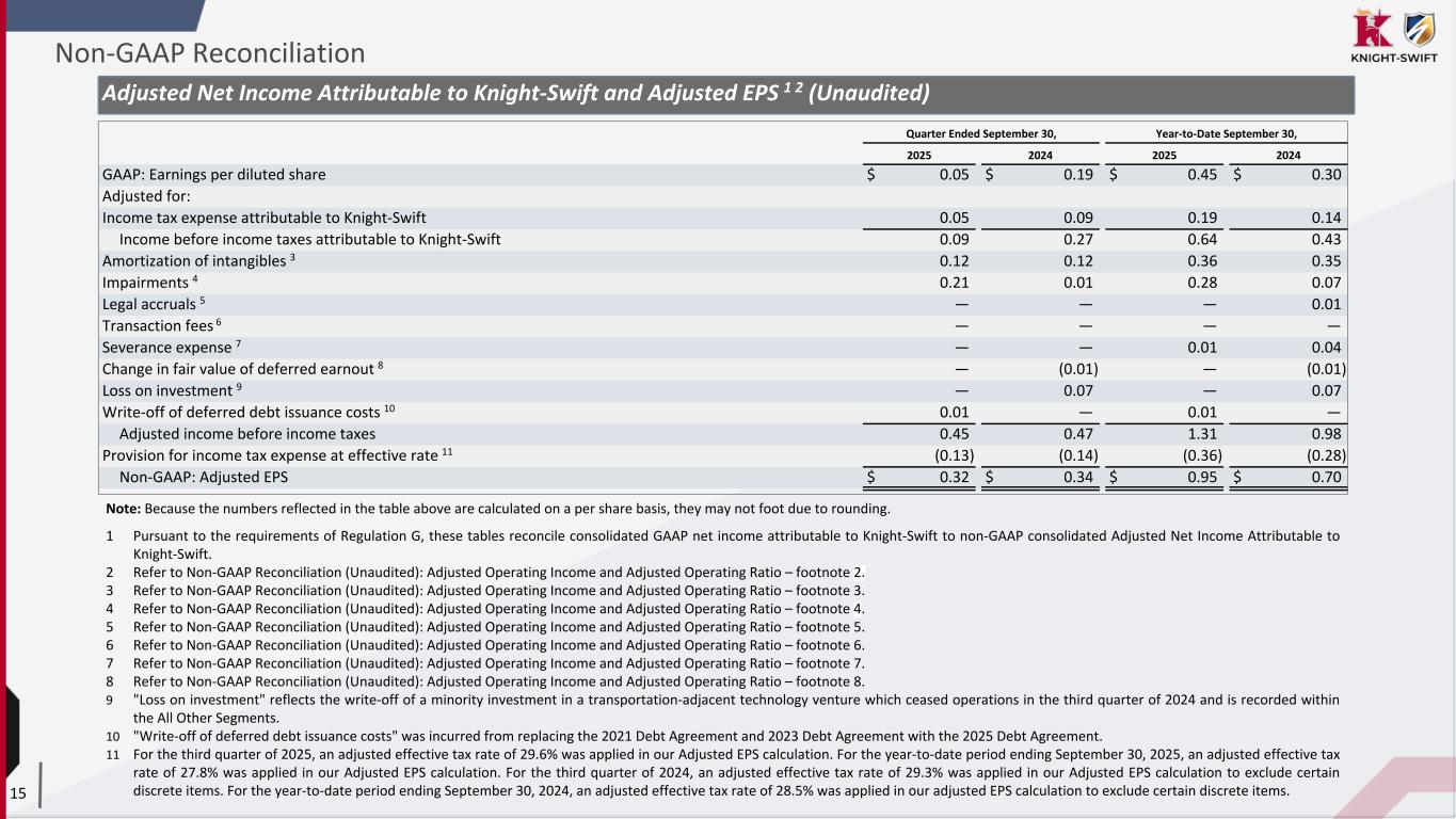 14 1 Pursuant to the requirements of Regulation G, these tables reconcile consolidated GAAP net income attributable to Knight-Swift to non-GAAP consolidated Adjusted Net Income Attributable to Knight-Swift. 2 Refer to Non-GAAP Reconciliation (Unaudited): Adjusted Operating Income, Adjusted Operating Expenses, and Adjusted Operating Ratio – footnote 2. 3 Refer to Non-GAAP Reconciliation (Unaudited): Adjusted Operating Income, Adjusted Operating Expenses, and Adjusted Operating Ratio – footnote 3. 4 Refer to Non-GAAP Reconciliation (Unaudited): Adjusted Operating Income, Adjusted Operating Expenses, and Adjusted Operating Ratio – footnote 4. 5 Refer to Non-GAAP Reconciliation (Unaudited): Adjusted Operating Income, Adjusted Operating Expenses, and Adjusted Operating Ratio – footnote 5. 6 Refer to Non-GAAP Reconciliation (Unaudited): Adjusted Operating Income, Adjusted Operating Expenses, and Adjusted Operating Ratio – footnote 6. 7 Refer to Non-GAAP Reconciliation (Unaudited): Adjusted Operating Income, Adjusted Operating Expenses, and Adjusted Operating Ratio – footnote 7. 8 Refer to Non-GAAP Reconciliation (Unaudited): Adjusted Operating Income, Adjusted Operating Expenses, and Adjusted Operating Ratio – footnote 8. 9 "Loss on investment" reflects the write-off of a minority investment in a transportation-adjacent technology venture which ceased operations in the third quarter of 2024 and is recorded within the All Other Segments. 10 "Write-off of deferred debt issuance costs" was incurred from replacing the 2021 Debt Agreement and 2023 Debt Agreement with the 2025 Debt Agreement. 11 For the third quarter of 2025, an adjusted effective tax rate of 29.6% was applied in our Adjusted EPS calculation. For the year-to-date period ending September 30, 2025, an adjusted effective tax rate of 27.8% was applied in our Adjusted EPS calculation. For the third quarter of 2024, an adjusted effective tax rate of 29.3% was applied in our Adjusted EPS calculation to exclude certain discrete items. For the year-to-date period ending September 30, 2024, an adjusted effective tax rate of 28.5% was applied in our adjusted EPS calculation to exclude certain discrete items. Adjusted Net Income Attributable to Knight-Swift and Adjusted EPS 1 2 (Unaudited) Quarter Ended September 30, Year-to-Date September 30, 2025 2024 2025 2024 (Dollars in thousands, except per share data) GAAP: Net income attributable to Knight-Swift $ 7,861 $ 30,464 $ 72,743 $ 48,129 Adjusted for: Income tax expense attributable to Knight-Swift 7,388 14,137 31,684 22,253 Income before income taxes attributable to Knight-Swift 15,249 44,601 104,427 70,382 Amortization of intangibles 3 19,550 19,189 58,799 56,276 Impairments 4 34,805 1,008 45,417 10,867 Legal accruals 5 509 366 770 2,194 Transaction fees 6 — 602 — 602 Severance expense 7 761 — 1,702 7,219 Change in fair value of deferred earnout 8 — (859) — (859) Loss on investment 9 — 12,107 — 12,107 Write-off of deferred debt issuance costs 10 2,020 — 2,020 — Adjusted income before income taxes 72,894 77,014 213,135 158,788 Provision for income tax expense at effective rate 11 (21,613) (22,567) (59,303) (45,192) Non-GAAP: Adjusted Net Income Attributable to Knight-Swift $ 51,281 $ 54,447 $ 153,832 $ 113,596 Non-GAAP Reconciliation