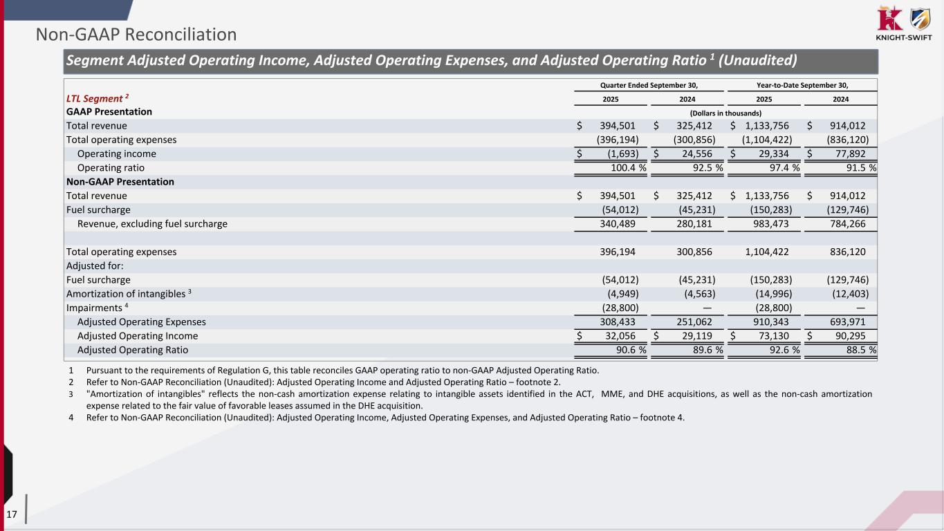 16 Segment Adjusted Operating Income, Adjusted Operating Expenses, and Adjusted Operating Ratio 1 (Unaudited) Quarter Ended September 30, Year-to-Date September 30, Truckload Segment 2025 2024 2025 2024 GAAP Presentation (Dollars in thousands) Total revenue $ 1,236,634 $ 1,258,156 $ 3,643,220 $ 3,785,408 Total operating expenses (1,200,733) (1,212,800) (3,517,299) (3,693,422) Operating income $ 35,901 $ 45,356 $ 125,921 $ 91,986 Operating ratio 97.1 % 96.4 % 96.5 % 97.6 % Non-GAAP Presentation Total revenue $ 1,236,634 $ 1,258,156 $ 3,643,220 $ 3,785,408 Fuel surcharge (152,156) (150,552) (437,023) (480,643) Intersegment transactions (115) (143) (451) (463) Revenue, excluding fuel surcharge and intersegment transactions 1,084,363 1,107,461 3,205,746 3,304,302 Total operating expenses 1,200,733 1,212,800 3,517,299 3,693,422 Adjusted for: Fuel surcharge (152,156) (150,552) (437,023) (480,643) Intersegment transactions (115) (143) (451) (463) Amortization of intangibles 2 (1,775) (1,775) (5,325) (5,325) Impairments 3 (3,551) (1,008) (14,163) (9,662) Legal accruals 4 — (366) (82) (336) Severance 5 — — (625) (1,466) Adjusted Operating Expenses 1,043,136 1,058,956 3,059,630 3,195,527 Adjusted Operating Income $ 41,227 $ 48,505 $ 146,116 $ 108,775 Adjusted Operating Ratio 96.2 % 95.6 % 95.4 % 96.7 % 1 Pursuant to the requirements of Regulation G, this table reconciles GAAP operating ratio to non-GAAP Adjusted Operating Ratio. 2 "Amortization of intangibles" reflects the non-cash amortization expense relating to intangible assets identified in historical Knight acquisitions and the U.S. Xpress acquisition. 3 Refer to Non-GAAP Reconciliation (Unaudited): Adjusted Operating Income, Adjusted Operating Expenses, and Adjusted Operating Ratio – footnote 4. 4 Refer to Non-GAAP Reconciliation (Unaudited): Adjusted Operating Income, Adjusted Operating Expenses, and Adjusted Operating Ratio – footnote 5. 5 Refer to Non-GAAP Reconciliation (Unaudited): Adjusted Operating Income, Adjusted Operating Expenses, and Adjusted Operating Ratio – footnote 7. Non-GAAP Reconciliation