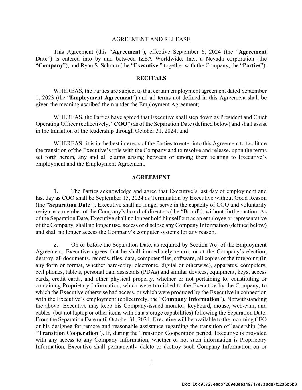1 AGREEMENT AND RELEASE This Agreement (this “Agreement”), effective September 6, 2024 (the “Agreement Date”) is entered into by and between IZEA Worldwide, Inc., a Nevada corporation (the “Company”), and Ryan S. Schram (the “Executive,” together with the Company, the “Parties”). RECITALS WHEREAS, the Parties are subject to that certain employment agreement dated September 1, 2023 (the “Employment Agreement”) and all terms not defined in this Agreement shall be given the meaning ascribed them under the Employment Agreement; WHEREAS, the Parties have agreed that Executive shall step down as President and Chief Operating Officer (collectively, “COO”) as of the Separation Date (defined below) and shall assist in the transition of the leadership through October 31, 2024; and WHEREAS, it is in the best interests of the Parties to enter into this Agreement to facilitate the transition of the Executive’s role with the Company and to resolve and release, upon the terms set forth herein, any and all claims arising between or among them relating to Executive’s employment and the Employment Agreement. AGREEMENT 1. The Parties acknowledge and agree that Executive’s last day of employment and last day as COO shall be September 15, 2024 as Termination by Executive without Good Reason (the “Separation Date”). Executive shall no longer serve in the capacity of COO and voluntarily resign as a member of the Company’s board of directors (the “Board”), without further action. As of the Separation Date, Executive shall no longer hold himself out as an employee or representative of the Company, shall no longer use, access or disclose any Company Information (defined below) and shall no longer access the Company’s computer systems for any reason. 2. On or before the Separation Date, as required by Section 7(c) of the Employment Agreement, Executive agrees that he shall immediately return, or at the Company’s election, destroy, all documents, records, files, data, computer files, software, all copies of the foregoing (in any form or format, whether hard-copy, electronic, digital or otherwise), apparatus, computers, cell phones, tablets, personal data assistants (PDAs) and similar devices, equipment, keys, access cards, credit cards, and other physical property, whether or not pertaining to, constituting or containing Proprietary Information, which were furnished to the Executive by the Company, to which the Executive otherwise had access, or which were produced by the Executive in connection with the Executive’s employment (collectively, the “Company Information”). Notwithstanding the above, Executive may keep his Company-issued monitor, keyboard, mouse, web-cam, and cables (but not laptop or other items with data storage capabilities) following the Separation Date. From the Separation Date until October 31, 2024, Executive will be available to the incoming CEO or his designee for remote and reasonable assistance regarding the transition of leadership (the “Transition Cooperation”). If, during the Transition Cooperation period, Executive is provided with any access to any Company Information, whether or not such information is Proprietary Information, Executive shall permanently delete or destroy such Company Information on or Doc ID: c93727eadb7289e8eea49717e7a8de7f52a6b5b3