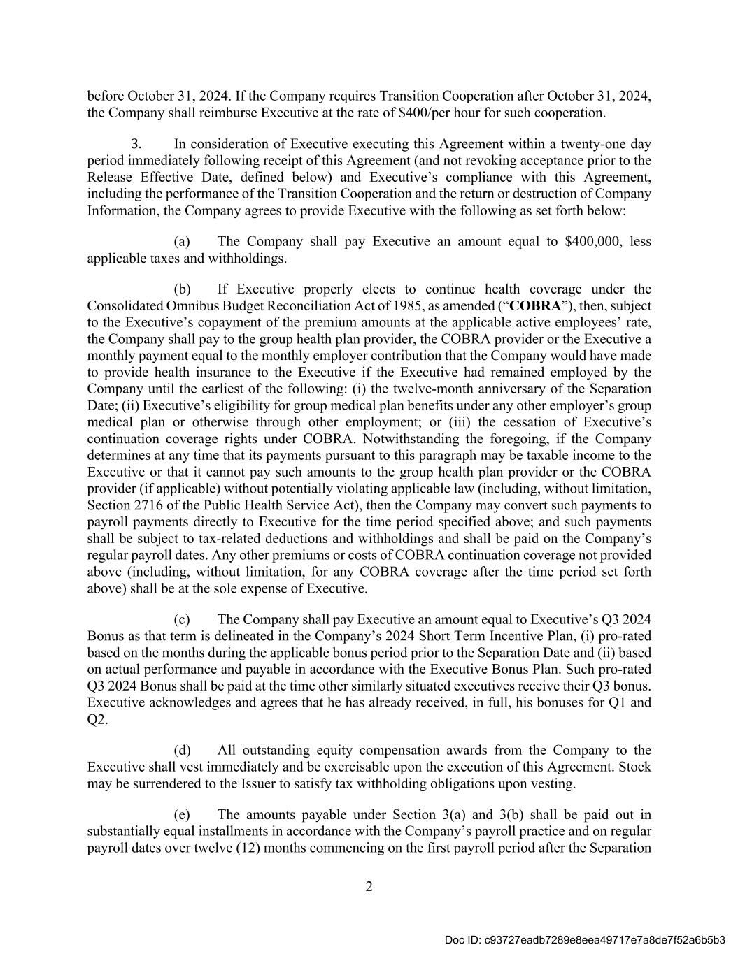 2 before October 31, 2024. If the Company requires Transition Cooperation after October 31, 2024, the Company shall reimburse Executive at the rate of $400/per hour for such cooperation. 3. In consideration of Executive executing this Agreement within a twenty-one day period immediately following receipt of this Agreement (and not revoking acceptance prior to the Release Effective Date, defined below) and Executive’s compliance with this Agreement, including the performance of the Transition Cooperation and the return or destruction of Company Information, the Company agrees to provide Executive with the following as set forth below: (a) The Company shall pay Executive an amount equal to $400,000, less applicable taxes and withholdings. (b) If Executive properly elects to continue health coverage under the Consolidated Omnibus Budget Reconciliation Act of 1985, as amended (“COBRA”), then, subject to the Executive’s copayment of the premium amounts at the applicable active employees’ rate, the Company shall pay to the group health plan provider, the COBRA provider or the Executive a monthly payment equal to the monthly employer contribution that the Company would have made to provide health insurance to the Executive if the Executive had remained employed by the Company until the earliest of the following: (i) the twelve-month anniversary of the Separation Date; (ii) Executive’s eligibility for group medical plan benefits under any other employer’s group medical plan or otherwise through other employment; or (iii) the cessation of Executive’s continuation coverage rights under COBRA. Notwithstanding the foregoing, if the Company determines at any time that its payments pursuant to this paragraph may be taxable income to the Executive or that it cannot pay such amounts to the group health plan provider or the COBRA provider (if applicable) without potentially violating applicable law (including, without limitation, Section 2716 of the Public Health Service Act), then the Company may convert such payments to payroll payments directly to Executive for the time period specified above; and such payments shall be subject to tax-related deductions and withholdings and shall be paid on the Company’s regular payroll dates. Any other premiums or costs of COBRA continuation coverage not provided above (including, without limitation, for any COBRA coverage after the time period set forth above) shall be at the sole expense of Executive. (c) The Company shall pay Executive an amount equal to Executive’s Q3 2024 Bonus as that term is delineated in the Company’s 2024 Short Term Incentive Plan, (i) pro-rated based on the months during the applicable bonus period prior to the Separation Date and (ii) based on actual performance and payable in accordance with the Executive Bonus Plan. Such pro-rated Q3 2024 Bonus shall be paid at the time other similarly situated executives receive their Q3 bonus. Executive acknowledges and agrees that he has already received, in full, his bonuses for Q1 and Q2. (d) All outstanding equity compensation awards from the Company to the Executive shall vest immediately and be exercisable upon the execution of this Agreement. Stock may be surrendered to the Issuer to satisfy tax withholding obligations upon vesting. (e) The amounts payable under Section 3(a) and 3(b) shall be paid out in substantially equal installments in accordance with the Company’s payroll practice and on regular payroll dates over twelve (12) months commencing on the first payroll period after the Separation Doc ID: c93727eadb7289e8eea49717e7a8de7f52a6b5b3