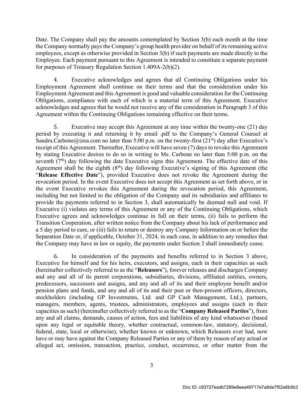3 Date. The Company shall pay the amounts contemplated by Section 3(b) each month at the time the Company normally pays the Company’s group health provider on behalf of its remaining active employees, except as otherwise provided in Section 3(b) if such payments are made directly to the Employee. Each payment pursuant to this Agreement is intended to constitute a separate payment for purposes of Treasury Regulation Section 1.409A-2(b)(2). 4. Executive acknowledges and agrees that all Continuing Obligations under his Employment Agreement shall continue on their terms and that the consideration under his Employment Agreement and this Agreement is good and valuable consideration for the Continuing Obligations, compliance with each of which is a material term of this Agreement. Executive acknowledges and agrees that he would not receive any of the consideration in Paragraph 3 of this Agreement within the Continuing Obligations remaining effective on their terms. 5. Executive may accept this Agreement at any time within the twenty-one (21) day period by executing it and returning it by email .pdf to the Company’s General Counsel at Sandra.Carbone@izea.com no later than 5:00 p.m. on the twenty-first (21st) day after Executive’s receipt of this Agreement. Thereafter, Executive will have seven (7) days to revoke this Agreement by stating Executive desires to do so in writing to Ms. Carbone no later than 5:00 p.m. on the seventh (7th) day following the date Executive signs this Agreement. The effective date of this Agreement shall be the eighth (8th) day following Executive’s signing of this Agreement (the “Release Effective Date”), provided Executive does not revoke the Agreement during the revocation period. In the event Executive does not accept this Agreement as set forth above, or in the event Executive revokes this Agreement during the revocation period, this Agreement, including but not limited to the obligation of the Company and its subsidiaries and affiliates to provide the payments referred to in Section 3, shall automatically be deemed null and void. If Executive (i) violates any terms of this Agreement or any of the Continuing Obligations, which Executive agrees and acknowledges continue in full on their terms, (ii) fails to perform the Transition Cooperation, after written notice from the Company about his lack of performance and a 5 day period to cure, or (iii) fails to return or destroy any Company Information on or before the Separation Date or, if applicable, October 31, 2024, in each case, in addition to any remedies that the Company may have in law or equity, the payments under Section 3 shall immediately cease. 6. In consideration of the payments and benefits referred to in Section 3 above, Executive for himself and for his heirs, executors, and assigns, each in their capacities as such (hereinafter collectively referred to as the “Releasors”), forever releases and discharges Company and any and all of its parent corporations, subsidiaries, divisions, affiliated entities, owners, predecessors, successors and assigns, and any and all of its and their employee benefit and/or pension plans and funds, and any and all of its and their past or then-present officers, directors, stockholders (including GP Investments, Ltd. and GP Cash Management, Ltd.), partners, managers, members, agents, trustees, administrators, employees and assigns (each in their capacities as such) (hereinafter collectively referred to as the “Company Released Parties”), from any and all claims, demands, causes of action, fees and liabilities of any kind whatsoever (based upon any legal or equitable theory, whether contractual, common-law, statutory, decisional, federal, state, local or otherwise), whether known or unknown, which Releasors ever had, now have or may have against the Company Released Parties or any of them by reason of any actual or alleged act, omission, transaction, practice, conduct, occurrence, or other matter from the Doc ID: c93727eadb7289e8eea49717e7a8de7f52a6b5b3