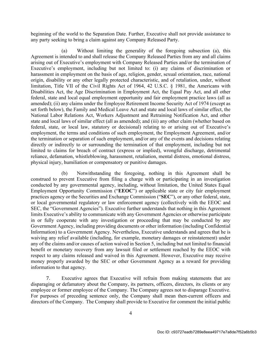 4 beginning of the world to the Separation Date. Further, Executive shall not provide assistance to any party seeking to bring a claim against any Company Released Party. (a) Without limiting the generality of the foregoing subsection (a), this Agreement is intended to and shall release the Company Released Parties from any and all claims arising out of Executive’s employment with Company Released Parties and/or the termination of Executive’s employment, including but not limited to: (i) any claims of discrimination or harassment in employment on the basis of age, religion, gender, sexual orientation, race, national origin, disability or any other legally protected characteristic, and of retaliation, under, without limitation, Title VII of the Civil Rights Act of 1964, 42 U.S.C. § 1981, the Americans with Disabilities Act, the Age Discrimination in Employment Act, the Equal Pay Act, and all other federal, state and local equal employment opportunity and fair employment practice laws (all as amended); (ii) any claims under the Employee Retirement Income Security Act of 1974 (except as set forth below), the Family and Medical Leave Act and state and local laws of similar effect, the National Labor Relations Act, Workers Adjustment and Retraining Notification Act, and other state and local laws of similar effect (all as amended); and (iii) any other claim (whether based on federal, state, or local law, statutory or decisional) relating to or arising out of Executive’s employment, the terms and conditions of such employment, the Employment Agreement, and/or the termination or separation of such employment, and/or any of the events and decisions relating directly or indirectly to or surrounding the termination of that employment, including but not limited to claims for breach of contract (express or implied), wrongful discharge, detrimental reliance, defamation, whistleblowing, harassment, retaliation, mental distress, emotional distress, physical injury, humiliation or compensatory or punitive damages. (b) Notwithstanding the foregoing, nothing in this Agreement shall be construed to prevent Executive from filing a charge with or participating in an investigation conducted by any governmental agency, including, without limitation, the United States Equal Employment Opportunity Commission (“EEOC”) or applicable state or city fair employment practices agency or the Securities and Exchange Commission (“SEC”), or any other federal, state, or local governmental regulatory or law enforcement agency (collectively with the EEOC and SEC, the “Government Agencies”). Executive further understands that nothing in this Agreement limits Executive’s ability to communicate with any Government Agencies or otherwise participate in or fully cooperate with any investigation or proceeding that may be conducted by any Government Agency, including providing documents or other information (including Confidential Information) to a Government Agency. Nevertheless, Executive understands and agrees that he is waiving any relief available (including, for example, monetary damages or reinstatement) under any of the claims and/or causes of action waived in Section 5, including but not limited to financial benefit or monetary recovery from any lawsuit filed or settlement reached by the EEOC with respect to any claims released and waived in this Agreement. However, Executive may receive money properly awarded by the SEC or other Government Agency as a reward for providing information to that agency. 7. Executive agrees that Executive will refrain from making statements that are disparaging or defamatory about the Company, its partners, officers, directors, its clients or any employee or former employee of the Company. The Company agrees not to disparage Executive. For purposes of preceding sentence only, the Company shall mean then-current officers and directors of the Company. The Company shall provide to Executive for comment the initial public Doc ID: c93727eadb7289e8eea49717e7a8de7f52a6b5b3