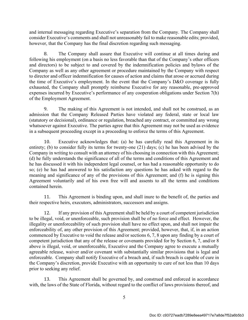 5 and internal messaging regarding Executive’s separation from the Company. The Company shall consider Executive’s comments and shall not unreasonably fail to make reasonable edits; provided, however, that the Company has the final discretion regarding such messaging. 8. The Company shall assure that Executive will continue at all times during and following his employment (on a basis no less favorable than that of the Company’s other officers and directors) to be subject to and covered by the indemnification policies and bylaws of the Company as well as any other agreement or procedure maintained by the Company with respect to director and officer indemnification for causes of action and claims that arose or accrued during the time of Executive’s employment. In the event that the Company’s D&O coverage is fully exhausted, the Company shall promptly reimburse Executive for any reasonable, pre-approved expenses incurred by Executive’s performance of any cooperation obligations under Section 7(h) of the Employment Agreement. 9. The making of this Agreement is not intended, and shall not be construed, as an admission that the Company Released Parties have violated any federal, state or local law (statutory or decisional), ordinance or regulation, breached any contract, or committed any wrong whatsoever against Executive. The parties agree that this Agreement may not be used as evidence in a subsequent proceeding except in a proceeding to enforce the terms of this Agreement. 10. Executive acknowledges that: (a) he has carefully read this Agreement in its entirety; (b) to consider fully its terms for twenty-one (21) days; (c) he has been advised by the Company in writing to consult with an attorney of his choosing in connection with this Agreement; (d) he fully understands the significance of all of the terms and conditions of this Agreement and he has discussed it with his independent legal counsel, or has had a reasonable opportunity to do so; (e) he has had answered to his satisfaction any questions he has asked with regard to the meaning and significance of any of the provisions of this Agreement; and (f) he is signing this Agreement voluntarily and of his own free will and assents to all the terms and conditions contained herein. 11. This Agreement is binding upon, and shall inure to the benefit of, the parties and their respective heirs, executors, administrators, successors and assigns. 12. If any provision of this Agreement shall be held by a court of competent jurisdiction to be illegal, void, or unenforceable, such provision shall be of no force and effect. However, the illegality or unenforceability of such provision shall have no effect upon, and shall not impair the enforceability of, any other provision of this Agreement; provided, however, that, if, in an action commenced by Executive to void the release and/or sections 6, 7, 8 upon any finding by a court of competent jurisdiction that any of the release or covenants provided for by Section 6, 7, and/or 8 above is illegal, void, or unenforceable, Executive and the Company agree to execute a mutually agreeable release, waiver and/or covenant with substantially similar provisions that is legal and enforceable. Company shall notify Executive of a breach and, if such breach is capable of cure in the Company’s discretion, provide Executive with an opportunity to cure of not less than 10 days prior to seeking any relief. 13. This Agreement shall be governed by, and construed and enforced in accordance with, the laws of the State of Florida, without regard to the conflict of laws provisions thereof, and Doc ID: c93727eadb7289e8eea49717e7a8de7f52a6b5b3