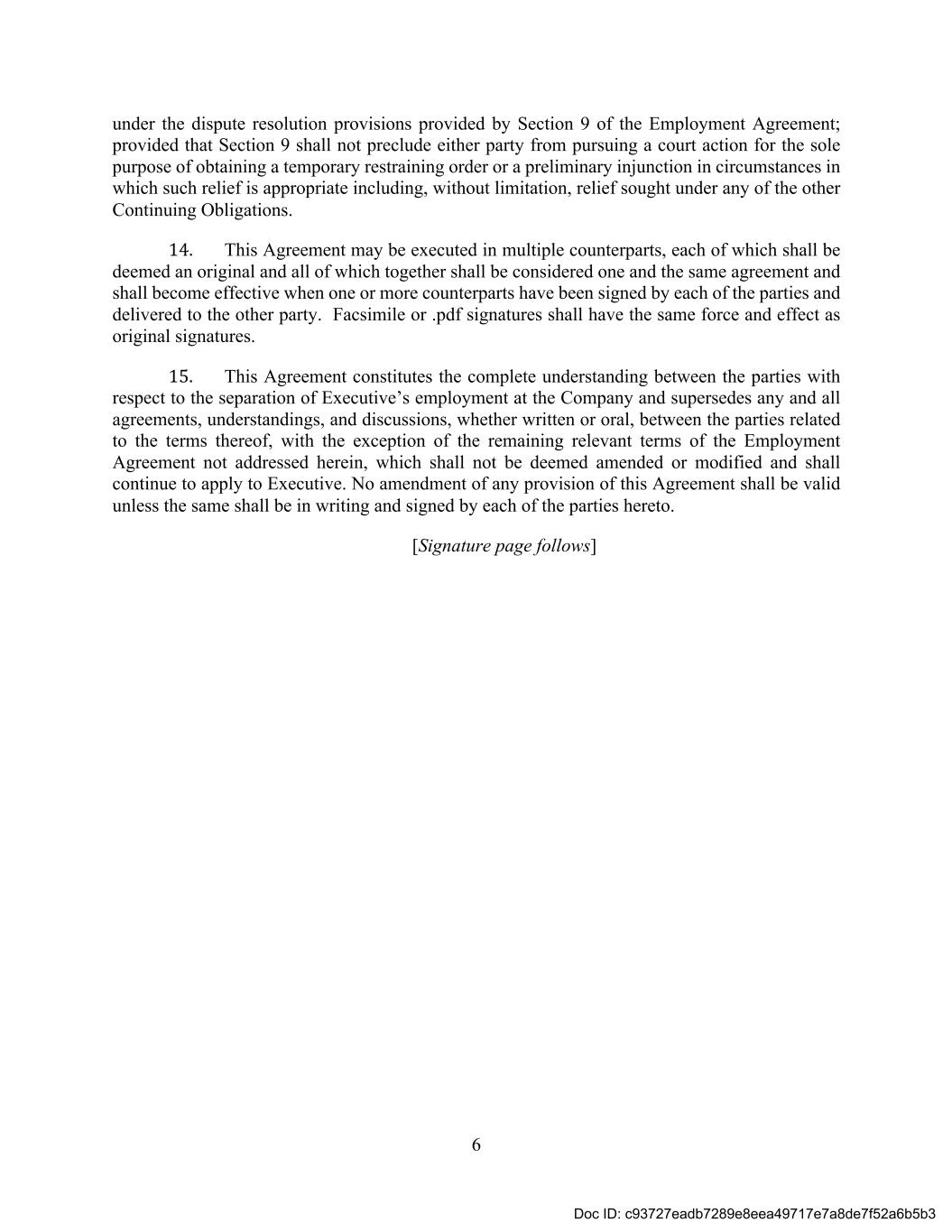 6 under the dispute resolution provisions provided by Section 9 of the Employment Agreement; provided that Section 9 shall not preclude either party from pursuing a court action for the sole purpose of obtaining a temporary restraining order or a preliminary injunction in circumstances in which such relief is appropriate including, without limitation, relief sought under any of the other Continuing Obligations. 14. This Agreement may be executed in multiple counterparts, each of which shall be deemed an original and all of which together shall be considered one and the same agreement and shall become effective when one or more counterparts have been signed by each of the parties and delivered to the other party. Facsimile or .pdf signatures shall have the same force and effect as original signatures. 15. This Agreement constitutes the complete understanding between the parties with respect to the separation of Executive’s employment at the Company and supersedes any and all agreements, understandings, and discussions, whether written or oral, between the parties related to the terms thereof, with the exception of the remaining relevant terms of the Employment Agreement not addressed herein, which shall not be deemed amended or modified and shall continue to apply to Executive. No amendment of any provision of this Agreement shall be valid unless the same shall be in writing and signed by each of the parties hereto. [Signature page follows] Doc ID: c93727eadb7289e8eea49717e7a8de7f52a6b5b3
