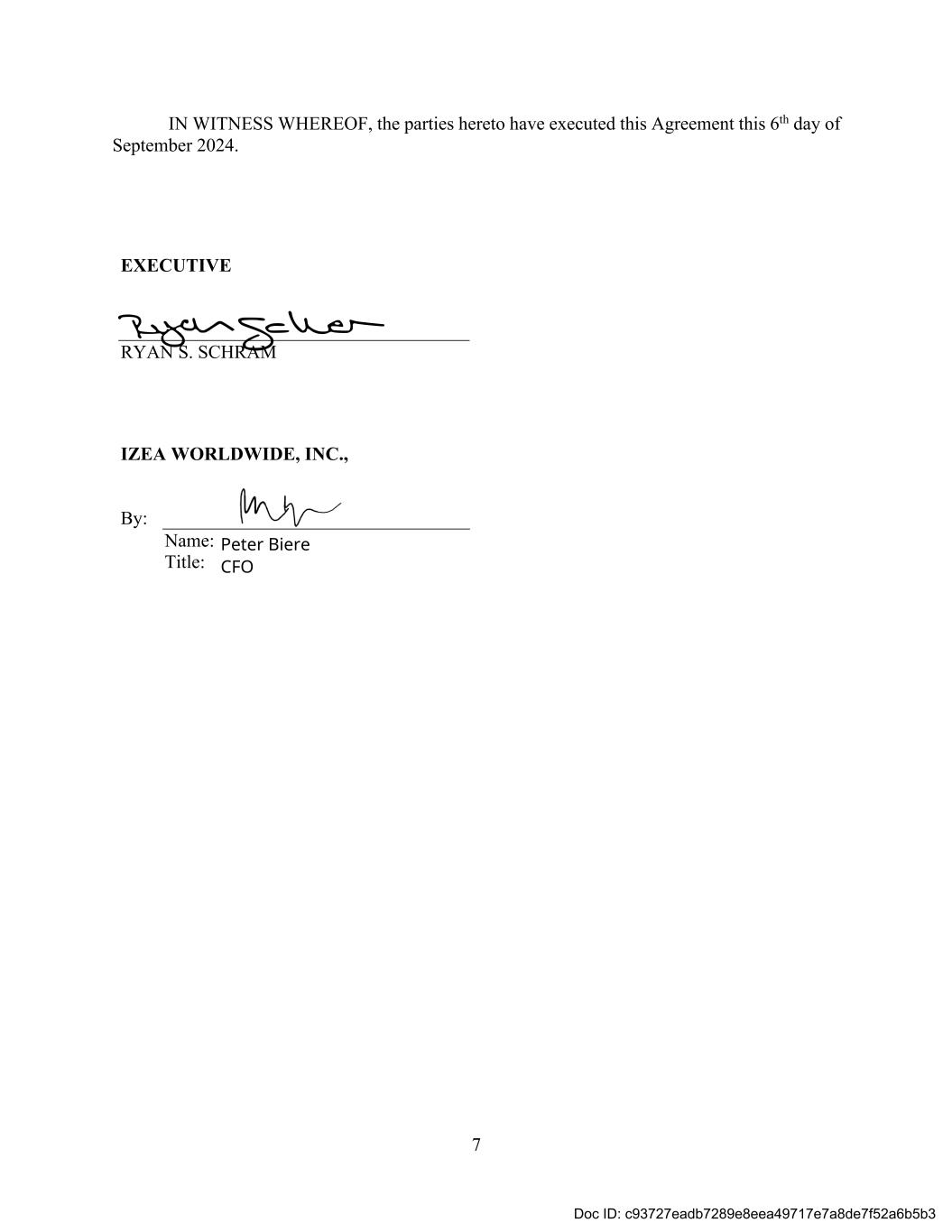 7 IN WITNESS WHEREOF, the parties hereto have executed this Agreement this 6th day of September 2024. EXECUTIVE RYAN S. SCHRAM IZEA WORLDWIDE, INC., By: Name: Title: Peter Biere CFO Doc ID: c93727eadb7289e8eea49717e7a8de7f52a6b5b3