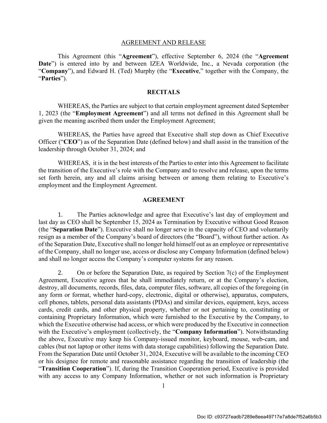 1 AGREEMENT AND RELEASE This Agreement (this “Agreement”), effective September 6, 2024 (the “Agreement Date”) is entered into by and between IZEA Worldwide, Inc., a Nevada corporation (the “Company”), and Edward H. (Ted) Murphy (the “Executive,” together with the Company, the “Parties”). RECITALS WHEREAS, the Parties are subject to that certain employment agreement dated September 1, 2023 (the “Employment Agreement”) and all terms not defined in this Agreement shall be given the meaning ascribed them under the Employment Agreement; WHEREAS, the Parties have agreed that Executive shall step down as Chief Executive Officer (“CEO”) as of the Separation Date (defined below) and shall assist in the transition of the leadership through October 31, 2024; and WHEREAS, it is in the best interests of the Parties to enter into this Agreement to facilitate the transition of the Executive’s role with the Company and to resolve and release, upon the terms set forth herein, any and all claims arising between or among them relating to Executive’s employment and the Employment Agreement. AGREEMENT 1. The Parties acknowledge and agree that Executive’s last day of employment and last day as CEO shall be September 15, 2024 as Termination by Executive without Good Reason (the “Separation Date”). Executive shall no longer serve in the capacity of CEO and voluntarily resign as a member of the Company’s board of directors (the “Board”), without further action. As of the Separation Date, Executive shall no longer hold himself out as an employee or representative of the Company, shall no longer use, access or disclose any Company Information (defined below) and shall no longer access the Company’s computer systems for any reason. 2. On or before the Separation Date, as required by Section 7(c) of the Employment Agreement, Executive agrees that he shall immediately return, or at the Company’s election, destroy, all documents, records, files, data, computer files, software, all copies of the foregoing (in any form or format, whether hard-copy, electronic, digital or otherwise), apparatus, computers, cell phones, tablets, personal data assistants (PDAs) and similar devices, equipment, keys, access cards, credit cards, and other physical property, whether or not pertaining to, constituting or containing Proprietary Information, which were furnished to the Executive by the Company, to which the Executive otherwise had access, or which were produced by the Executive in connection with the Executive’s employment (collectively, the “Company Information”). Notwithstanding the above, Executive may keep his Company-issued monitor, keyboard, mouse, web-cam, and cables (but not laptop or other items with data storage capabilities) following the Separation Date. From the Separation Date until October 31, 2024, Executive will be available to the incoming CEO or his designee for remote and reasonable assistance regarding the transition of leadership (the “Transition Cooperation”). If, during the Transition Cooperation period, Executive is provided with any access to any Company Information, whether or not such information is Proprietary Doc ID: c93727eadb7289e8eea49717e7a8de7f52a6b5b3