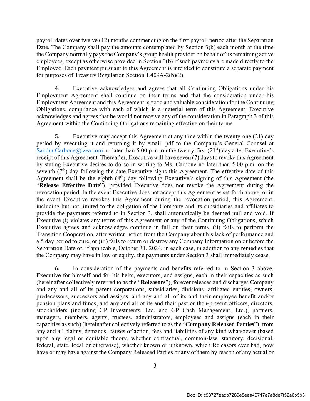 3 payroll dates over twelve (12) months commencing on the first payroll period after the Separation Date. The Company shall pay the amounts contemplated by Section 3(b) each month at the time the Company normally pays the Company’s group health provider on behalf of its remaining active employees, except as otherwise provided in Section 3(b) if such payments are made directly to the Employee. Each payment pursuant to this Agreement is intended to constitute a separate payment for purposes of Treasury Regulation Section 1.409A-2(b)(2). 4. Executive acknowledges and agrees that all Continuing Obligations under his Employment Agreement shall continue on their terms and that the consideration under his Employment Agreement and this Agreement is good and valuable consideration for the Continuing Obligations, compliance with each of which is a material term of this Agreement. Executive acknowledges and agrees that he would not receive any of the consideration in Paragraph 3 of this Agreement within the Continuing Obligations remaining effective on their terms. 5. Executive may accept this Agreement at any time within the twenty-one (21) day period by executing it and returning it by email .pdf to the Company’s General Counsel at Sandra.Carbone@izea.com no later than 5:00 p.m. on the twenty-first (21st) day after Executive’s receipt of this Agreement. Thereafter, Executive will have seven (7) days to revoke this Agreement by stating Executive desires to do so in writing to Ms. Carbone no later than 5:00 p.m. on the seventh (7th) day following the date Executive signs this Agreement. The effective date of this Agreement shall be the eighth (8th) day following Executive’s signing of this Agreement (the “Release Effective Date”), provided Executive does not revoke the Agreement during the revocation period. In the event Executive does not accept this Agreement as set forth above, or in the event Executive revokes this Agreement during the revocation period, this Agreement, including but not limited to the obligation of the Company and its subsidiaries and affiliates to provide the payments referred to in Section 3, shall automatically be deemed null and void. If Executive (i) violates any terms of this Agreement or any of the Continuing Obligations, which Executive agrees and acknowledges continue in full on their terms, (ii) fails to perform the Transition Cooperation, after written notice from the Company about his lack of performance and a 5 day period to cure, or (iii) fails to return or destroy any Company Information on or before the Separation Date or, if applicable, October 31, 2024, in each case, in addition to any remedies that the Company may have in law or equity, the payments under Section 3 shall immediately cease. 6. In consideration of the payments and benefits referred to in Section 3 above, Executive for himself and for his heirs, executors, and assigns, each in their capacities as such (hereinafter collectively referred to as the “Releasors”), forever releases and discharges Company and any and all of its parent corporations, subsidiaries, divisions, affiliated entities, owners, predecessors, successors and assigns, and any and all of its and their employee benefit and/or pension plans and funds, and any and all of its and their past or then-present officers, directors, stockholders (including GP Investments, Ltd. and GP Cash Management, Ltd.), partners, managers, members, agents, trustees, administrators, employees and assigns (each in their capacities as such) (hereinafter collectively referred to as the “Company Released Parties”), from any and all claims, demands, causes of action, fees and liabilities of any kind whatsoever (based upon any legal or equitable theory, whether contractual, common-law, statutory, decisional, federal, state, local or otherwise), whether known or unknown, which Releasors ever had, now have or may have against the Company Released Parties or any of them by reason of any actual or Doc ID: c93727eadb7289e8eea49717e7a8de7f52a6b5b3