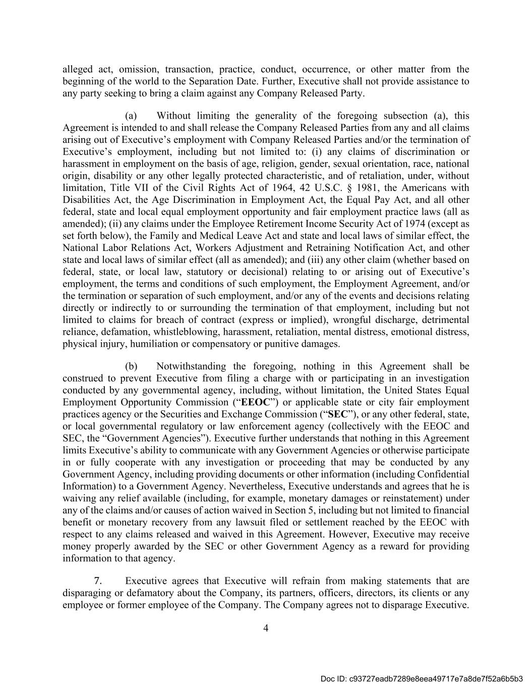 4 alleged act, omission, transaction, practice, conduct, occurrence, or other matter from the beginning of the world to the Separation Date. Further, Executive shall not provide assistance to any party seeking to bring a claim against any Company Released Party. (a) Without limiting the generality of the foregoing subsection (a), this Agreement is intended to and shall release the Company Released Parties from any and all claims arising out of Executive’s employment with Company Released Parties and/or the termination of Executive’s employment, including but not limited to: (i) any claims of discrimination or harassment in employment on the basis of age, religion, gender, sexual orientation, race, national origin, disability or any other legally protected characteristic, and of retaliation, under, without limitation, Title VII of the Civil Rights Act of 1964, 42 U.S.C. § 1981, the Americans with Disabilities Act, the Age Discrimination in Employment Act, the Equal Pay Act, and all other federal, state and local equal employment opportunity and fair employment practice laws (all as amended); (ii) any claims under the Employee Retirement Income Security Act of 1974 (except as set forth below), the Family and Medical Leave Act and state and local laws of similar effect, the National Labor Relations Act, Workers Adjustment and Retraining Notification Act, and other state and local laws of similar effect (all as amended); and (iii) any other claim (whether based on federal, state, or local law, statutory or decisional) relating to or arising out of Executive’s employment, the terms and conditions of such employment, the Employment Agreement, and/or the termination or separation of such employment, and/or any of the events and decisions relating directly or indirectly to or surrounding the termination of that employment, including but not limited to claims for breach of contract (express or implied), wrongful discharge, detrimental reliance, defamation, whistleblowing, harassment, retaliation, mental distress, emotional distress, physical injury, humiliation or compensatory or punitive damages. (b) Notwithstanding the foregoing, nothing in this Agreement shall be construed to prevent Executive from filing a charge with or participating in an investigation conducted by any governmental agency, including, without limitation, the United States Equal Employment Opportunity Commission (“EEOC”) or applicable state or city fair employment practices agency or the Securities and Exchange Commission (“SEC”), or any other federal, state, or local governmental regulatory or law enforcement agency (collectively with the EEOC and SEC, the “Government Agencies”). Executive further understands that nothing in this Agreement limits Executive’s ability to communicate with any Government Agencies or otherwise participate in or fully cooperate with any investigation or proceeding that may be conducted by any Government Agency, including providing documents or other information (including Confidential Information) to a Government Agency. Nevertheless, Executive understands and agrees that he is waiving any relief available (including, for example, monetary damages or reinstatement) under any of the claims and/or causes of action waived in Section 5, including but not limited to financial benefit or monetary recovery from any lawsuit filed or settlement reached by the EEOC with respect to any claims released and waived in this Agreement. However, Executive may receive money properly awarded by the SEC or other Government Agency as a reward for providing information to that agency. 7. Executive agrees that Executive will refrain from making statements that are disparaging or defamatory about the Company, its partners, officers, directors, its clients or any employee or former employee of the Company. The Company agrees not to disparage Executive. Doc ID: c93727eadb7289e8eea49717e7a8de7f52a6b5b3