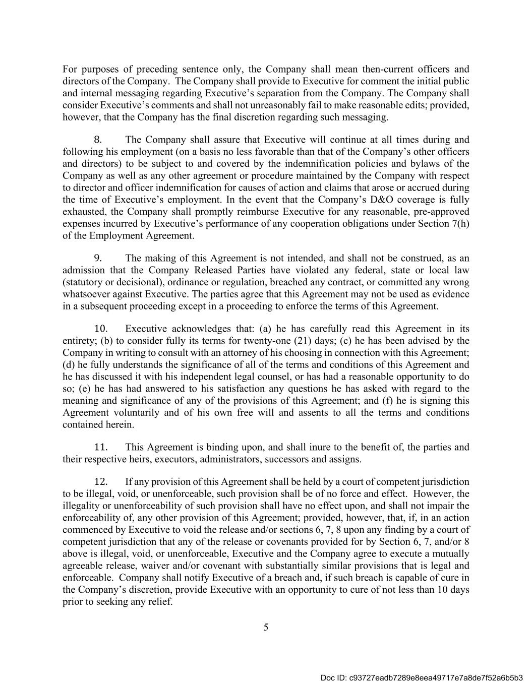5 For purposes of preceding sentence only, the Company shall mean then-current officers and directors of the Company. The Company shall provide to Executive for comment the initial public and internal messaging regarding Executive’s separation from the Company. The Company shall consider Executive’s comments and shall not unreasonably fail to make reasonable edits; provided, however, that the Company has the final discretion regarding such messaging. 8. The Company shall assure that Executive will continue at all times during and following his employment (on a basis no less favorable than that of the Company’s other officers and directors) to be subject to and covered by the indemnification policies and bylaws of the Company as well as any other agreement or procedure maintained by the Company with respect to director and officer indemnification for causes of action and claims that arose or accrued during the time of Executive’s employment. In the event that the Company’s D&O coverage is fully exhausted, the Company shall promptly reimburse Executive for any reasonable, pre-approved expenses incurred by Executive’s performance of any cooperation obligations under Section 7(h) of the Employment Agreement. 9. The making of this Agreement is not intended, and shall not be construed, as an admission that the Company Released Parties have violated any federal, state or local law (statutory or decisional), ordinance or regulation, breached any contract, or committed any wrong whatsoever against Executive. The parties agree that this Agreement may not be used as evidence in a subsequent proceeding except in a proceeding to enforce the terms of this Agreement. 10. Executive acknowledges that: (a) he has carefully read this Agreement in its entirety; (b) to consider fully its terms for twenty-one (21) days; (c) he has been advised by the Company in writing to consult with an attorney of his choosing in connection with this Agreement; (d) he fully understands the significance of all of the terms and conditions of this Agreement and he has discussed it with his independent legal counsel, or has had a reasonable opportunity to do so; (e) he has had answered to his satisfaction any questions he has asked with regard to the meaning and significance of any of the provisions of this Agreement; and (f) he is signing this Agreement voluntarily and of his own free will and assents to all the terms and conditions contained herein. 11. This Agreement is binding upon, and shall inure to the benefit of, the parties and their respective heirs, executors, administrators, successors and assigns. 12. If any provision of this Agreement shall be held by a court of competent jurisdiction to be illegal, void, or unenforceable, such provision shall be of no force and effect. However, the illegality or unenforceability of such provision shall have no effect upon, and shall not impair the enforceability of, any other provision of this Agreement; provided, however, that, if, in an action commenced by Executive to void the release and/or sections 6, 7, 8 upon any finding by a court of competent jurisdiction that any of the release or covenants provided for by Section 6, 7, and/or 8 above is illegal, void, or unenforceable, Executive and the Company agree to execute a mutually agreeable release, waiver and/or covenant with substantially similar provisions that is legal and enforceable. Company shall notify Executive of a breach and, if such breach is capable of cure in the Company’s discretion, provide Executive with an opportunity to cure of not less than 10 days prior to seeking any relief. Doc ID: c93727eadb7289e8eea49717e7a8de7f52a6b5b3