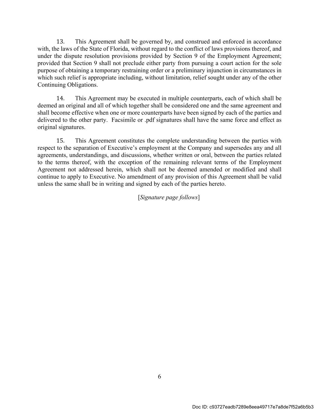 6 13. This Agreement shall be governed by, and construed and enforced in accordance with, the laws of the State of Florida, without regard to the conflict of laws provisions thereof, and under the dispute resolution provisions provided by Section 9 of the Employment Agreement; provided that Section 9 shall not preclude either party from pursuing a court action for the sole purpose of obtaining a temporary restraining order or a preliminary injunction in circumstances in which such relief is appropriate including, without limitation, relief sought under any of the other Continuing Obligations. 14. This Agreement may be executed in multiple counterparts, each of which shall be deemed an original and all of which together shall be considered one and the same agreement and shall become effective when one or more counterparts have been signed by each of the parties and delivered to the other party. Facsimile or .pdf signatures shall have the same force and effect as original signatures. 15. This Agreement constitutes the complete understanding between the parties with respect to the separation of Executive’s employment at the Company and supersedes any and all agreements, understandings, and discussions, whether written or oral, between the parties related to the terms thereof, with the exception of the remaining relevant terms of the Employment Agreement not addressed herein, which shall not be deemed amended or modified and shall continue to apply to Executive. No amendment of any provision of this Agreement shall be valid unless the same shall be in writing and signed by each of the parties hereto. [Signature page follows] Doc ID: c93727eadb7289e8eea49717e7a8de7f52a6b5b3