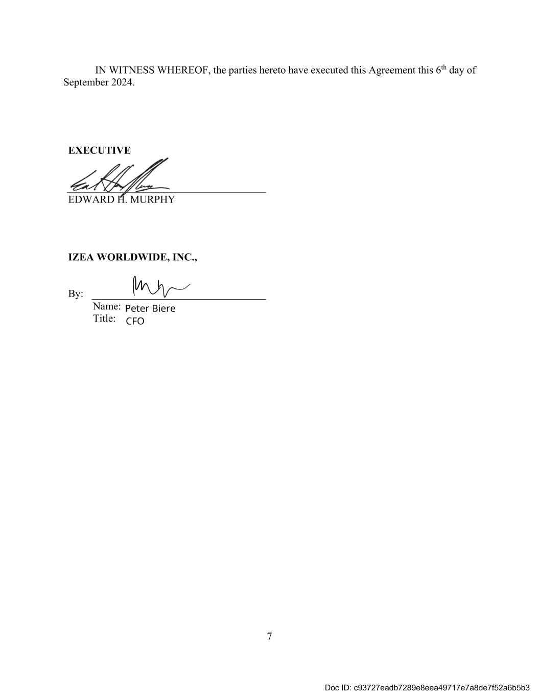 7 IN WITNESS WHEREOF, the parties hereto have executed this Agreement this 6th day of September 2024. EXECUTIVE EDWARD H. MURPHY IZEA WORLDWIDE, INC., By: Name: Title: Peter Biere CFO Doc ID: c93727eadb7289e8eea49717e7a8de7f52a6b5b3