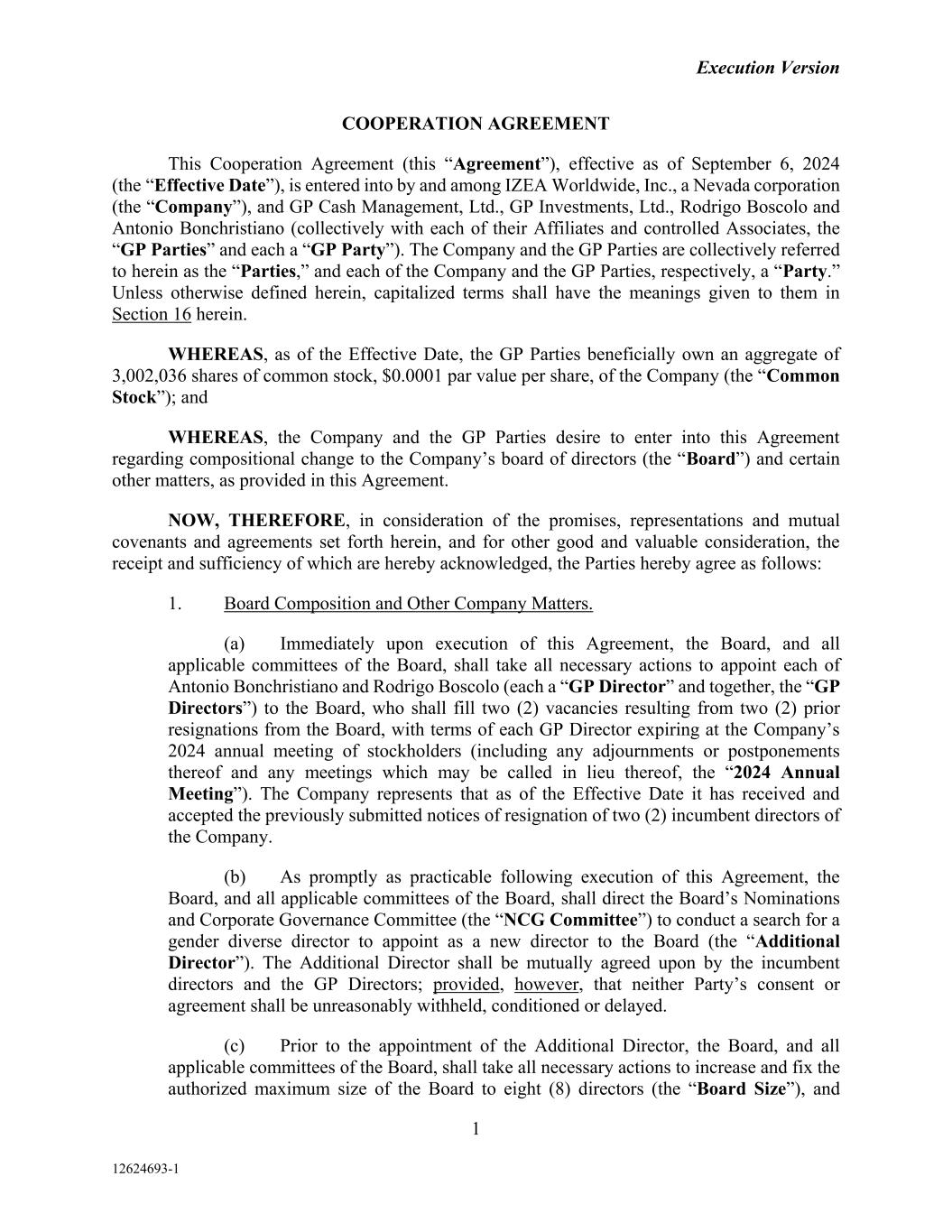 Execution Version 1 12624693-1 COOPERATION AGREEMENT This Cooperation Agreement (this “Agreement”), effective as of September 6, 2024 (the “Effective Date”), is entered into by and among IZEA Worldwide, Inc., a Nevada corporation (the “Company”), and GP Cash Management, Ltd., GP Investments, Ltd., Rodrigo Boscolo and Antonio Bonchristiano (collectively with each of their Affiliates and controlled Associates, the “GP Parties” and each a “GP Party”). The Company and the GP Parties are collectively referred to herein as the “Parties,” and each of the Company and the GP Parties, respectively, a “Party.” Unless otherwise defined herein, capitalized terms shall have the meanings given to them in Section 16 herein. WHEREAS, as of the Effective Date, the GP Parties beneficially own an aggregate of 3,002,036 shares of common stock, $0.0001 par value per share, of the Company (the “Common Stock”); and WHEREAS, the Company and the GP Parties desire to enter into this Agreement regarding compositional change to the Company’s board of directors (the “Board”) and certain other matters, as provided in this Agreement. NOW, THEREFORE, in consideration of the promises, representations and mutual covenants and agreements set forth herein, and for other good and valuable consideration, the receipt and sufficiency of which are hereby acknowledged, the Parties hereby agree as follows: 1. Board Composition and Other Company Matters. (a) Immediately upon execution of this Agreement, the Board, and all applicable committees of the Board, shall take all necessary actions to appoint each of Antonio Bonchristiano and Rodrigo Boscolo (each a “GP Director” and together, the “GP Directors”) to the Board, who shall fill two (2) vacancies resulting from two (2) prior resignations from the Board, with terms of each GP Director expiring at the Company’s 2024 annual meeting of stockholders (including any adjournments or postponements thereof and any meetings which may be called in lieu thereof, the “2024 Annual Meeting”). The Company represents that as of the Effective Date it has received and accepted the previously submitted notices of resignation of two (2) incumbent directors of the Company. (b) As promptly as practicable following execution of this Agreement, the Board, and all applicable committees of the Board, shall direct the Board’s Nominations and Corporate Governance Committee (the “NCG Committee”) to conduct a search for a gender diverse director to appoint as a new director to the Board (the “Additional Director”). The Additional Director shall be mutually agreed upon by the incumbent directors and the GP Directors; provided, however, that neither Party’s consent or agreement shall be unreasonably withheld, conditioned or delayed. (c) Prior to the appointment of the Additional Director, the Board, and all applicable committees of the Board, shall take all necessary actions to increase and fix the authorized maximum size of the Board to eight (8) directors (the “Board Size”), and