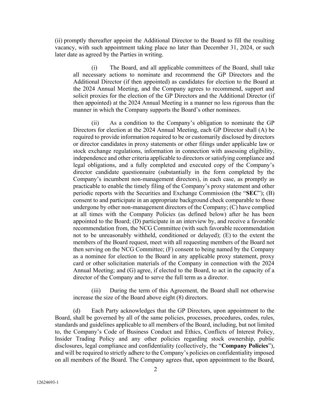 2 12624693-1 (ii) promptly thereafter appoint the Additional Director to the Board to fill the resulting vacancy, with such appointment taking place no later than December 31, 2024, or such later date as agreed by the Parties in writing. (i) The Board, and all applicable committees of the Board, shall take all necessary actions to nominate and recommend the GP Directors and the Additional Director (if then appointed) as candidates for election to the Board at the 2024 Annual Meeting, and the Company agrees to recommend, support and solicit proxies for the election of the GP Directors and the Additional Director (if then appointed) at the 2024 Annual Meeting in a manner no less rigorous than the manner in which the Company supports the Board’s other nominees. (ii) As a condition to the Company’s obligation to nominate the GP Directors for election at the 2024 Annual Meeting, each GP Director shall (A) be required to provide information required to be or customarily disclosed by directors or director candidates in proxy statements or other filings under applicable law or stock exchange regulations, information in connection with assessing eligibility, independence and other criteria applicable to directors or satisfying compliance and legal obligations, and a fully completed and executed copy of the Company’s director candidate questionnaire (substantially in the form completed by the Company’s incumbent non-management directors), in each case, as promptly as practicable to enable the timely filing of the Company’s proxy statement and other periodic reports with the Securities and Exchange Commission (the “SEC”); (B) consent to and participate in an appropriate background check comparable to those undergone by other non-management directors of the Company; (C) have complied at all times with the Company Policies (as defined below) after he has been appointed to the Board; (D) participate in an interview by, and receive a favorable recommendation from, the NCG Committee (with such favorable recommendation not to be unreasonably withheld, conditioned or delayed); (E) to the extent the members of the Board request, meet with all requesting members of the Board not then serving on the NCG Committee; (F) consent to being named by the Company as a nominee for election to the Board in any applicable proxy statement, proxy card or other solicitation materials of the Company in connection with the 2024 Annual Meeting; and (G) agree, if elected to the Board, to act in the capacity of a director of the Company and to serve the full term as a director. (iii) During the term of this Agreement, the Board shall not otherwise increase the size of the Board above eight (8) directors. (d) Each Party acknowledges that the GP Directors, upon appointment to the Board, shall be governed by all of the same policies, processes, procedures, codes, rules, standards and guidelines applicable to all members of the Board, including, but not limited to, the Company’s Code of Business Conduct and Ethics, Conflicts of Interest Policy, Insider Trading Policy and any other policies regarding stock ownership, public disclosures, legal compliance and confidentiality (collectively, the “Company Policies”), and will be required to strictly adhere to the Company’s policies on confidentiality imposed on all members of the Board. The Company agrees that, upon appointment to the Board,