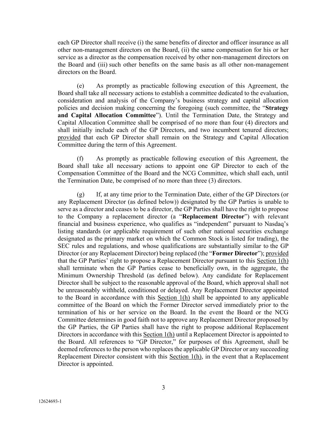 3 12624693-1 each GP Director shall receive (i) the same benefits of director and officer insurance as all other non-management directors on the Board, (ii) the same compensation for his or her service as a director as the compensation received by other non-management directors on the Board and (iii) such other benefits on the same basis as all other non-management directors on the Board. (e) As promptly as practicable following execution of this Agreement, the Board shall take all necessary actions to establish a committee dedicated to the evaluation, consideration and analysis of the Company’s business strategy and capital allocation policies and decision making concerning the foregoing (such committee, the “Strategy and Capital Allocation Committee”). Until the Termination Date, the Strategy and Capital Allocation Committee shall be comprised of no more than four (4) directors and shall initially include each of the GP Directors, and two incumbent tenured directors; provided that each GP Director shall remain on the Strategy and Capital Allocation Committee during the term of this Agreement. (f) As promptly as practicable following execution of this Agreement, the Board shall take all necessary actions to appoint one GP Director to each of the Compensation Committee of the Board and the NCG Committee, which shall each, until the Termination Date, be comprised of no more than three (3) directors. (g) If, at any time prior to the Termination Date, either of the GP Directors (or any Replacement Director (as defined below)) designated by the GP Parties is unable to serve as a director and ceases to be a director, the GP Parties shall have the right to propose to the Company a replacement director (a “Replacement Director”) with relevant financial and business experience, who qualifies as “independent” pursuant to Nasdaq’s listing standards (or applicable requirement of such other national securities exchange designated as the primary market on which the Common Stock is listed for trading), the SEC rules and regulations, and whose qualifications are substantially similar to the GP Director (or any Replacement Director) being replaced (the “Former Director”); provided that the GP Parties’ right to propose a Replacement Director pursuant to this Section 1(h) shall terminate when the GP Parties cease to beneficially own, in the aggregate, the Minimum Ownership Threshold (as defined below). Any candidate for Replacement Director shall be subject to the reasonable approval of the Board, which approval shall not be unreasonably withheld, conditioned or delayed. Any Replacement Director appointed to the Board in accordance with this Section 1(h) shall be appointed to any applicable committee of the Board on which the Former Director served immediately prior to the termination of his or her service on the Board. In the event the Board or the NCG Committee determines in good faith not to approve any Replacement Director proposed by the GP Parties, the GP Parties shall have the right to propose additional Replacement Directors in accordance with this Section 1(h) until a Replacement Director is appointed to the Board. All references to “GP Director,” for purposes of this Agreement, shall be deemed references to the person who replaces the applicable GP Director or any succeeding Replacement Director consistent with this Section 1(h), in the event that a Replacement Director is appointed.