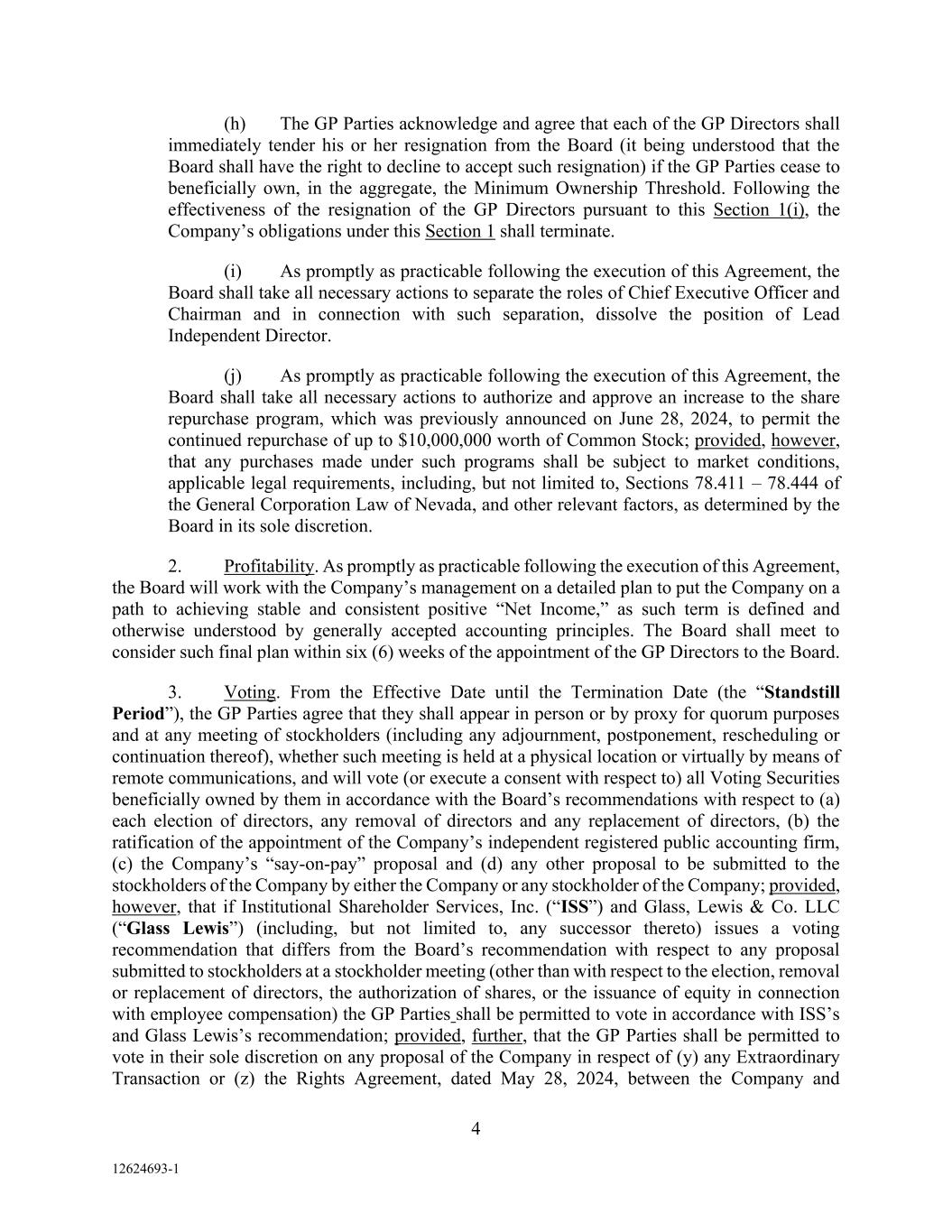 4 12624693-1 (h) The GP Parties acknowledge and agree that each of the GP Directors shall immediately tender his or her resignation from the Board (it being understood that the Board shall have the right to decline to accept such resignation) if the GP Parties cease to beneficially own, in the aggregate, the Minimum Ownership Threshold. Following the effectiveness of the resignation of the GP Directors pursuant to this Section 1(i), the Company’s obligations under this Section 1 shall terminate. (i) As promptly as practicable following the execution of this Agreement, the Board shall take all necessary actions to separate the roles of Chief Executive Officer and Chairman and in connection with such separation, dissolve the position of Lead Independent Director. (j) As promptly as practicable following the execution of this Agreement, the Board shall take all necessary actions to authorize and approve an increase to the share repurchase program, which was previously announced on June 28, 2024, to permit the continued repurchase of up to $10,000,000 worth of Common Stock; provided, however, that any purchases made under such programs shall be subject to market conditions, applicable legal requirements, including, but not limited to, Sections 78.411 – 78.444 of the General Corporation Law of Nevada, and other relevant factors, as determined by the Board in its sole discretion. 2. Profitability. As promptly as practicable following the execution of this Agreement, the Board will work with the Company’s management on a detailed plan to put the Company on a path to achieving stable and consistent positive “Net Income,” as such term is defined and otherwise understood by generally accepted accounting principles. The Board shall meet to consider such final plan within six (6) weeks of the appointment of the GP Directors to the Board. 3. Voting. From the Effective Date until the Termination Date (the “Standstill Period”), the GP Parties agree that they shall appear in person or by proxy for quorum purposes and at any meeting of stockholders (including any adjournment, postponement, rescheduling or continuation thereof), whether such meeting is held at a physical location or virtually by means of remote communications, and will vote (or execute a consent with respect to) all Voting Securities beneficially owned by them in accordance with the Board’s recommendations with respect to (a) each election of directors, any removal of directors and any replacement of directors, (b) the ratification of the appointment of the Company’s independent registered public accounting firm, (c) the Company’s “say-on-pay” proposal and (d) any other proposal to be submitted to the stockholders of the Company by either the Company or any stockholder of the Company; provided, however, that if Institutional Shareholder Services, Inc. (“ISS”) and Glass, Lewis & Co. LLC (“Glass Lewis”) (including, but not limited to, any successor thereto) issues a voting recommendation that differs from the Board’s recommendation with respect to any proposal submitted to stockholders at a stockholder meeting (other than with respect to the election, removal or replacement of directors, the authorization of shares, or the issuance of equity in connection with employee compensation) the GP Parties shall be permitted to vote in accordance with ISS’s and Glass Lewis’s recommendation; provided, further, that the GP Parties shall be permitted to vote in their sole discretion on any proposal of the Company in respect of (y) any Extraordinary Transaction or (z) the Rights Agreement, dated May 28, 2024, between the Company and