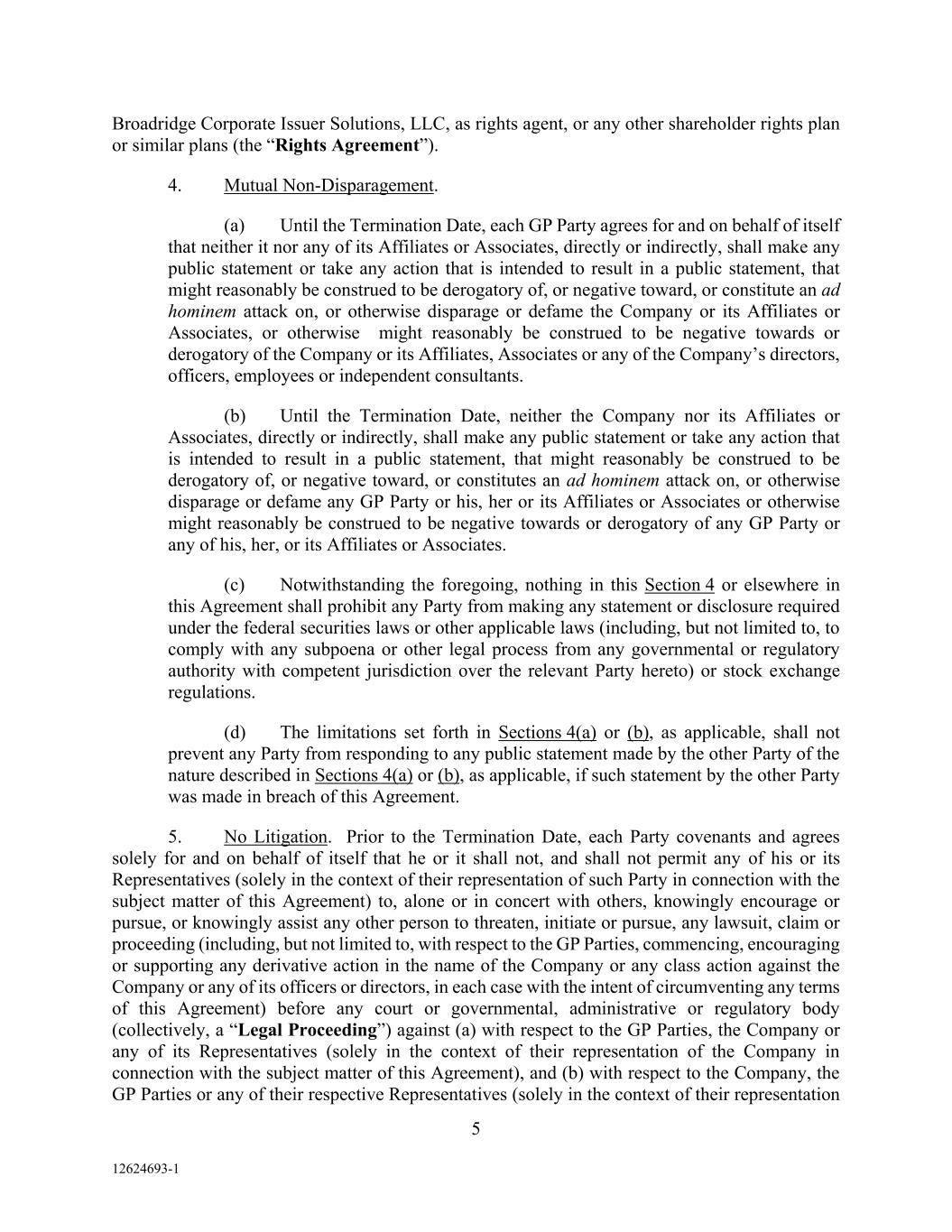 5 12624693-1 Broadridge Corporate Issuer Solutions, LLC, as rights agent, or any other shareholder rights plan or similar plans (the “Rights Agreement”). 4. Mutual Non-Disparagement. (a) Until the Termination Date, each GP Party agrees for and on behalf of itself that neither it nor any of its Affiliates or Associates, directly or indirectly, shall make any public statement or take any action that is intended to result in a public statement, that might reasonably be construed to be derogatory of, or negative toward, or constitute an ad hominem attack on, or otherwise disparage or defame the Company or its Affiliates or Associates, or otherwise might reasonably be construed to be negative towards or derogatory of the Company or its Affiliates, Associates or any of the Company’s directors, officers, employees or independent consultants. (b) Until the Termination Date, neither the Company nor its Affiliates or Associates, directly or indirectly, shall make any public statement or take any action that is intended to result in a public statement, that might reasonably be construed to be derogatory of, or negative toward, or constitutes an ad hominem attack on, or otherwise disparage or defame any GP Party or his, her or its Affiliates or Associates or otherwise might reasonably be construed to be negative towards or derogatory of any GP Party or any of his, her, or its Affiliates or Associates. (c) Notwithstanding the foregoing, nothing in this Section 4 or elsewhere in this Agreement shall prohibit any Party from making any statement or disclosure required under the federal securities laws or other applicable laws (including, but not limited to, to comply with any subpoena or other legal process from any governmental or regulatory authority with competent jurisdiction over the relevant Party hereto) or stock exchange regulations. (d) The limitations set forth in Sections 4(a) or (b), as applicable, shall not prevent any Party from responding to any public statement made by the other Party of the nature described in Sections 4(a) or (b), as applicable, if such statement by the other Party was made in breach of this Agreement. 5. No Litigation. Prior to the Termination Date, each Party covenants and agrees solely for and on behalf of itself that he or it shall not, and shall not permit any of his or its Representatives (solely in the context of their representation of such Party in connection with the subject matter of this Agreement) to, alone or in concert with others, knowingly encourage or pursue, or knowingly assist any other person to threaten, initiate or pursue, any lawsuit, claim or proceeding (including, but not limited to, with respect to the GP Parties, commencing, encouraging or supporting any derivative action in the name of the Company or any class action against the Company or any of its officers or directors, in each case with the intent of circumventing any terms of this Agreement) before any court or governmental, administrative or regulatory body (collectively, a “Legal Proceeding”) against (a) with respect to the GP Parties, the Company or any of its Representatives (solely in the context of their representation of the Company in connection with the subject matter of this Agreement), and (b) with respect to the Company, the GP Parties or any of their respective Representatives (solely in the context of their representation
