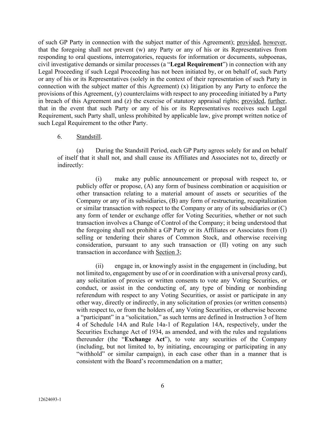 6 12624693-1 of such GP Party in connection with the subject matter of this Agreement); provided, however, that the foregoing shall not prevent (w) any Party or any of his or its Representatives from responding to oral questions, interrogatories, requests for information or documents, subpoenas, civil investigative demands or similar processes (a “Legal Requirement”) in connection with any Legal Proceeding if such Legal Proceeding has not been initiated by, or on behalf of, such Party or any of his or its Representatives (solely in the context of their representation of such Party in connection with the subject matter of this Agreement) (x) litigation by any Party to enforce the provisions of this Agreement, (y) counterclaims with respect to any proceeding initiated by a Party in breach of this Agreement and (z) the exercise of statutory appraisal rights; provided, further, that in the event that such Party or any of his or its Representatives receives such Legal Requirement, such Party shall, unless prohibited by applicable law, give prompt written notice of such Legal Requirement to the other Party. 6. Standstill. (a) During the Standstill Period, each GP Party agrees solely for and on behalf of itself that it shall not, and shall cause its Affiliates and Associates not to, directly or indirectly: (i) make any public announcement or proposal with respect to, or publicly offer or propose, (A) any form of business combination or acquisition or other transaction relating to a material amount of assets or securities of the Company or any of its subsidiaries, (B) any form of restructuring, recapitalization or similar transaction with respect to the Company or any of its subsidiaries or (C) any form of tender or exchange offer for Voting Securities, whether or not such transaction involves a Change of Control of the Company; it being understood that the foregoing shall not prohibit a GP Party or its Affiliates or Associates from (I) selling or tendering their shares of Common Stock, and otherwise receiving consideration, pursuant to any such transaction or (II) voting on any such transaction in accordance with Section 3; (ii) engage in, or knowingly assist in the engagement in (including, but not limited to, engagement by use of or in coordination with a universal proxy card), any solicitation of proxies or written consents to vote any Voting Securities, or conduct, or assist in the conducting of, any type of binding or nonbinding referendum with respect to any Voting Securities, or assist or participate in any other way, directly or indirectly, in any solicitation of proxies (or written consents) with respect to, or from the holders of, any Voting Securities, or otherwise become a “participant” in a “solicitation,” as such terms are defined in Instruction 3 of Item 4 of Schedule 14A and Rule 14a-1 of Regulation 14A, respectively, under the Securities Exchange Act of 1934, as amended, and with the rules and regulations thereunder (the “Exchange Act”), to vote any securities of the Company (including, but not limited to, by initiating, encouraging or participating in any “withhold” or similar campaign), in each case other than in a manner that is consistent with the Board’s recommendation on a matter;