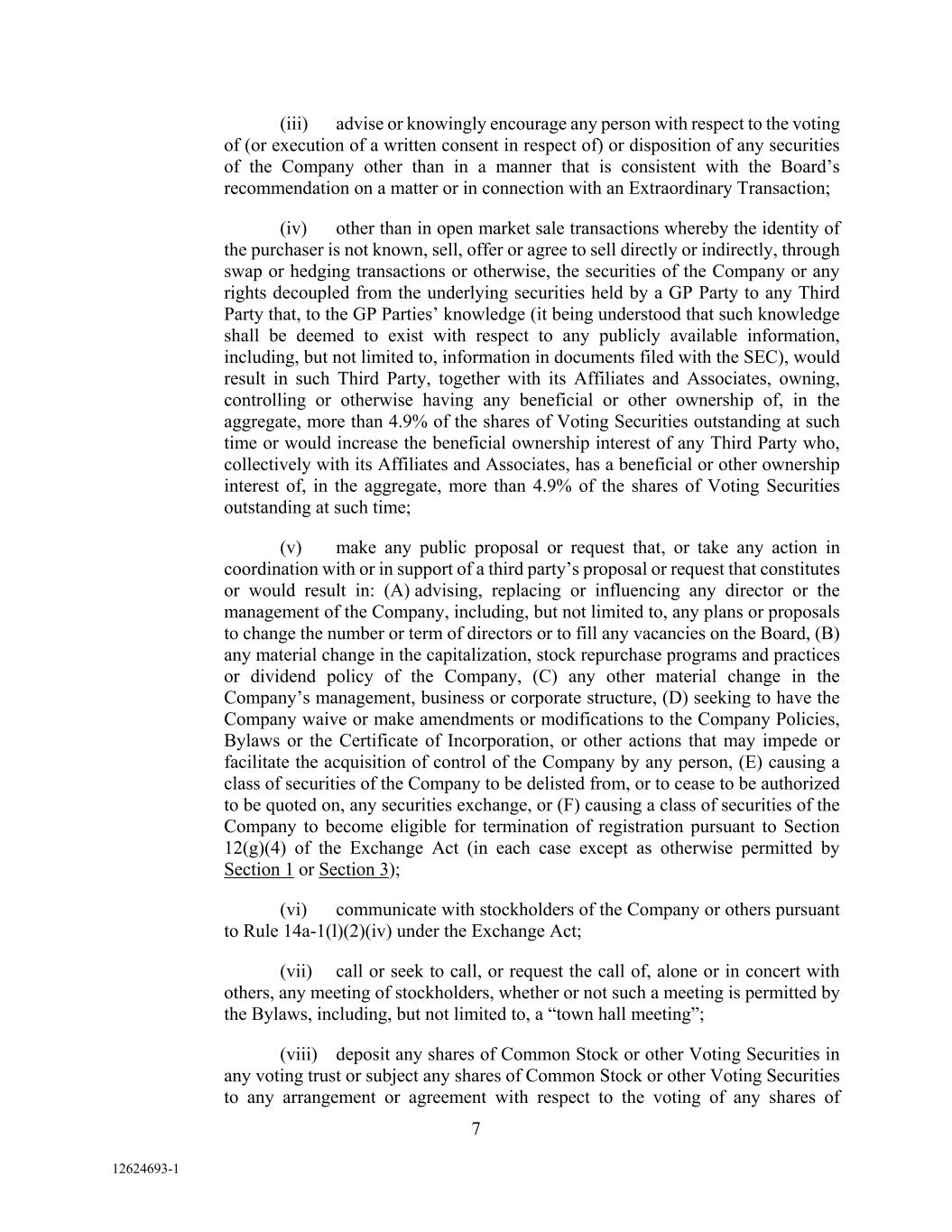 7 12624693-1 (iii) advise or knowingly encourage any person with respect to the voting of (or execution of a written consent in respect of) or disposition of any securities of the Company other than in a manner that is consistent with the Board’s recommendation on a matter or in connection with an Extraordinary Transaction; (iv) other than in open market sale transactions whereby the identity of the purchaser is not known, sell, offer or agree to sell directly or indirectly, through swap or hedging transactions or otherwise, the securities of the Company or any rights decoupled from the underlying securities held by a GP Party to any Third Party that, to the GP Parties’ knowledge (it being understood that such knowledge shall be deemed to exist with respect to any publicly available information, including, but not limited to, information in documents filed with the SEC), would result in such Third Party, together with its Affiliates and Associates, owning, controlling or otherwise having any beneficial or other ownership of, in the aggregate, more than 4.9% of the shares of Voting Securities outstanding at such time or would increase the beneficial ownership interest of any Third Party who, collectively with its Affiliates and Associates, has a beneficial or other ownership interest of, in the aggregate, more than 4.9% of the shares of Voting Securities outstanding at such time; (v) make any public proposal or request that, or take any action in coordination with or in support of a third party’s proposal or request that constitutes or would result in: (A) advising, replacing or influencing any director or the management of the Company, including, but not limited to, any plans or proposals to change the number or term of directors or to fill any vacancies on the Board, (B) any material change in the capitalization, stock repurchase programs and practices or dividend policy of the Company, (C) any other material change in the Company’s management, business or corporate structure, (D) seeking to have the Company waive or make amendments or modifications to the Company Policies, Bylaws or the Certificate of Incorporation, or other actions that may impede or facilitate the acquisition of control of the Company by any person, (E) causing a class of securities of the Company to be delisted from, or to cease to be authorized to be quoted on, any securities exchange, or (F) causing a class of securities of the Company to become eligible for termination of registration pursuant to Section 12(g)(4) of the Exchange Act (in each case except as otherwise permitted by Section 1 or Section 3); (vi) communicate with stockholders of the Company or others pursuant to Rule 14a-1(l)(2)(iv) under the Exchange Act; (vii) call or seek to call, or request the call of, alone or in concert with others, any meeting of stockholders, whether or not such a meeting is permitted by the Bylaws, including, but not limited to, a “town hall meeting”; (viii) deposit any shares of Common Stock or other Voting Securities in any voting trust or subject any shares of Common Stock or other Voting Securities to any arrangement or agreement with respect to the voting of any shares of