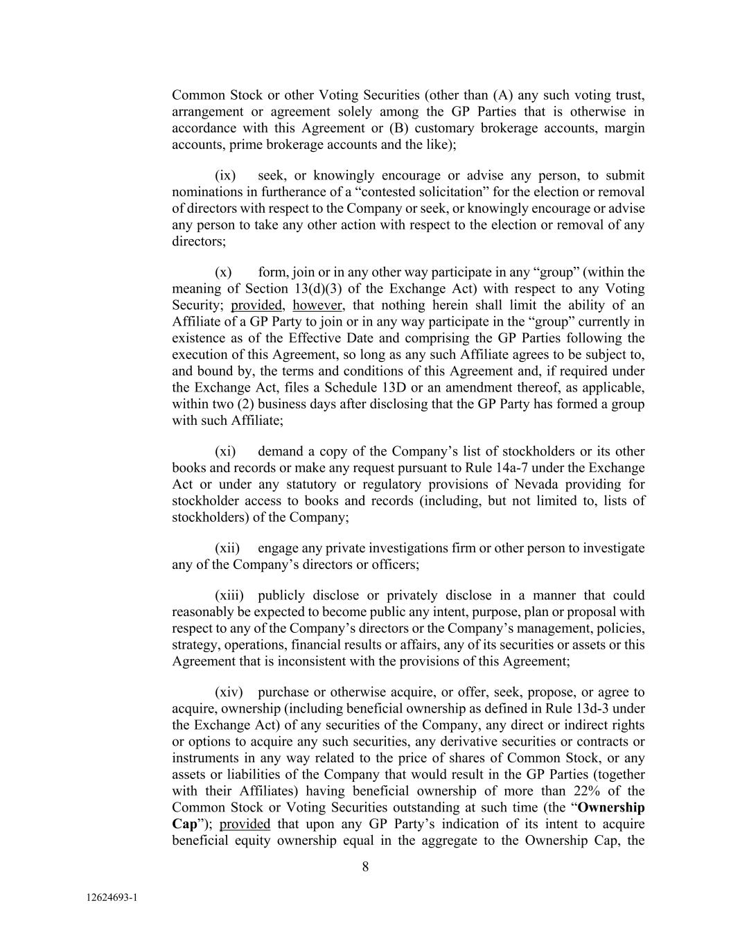 8 12624693-1 Common Stock or other Voting Securities (other than (A) any such voting trust, arrangement or agreement solely among the GP Parties that is otherwise in accordance with this Agreement or (B) customary brokerage accounts, margin accounts, prime brokerage accounts and the like); (ix) seek, or knowingly encourage or advise any person, to submit nominations in furtherance of a “contested solicitation” for the election or removal of directors with respect to the Company or seek, or knowingly encourage or advise any person to take any other action with respect to the election or removal of any directors; (x) form, join or in any other way participate in any “group” (within the meaning of Section 13(d)(3) of the Exchange Act) with respect to any Voting Security; provided, however, that nothing herein shall limit the ability of an Affiliate of a GP Party to join or in any way participate in the “group” currently in existence as of the Effective Date and comprising the GP Parties following the execution of this Agreement, so long as any such Affiliate agrees to be subject to, and bound by, the terms and conditions of this Agreement and, if required under the Exchange Act, files a Schedule 13D or an amendment thereof, as applicable, within two (2) business days after disclosing that the GP Party has formed a group with such Affiliate; (xi) demand a copy of the Company’s list of stockholders or its other books and records or make any request pursuant to Rule 14a-7 under the Exchange Act or under any statutory or regulatory provisions of Nevada providing for stockholder access to books and records (including, but not limited to, lists of stockholders) of the Company; (xii) engage any private investigations firm or other person to investigate any of the Company’s directors or officers; (xiii) publicly disclose or privately disclose in a manner that could reasonably be expected to become public any intent, purpose, plan or proposal with respect to any of the Company’s directors or the Company’s management, policies, strategy, operations, financial results or affairs, any of its securities or assets or this Agreement that is inconsistent with the provisions of this Agreement; (xiv) purchase or otherwise acquire, or offer, seek, propose, or agree to acquire, ownership (including beneficial ownership as defined in Rule 13d-3 under the Exchange Act) of any securities of the Company, any direct or indirect rights or options to acquire any such securities, any derivative securities or contracts or instruments in any way related to the price of shares of Common Stock, or any assets or liabilities of the Company that would result in the GP Parties (together with their Affiliates) having beneficial ownership of more than 22% of the Common Stock or Voting Securities outstanding at such time (the “Ownership Cap”); provided that upon any GP Party’s indication of its intent to acquire beneficial equity ownership equal in the aggregate to the Ownership Cap, the