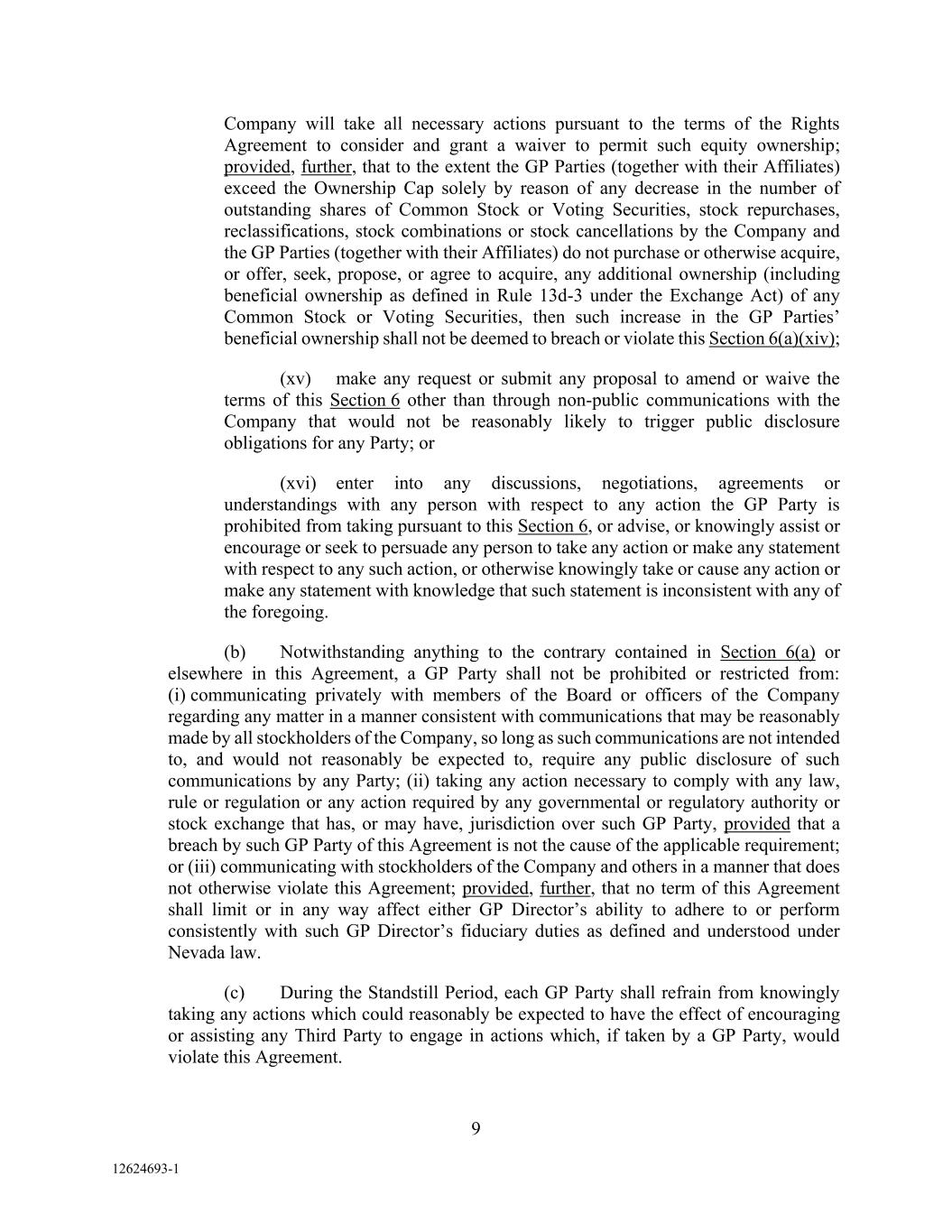 9 12624693-1 Company will take all necessary actions pursuant to the terms of the Rights Agreement to consider and grant a waiver to permit such equity ownership; provided, further, that to the extent the GP Parties (together with their Affiliates) exceed the Ownership Cap solely by reason of any decrease in the number of outstanding shares of Common Stock or Voting Securities, stock repurchases, reclassifications, stock combinations or stock cancellations by the Company and the GP Parties (together with their Affiliates) do not purchase or otherwise acquire, or offer, seek, propose, or agree to acquire, any additional ownership (including beneficial ownership as defined in Rule 13d-3 under the Exchange Act) of any Common Stock or Voting Securities, then such increase in the GP Parties’ beneficial ownership shall not be deemed to breach or violate this Section 6(a)(xiv); (xv) make any request or submit any proposal to amend or waive the terms of this Section 6 other than through non-public communications with the Company that would not be reasonably likely to trigger public disclosure obligations for any Party; or (xvi) enter into any discussions, negotiations, agreements or understandings with any person with respect to any action the GP Party is prohibited from taking pursuant to this Section 6, or advise, or knowingly assist or encourage or seek to persuade any person to take any action or make any statement with respect to any such action, or otherwise knowingly take or cause any action or make any statement with knowledge that such statement is inconsistent with any of the foregoing. (b) Notwithstanding anything to the contrary contained in Section 6(a) or elsewhere in this Agreement, a GP Party shall not be prohibited or restricted from: (i) communicating privately with members of the Board or officers of the Company regarding any matter in a manner consistent with communications that may be reasonably made by all stockholders of the Company, so long as such communications are not intended to, and would not reasonably be expected to, require any public disclosure of such communications by any Party; (ii) taking any action necessary to comply with any law, rule or regulation or any action required by any governmental or regulatory authority or stock exchange that has, or may have, jurisdiction over such GP Party, provided that a breach by such GP Party of this Agreement is not the cause of the applicable requirement; or (iii) communicating with stockholders of the Company and others in a manner that does not otherwise violate this Agreement; provided, further, that no term of this Agreement shall limit or in any way affect either GP Director’s ability to adhere to or perform consistently with such GP Director’s fiduciary duties as defined and understood under Nevada law. (c) During the Standstill Period, each GP Party shall refrain from knowingly taking any actions which could reasonably be expected to have the effect of encouraging or assisting any Third Party to engage in actions which, if taken by a GP Party, would violate this Agreement.