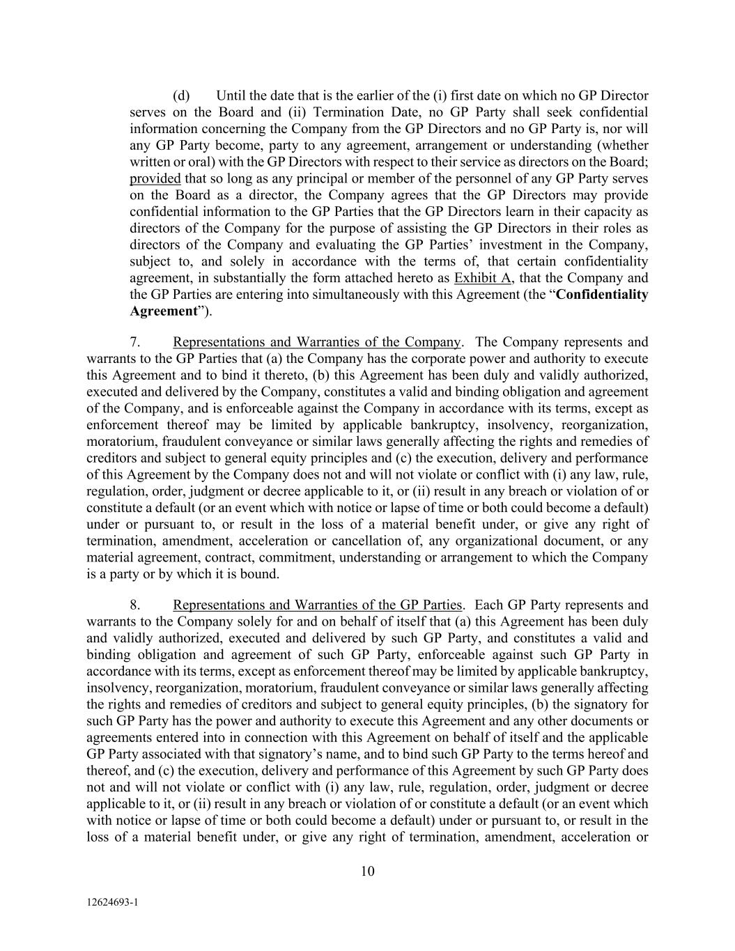 10 12624693-1 (d) Until the date that is the earlier of the (i) first date on which no GP Director serves on the Board and (ii) Termination Date, no GP Party shall seek confidential information concerning the Company from the GP Directors and no GP Party is, nor will any GP Party become, party to any agreement, arrangement or understanding (whether written or oral) with the GP Directors with respect to their service as directors on the Board; provided that so long as any principal or member of the personnel of any GP Party serves on the Board as a director, the Company agrees that the GP Directors may provide confidential information to the GP Parties that the GP Directors learn in their capacity as directors of the Company for the purpose of assisting the GP Directors in their roles as directors of the Company and evaluating the GP Parties’ investment in the Company, subject to, and solely in accordance with the terms of, that certain confidentiality agreement, in substantially the form attached hereto as Exhibit A, that the Company and the GP Parties are entering into simultaneously with this Agreement (the “Confidentiality Agreement”). 7. Representations and Warranties of the Company. The Company represents and warrants to the GP Parties that (a) the Company has the corporate power and authority to execute this Agreement and to bind it thereto, (b) this Agreement has been duly and validly authorized, executed and delivered by the Company, constitutes a valid and binding obligation and agreement of the Company, and is enforceable against the Company in accordance with its terms, except as enforcement thereof may be limited by applicable bankruptcy, insolvency, reorganization, moratorium, fraudulent conveyance or similar laws generally affecting the rights and remedies of creditors and subject to general equity principles and (c) the execution, delivery and performance of this Agreement by the Company does not and will not violate or conflict with (i) any law, rule, regulation, order, judgment or decree applicable to it, or (ii) result in any breach or violation of or constitute a default (or an event which with notice or lapse of time or both could become a default) under or pursuant to, or result in the loss of a material benefit under, or give any right of termination, amendment, acceleration or cancellation of, any organizational document, or any material agreement, contract, commitment, understanding or arrangement to which the Company is a party or by which it is bound. 8. Representations and Warranties of the GP Parties. Each GP Party represents and warrants to the Company solely for and on behalf of itself that (a) this Agreement has been duly and validly authorized, executed and delivered by such GP Party, and constitutes a valid and binding obligation and agreement of such GP Party, enforceable against such GP Party in accordance with its terms, except as enforcement thereof may be limited by applicable bankruptcy, insolvency, reorganization, moratorium, fraudulent conveyance or similar laws generally affecting the rights and remedies of creditors and subject to general equity principles, (b) the signatory for such GP Party has the power and authority to execute this Agreement and any other documents or agreements entered into in connection with this Agreement on behalf of itself and the applicable GP Party associated with that signatory’s name, and to bind such GP Party to the terms hereof and thereof, and (c) the execution, delivery and performance of this Agreement by such GP Party does not and will not violate or conflict with (i) any law, rule, regulation, order, judgment or decree applicable to it, or (ii) result in any breach or violation of or constitute a default (or an event which with notice or lapse of time or both could become a default) under or pursuant to, or result in the loss of a material benefit under, or give any right of termination, amendment, acceleration or