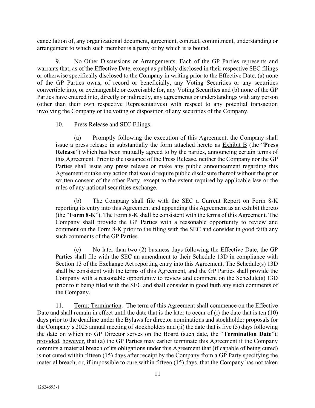 11 12624693-1 cancellation of, any organizational document, agreement, contract, commitment, understanding or arrangement to which such member is a party or by which it is bound. 9. No Other Discussions or Arrangements. Each of the GP Parties represents and warrants that, as of the Effective Date, except as publicly disclosed in their respective SEC filings or otherwise specifically disclosed to the Company in writing prior to the Effective Date, (a) none of the GP Parties owns, of record or beneficially, any Voting Securities or any securities convertible into, or exchangeable or exercisable for, any Voting Securities and (b) none of the GP Parties have entered into, directly or indirectly, any agreements or understandings with any person (other than their own respective Representatives) with respect to any potential transaction involving the Company or the voting or disposition of any securities of the Company. 10. Press Release and SEC Filings. (a) Promptly following the execution of this Agreement, the Company shall issue a press release in substantially the form attached hereto as Exhibit B (the “Press Release”) which has been mutually agreed to by the parties, announcing certain terms of this Agreement. Prior to the issuance of the Press Release, neither the Company nor the GP Parties shall issue any press release or make any public announcement regarding this Agreement or take any action that would require public disclosure thereof without the prior written consent of the other Party, except to the extent required by applicable law or the rules of any national securities exchange. (b) The Company shall file with the SEC a Current Report on Form 8-K reporting its entry into this Agreement and appending this Agreement as an exhibit thereto (the “Form 8-K”). The Form 8-K shall be consistent with the terms of this Agreement. The Company shall provide the GP Parties with a reasonable opportunity to review and comment on the Form 8-K prior to the filing with the SEC and consider in good faith any such comments of the GP Parties. (c) No later than two (2) business days following the Effective Date, the GP Parties shall file with the SEC an amendment to their Schedule 13D in compliance with Section 13 of the Exchange Act reporting entry into this Agreement. The Schedule(s) 13D shall be consistent with the terms of this Agreement, and the GP Parties shall provide the Company with a reasonable opportunity to review and comment on the Schedule(s) 13D prior to it being filed with the SEC and shall consider in good faith any such comments of the Company. 11. Term; Termination. The term of this Agreement shall commence on the Effective Date and shall remain in effect until the date that is the later to occur of (i) the date that is ten (10) days prior to the deadline under the Bylaws for director nominations and stockholder proposals for the Company’s 2025 annual meeting of stockholders and (ii) the date that is five (5) days following the date on which no GP Director serves on the Board (such date, the “Termination Date”); provided, however, that (a) the GP Parties may earlier terminate this Agreement if the Company commits a material breach of its obligations under this Agreement that (if capable of being cured) is not cured within fifteen (15) days after receipt by the Company from a GP Party specifying the material breach, or, if impossible to cure within fifteen (15) days, that the Company has not taken