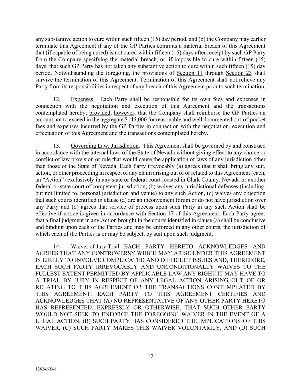 12 12624693-1 any substantive action to cure within such fifteen (15) day period, and (b) the Company may earlier terminate this Agreement if any of the GP Parties commits a material breach of this Agreement that (if capable of being cured) is not cured within fifteen (15) days after receipt by such GP Party from the Company specifying the material breach, or, if impossible to cure within fifteen (15) days, that such GP Party has not taken any substantive action to cure within such fifteen (15) day period. Notwithstanding the foregoing, the provisions of Section 11 through Section 23 shall survive the termination of this Agreement. Termination of this Agreement shall not relieve any Party from its responsibilities in respect of any breach of this Agreement prior to such termination. 12. Expenses. Each Party shall be responsible for its own fees and expenses in connection with the negotiation and execution of this Agreement and the transactions contemplated hereby; provided, however, that the Company shall reimburse the GP Parties an amount not to exceed in the aggregate $145,000 for reasonable and well documented out-of-pocket fees and expenses incurred by the GP Parties in connection with the negotiation, execution and effectuation of this Agreement and the transactions contemplated hereby. 13. Governing Law; Jurisdiction. This Agreement shall be governed by and construed in accordance with the internal laws of the State of Nevada without giving effect to any choice or conflict of law provision or rule that would cause the application of laws of any jurisdiction other than those of the State of Nevada. Each Party irrevocably (a) agrees that it shall bring any suit, action, or other proceeding in respect of any claim arising out of or related to this Agreement (each, an “Action”) exclusively in any state or federal court located in Clark County, Nevada or another federal or state court of competent jurisdiction, (b) waives any jurisdictional defenses (including, but not limited to, personal jurisdiction and venue) to any such Action, (c) waives any objection that such courts identified in clause (a) are an inconvenient forum or do not have jurisdiction over any Party and (d) agrees that service of process upon such Party in any such Action shall be effective if notice is given in accordance with Section 17 of this Agreement. Each Party agrees that a final judgment in any Action brought in the courts identified in clause (a) shall be conclusive and binding upon each of the Parties and may be enforced in any other courts, the jurisdiction of which each of the Parties is or may be subject, by suit upon such judgment. 14. Waiver of Jury Trial. EACH PARTY HERETO ACKNOWLEDGES AND AGREES THAT ANY CONTROVERSY WHICH MAY ARISE UNDER THIS AGREEMENT IS LIKELY TO INVOLVE COMPLICATED AND DIFFICULT ISSUES AND, THEREFORE, EACH SUCH PARTY IRREVOCABLY AND UNCONDITIONALLY WAIVES TO THE FULLEST EXTENT PERMITTED BY APPLICABLE LAW ANY RIGHT IT MAY HAVE TO A TRIAL BY JURY IN RESPECT OF ANY LEGAL ACTION ARISING OUT OF OR RELATING TO THIS AGREEMENT OR THE TRANSACTIONS CONTEMPLATED BY THIS AGREEMENT. EACH PARTY TO THIS AGREEMENT CERTIFIES AND ACKNOWLEDGES THAT (A) NO REPRESENTATIVE OF ANY OTHER PARTY HERETO HAS REPRESENTED, EXPRESSLY OR OTHERWISE, THAT SUCH OTHER PARTY WOULD NOT SEEK TO ENFORCE THE FOREGOING WAIVER IN THE EVENT OF A LEGAL ACTION, (B) SUCH PARTY HAS CONSIDERED THE IMPLICATIONS OF THIS WAIVER, (C) SUCH PARTY MAKES THIS WAIVER VOLUNTARILY, AND (D) SUCH