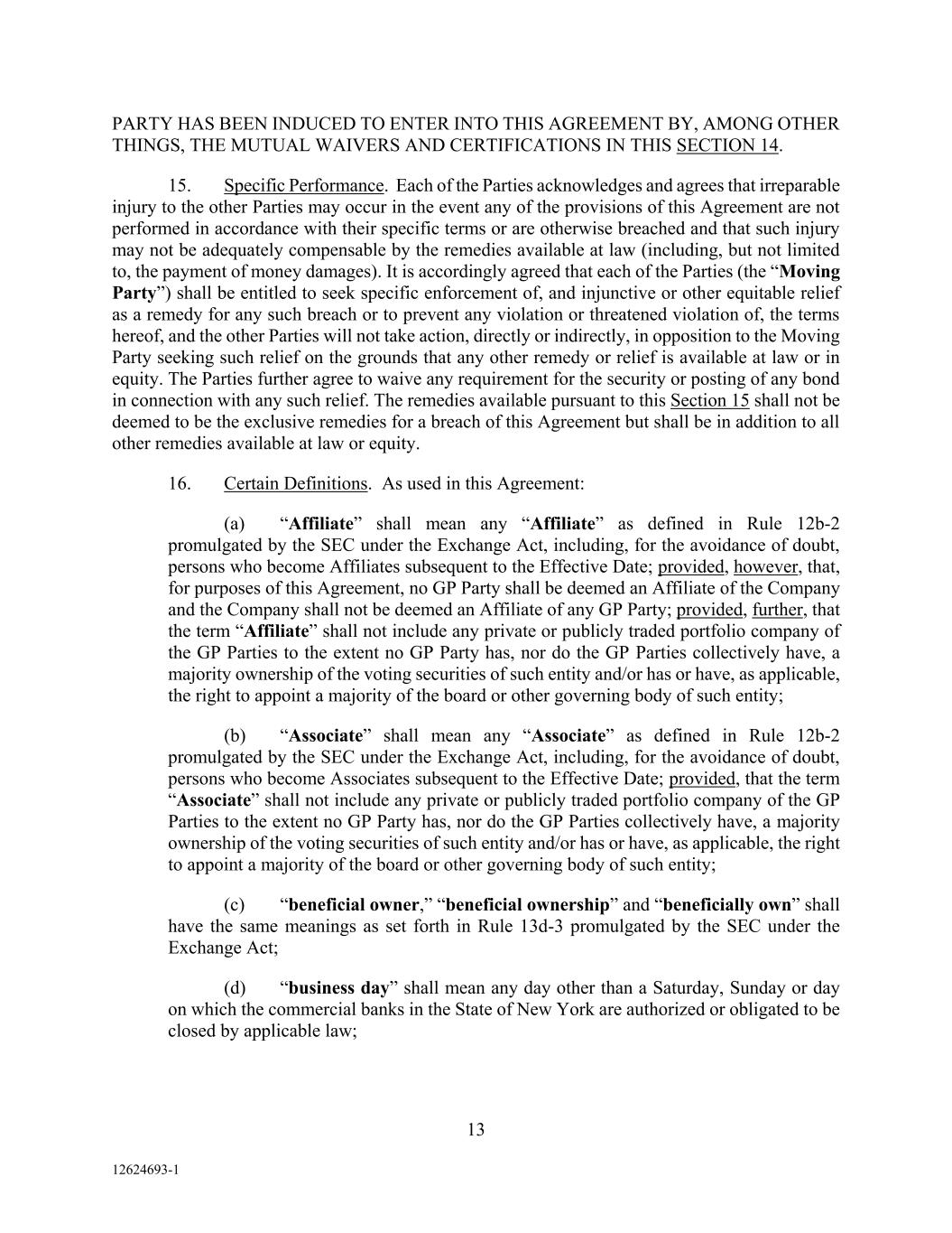 13 12624693-1 PARTY HAS BEEN INDUCED TO ENTER INTO THIS AGREEMENT BY, AMONG OTHER THINGS, THE MUTUAL WAIVERS AND CERTIFICATIONS IN THIS SECTION 14. 15. Specific Performance. Each of the Parties acknowledges and agrees that irreparable injury to the other Parties may occur in the event any of the provisions of this Agreement are not performed in accordance with their specific terms or are otherwise breached and that such injury may not be adequately compensable by the remedies available at law (including, but not limited to, the payment of money damages). It is accordingly agreed that each of the Parties (the “Moving Party”) shall be entitled to seek specific enforcement of, and injunctive or other equitable relief as a remedy for any such breach or to prevent any violation or threatened violation of, the terms hereof, and the other Parties will not take action, directly or indirectly, in opposition to the Moving Party seeking such relief on the grounds that any other remedy or relief is available at law or in equity. The Parties further agree to waive any requirement for the security or posting of any bond in connection with any such relief. The remedies available pursuant to this Section 15 shall not be deemed to be the exclusive remedies for a breach of this Agreement but shall be in addition to all other remedies available at law or equity. 16. Certain Definitions. As used in this Agreement: (a) “Affiliate” shall mean any “Affiliate” as defined in Rule 12b-2 promulgated by the SEC under the Exchange Act, including, for the avoidance of doubt, persons who become Affiliates subsequent to the Effective Date; provided, however, that, for purposes of this Agreement, no GP Party shall be deemed an Affiliate of the Company and the Company shall not be deemed an Affiliate of any GP Party; provided, further, that the term “Affiliate” shall not include any private or publicly traded portfolio company of the GP Parties to the extent no GP Party has, nor do the GP Parties collectively have, a majority ownership of the voting securities of such entity and/or has or have, as applicable, the right to appoint a majority of the board or other governing body of such entity; (b) “Associate” shall mean any “Associate” as defined in Rule 12b-2 promulgated by the SEC under the Exchange Act, including, for the avoidance of doubt, persons who become Associates subsequent to the Effective Date; provided, that the term “Associate” shall not include any private or publicly traded portfolio company of the GP Parties to the extent no GP Party has, nor do the GP Parties collectively have, a majority ownership of the voting securities of such entity and/or has or have, as applicable, the right to appoint a majority of the board or other governing body of such entity; (c) “beneficial owner,” “beneficial ownership” and “beneficially own” shall have the same meanings as set forth in Rule 13d-3 promulgated by the SEC under the Exchange Act; (d) “business day” shall mean any day other than a Saturday, Sunday or day on which the commercial banks in the State of New York are authorized or obligated to be closed by applicable law;