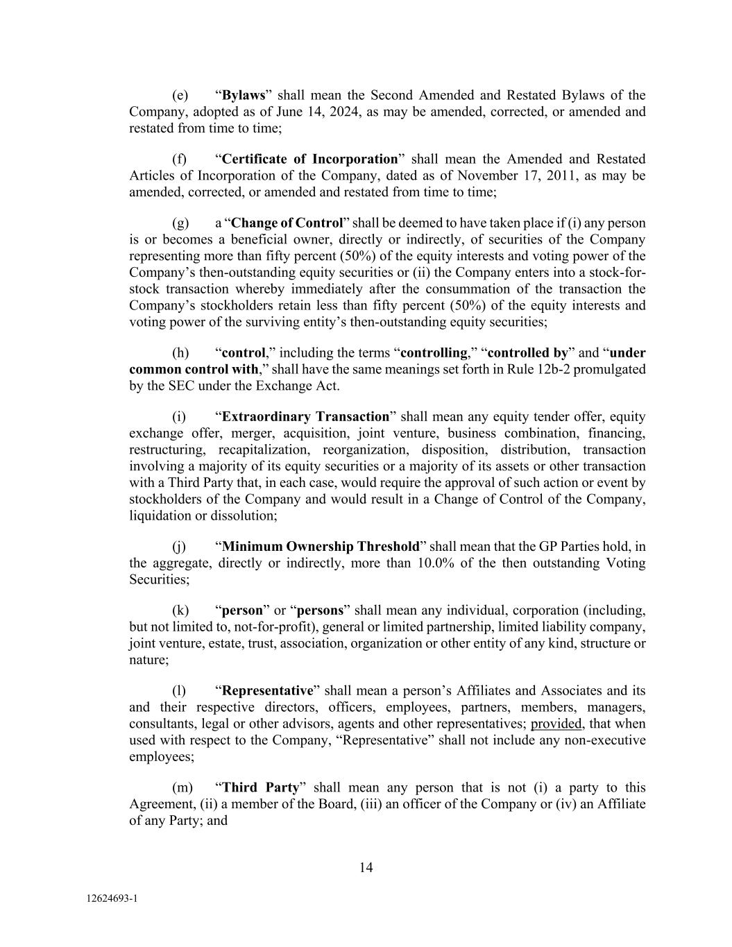 14 12624693-1 (e) “Bylaws” shall mean the Second Amended and Restated Bylaws of the Company, adopted as of June 14, 2024, as may be amended, corrected, or amended and restated from time to time; (f) “Certificate of Incorporation” shall mean the Amended and Restated Articles of Incorporation of the Company, dated as of November 17, 2011, as may be amended, corrected, or amended and restated from time to time; (g) a “Change of Control” shall be deemed to have taken place if (i) any person is or becomes a beneficial owner, directly or indirectly, of securities of the Company representing more than fifty percent (50%) of the equity interests and voting power of the Company’s then-outstanding equity securities or (ii) the Company enters into a stock-for- stock transaction whereby immediately after the consummation of the transaction the Company’s stockholders retain less than fifty percent (50%) of the equity interests and voting power of the surviving entity’s then-outstanding equity securities; (h) “control,” including the terms “controlling,” “controlled by” and “under common control with,” shall have the same meanings set forth in Rule 12b-2 promulgated by the SEC under the Exchange Act. (i) “Extraordinary Transaction” shall mean any equity tender offer, equity exchange offer, merger, acquisition, joint venture, business combination, financing, restructuring, recapitalization, reorganization, disposition, distribution, transaction involving a majority of its equity securities or a majority of its assets or other transaction with a Third Party that, in each case, would require the approval of such action or event by stockholders of the Company and would result in a Change of Control of the Company, liquidation or dissolution; (j) “Minimum Ownership Threshold” shall mean that the GP Parties hold, in the aggregate, directly or indirectly, more than 10.0% of the then outstanding Voting Securities; (k) “person” or “persons” shall mean any individual, corporation (including, but not limited to, not-for-profit), general or limited partnership, limited liability company, joint venture, estate, trust, association, organization or other entity of any kind, structure or nature; (l) “Representative” shall mean a person’s Affiliates and Associates and its and their respective directors, officers, employees, partners, members, managers, consultants, legal or other advisors, agents and other representatives; provided, that when used with respect to the Company, “Representative” shall not include any non-executive employees; (m) “Third Party” shall mean any person that is not (i) a party to this Agreement, (ii) a member of the Board, (iii) an officer of the Company or (iv) an Affiliate of any Party; and