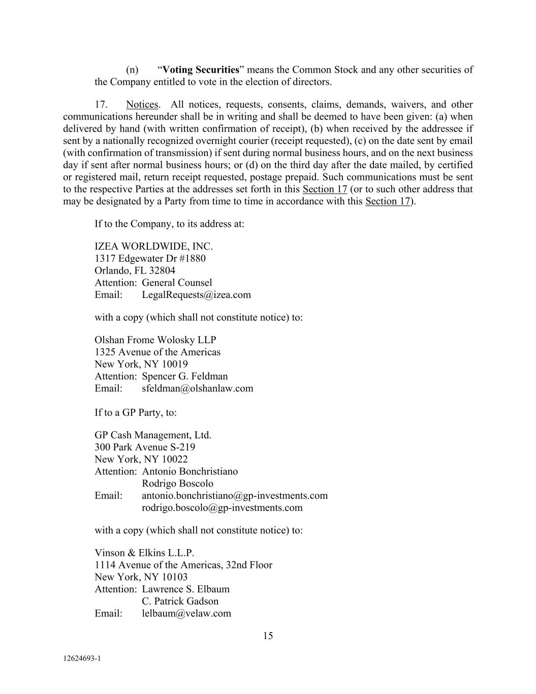 15 12624693-1 (n) “Voting Securities” means the Common Stock and any other securities of the Company entitled to vote in the election of directors. 17. Notices. All notices, requests, consents, claims, demands, waivers, and other communications hereunder shall be in writing and shall be deemed to have been given: (a) when delivered by hand (with written confirmation of receipt), (b) when received by the addressee if sent by a nationally recognized overnight courier (receipt requested), (c) on the date sent by email (with confirmation of transmission) if sent during normal business hours, and on the next business day if sent after normal business hours; or (d) on the third day after the date mailed, by certified or registered mail, return receipt requested, postage prepaid. Such communications must be sent to the respective Parties at the addresses set forth in this Section 17 (or to such other address that may be designated by a Party from time to time in accordance with this Section 17). If to the Company, to its address at: IZEA WORLDWIDE, INC. 1317 Edgewater Dr #1880 Orlando, FL 32804 Attention: General Counsel Email: LegalRequests@izea.com with a copy (which shall not constitute notice) to: Olshan Frome Wolosky LLP 1325 Avenue of the Americas New York, NY 10019 Attention: Spencer G. Feldman Email: sfeldman@olshanlaw.com If to a GP Party, to: GP Cash Management, Ltd. 300 Park Avenue S-219 New York, NY 10022 Attention: Antonio Bonchristiano Rodrigo Boscolo Email: antonio.bonchristiano@gp-investments.com rodrigo.boscolo@gp-investments.com with a copy (which shall not constitute notice) to: Vinson & Elkins L.L.P. 1114 Avenue of the Americas, 32nd Floor New York, NY 10103 Attention: Lawrence S. Elbaum C. Patrick Gadson Email: lelbaum@velaw.com