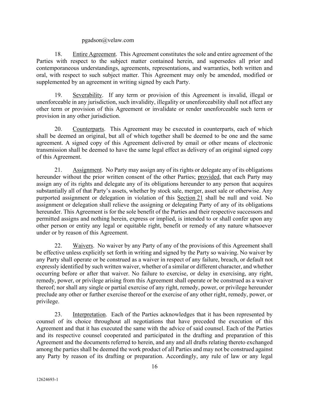 16 12624693-1 pgadson@velaw.com 18. Entire Agreement. This Agreement constitutes the sole and entire agreement of the Parties with respect to the subject matter contained herein, and supersedes all prior and contemporaneous understandings, agreements, representations, and warranties, both written and oral, with respect to such subject matter. This Agreement may only be amended, modified or supplemented by an agreement in writing signed by each Party. 19. Severability. If any term or provision of this Agreement is invalid, illegal or unenforceable in any jurisdiction, such invalidity, illegality or unenforceability shall not affect any other term or provision of this Agreement or invalidate or render unenforceable such term or provision in any other jurisdiction. 20. Counterparts. This Agreement may be executed in counterparts, each of which shall be deemed an original, but all of which together shall be deemed to be one and the same agreement. A signed copy of this Agreement delivered by email or other means of electronic transmission shall be deemed to have the same legal effect as delivery of an original signed copy of this Agreement. 21. Assignment. No Party may assign any of its rights or delegate any of its obligations hereunder without the prior written consent of the other Parties; provided, that each Party may assign any of its rights and delegate any of its obligations hereunder to any person that acquires substantially all of that Party’s assets, whether by stock sale, merger, asset sale or otherwise. Any purported assignment or delegation in violation of this Section 21 shall be null and void. No assignment or delegation shall relieve the assigning or delegating Party of any of its obligations hereunder. This Agreement is for the sole benefit of the Parties and their respective successors and permitted assigns and nothing herein, express or implied, is intended to or shall confer upon any other person or entity any legal or equitable right, benefit or remedy of any nature whatsoever under or by reason of this Agreement. 22. Waivers. No waiver by any Party of any of the provisions of this Agreement shall be effective unless explicitly set forth in writing and signed by the Party so waiving. No waiver by any Party shall operate or be construed as a waiver in respect of any failure, breach, or default not expressly identified by such written waiver, whether of a similar or different character, and whether occurring before or after that waiver. No failure to exercise, or delay in exercising, any right, remedy, power, or privilege arising from this Agreement shall operate or be construed as a waiver thereof; nor shall any single or partial exercise of any right, remedy, power, or privilege hereunder preclude any other or further exercise thereof or the exercise of any other right, remedy, power, or privilege. 23. Interpretation. Each of the Parties acknowledges that it has been represented by counsel of its choice throughout all negotiations that have preceded the execution of this Agreement and that it has executed the same with the advice of said counsel. Each of the Parties and its respective counsel cooperated and participated in the drafting and preparation of this Agreement and the documents referred to herein, and any and all drafts relating thereto exchanged among the parties shall be deemed the work product of all Parties and may not be construed against any Party by reason of its drafting or preparation. Accordingly, any rule of law or any legal