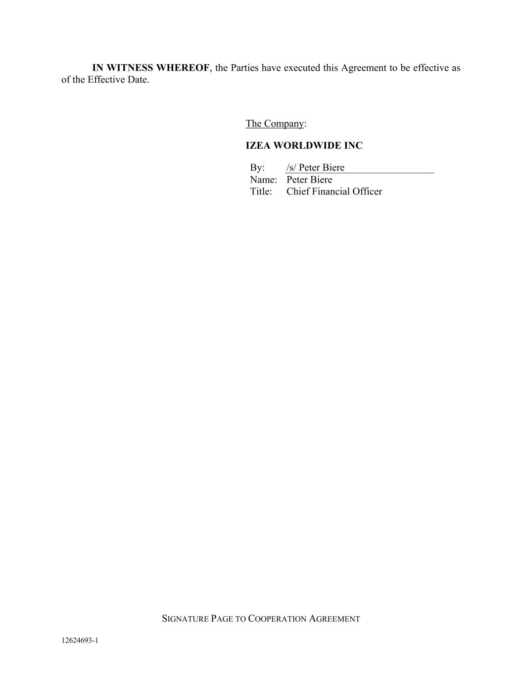 SIGNATURE PAGE TO COOPERATION AGREEMENT 12624693-1 IN WITNESS WHEREOF, the Parties have executed this Agreement to be effective as of the Effective Date. The Company: IZEA WORLDWIDE INC By: /s/ Peter Biere Name: Peter Biere Title: Chief Financial Officer