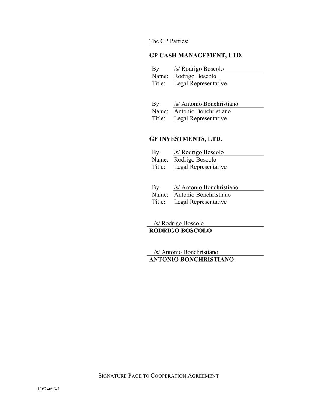 SIGNATURE PAGE TO COOPERATION AGREEMENT 12624693-1 The GP Parties: GP CASH MANAGEMENT, LTD. By: /s/ Rodrigo Boscolo Name: Rodrigo Boscolo Title: Legal Representative By: /s/ Antonio Bonchristiano Name: Antonio Bonchristiano Title: Legal Representative GP INVESTMENTS, LTD. By: /s/ Rodrigo Boscolo Name: Rodrigo Boscolo Title: Legal Representative By: /s/ Antonio Bonchristiano Name: Antonio Bonchristiano Title: Legal Representative /s/ Rodrigo Boscolo RODRIGO BOSCOLO /s/ Antonio Bonchristiano ANTONIO BONCHRISTIANO