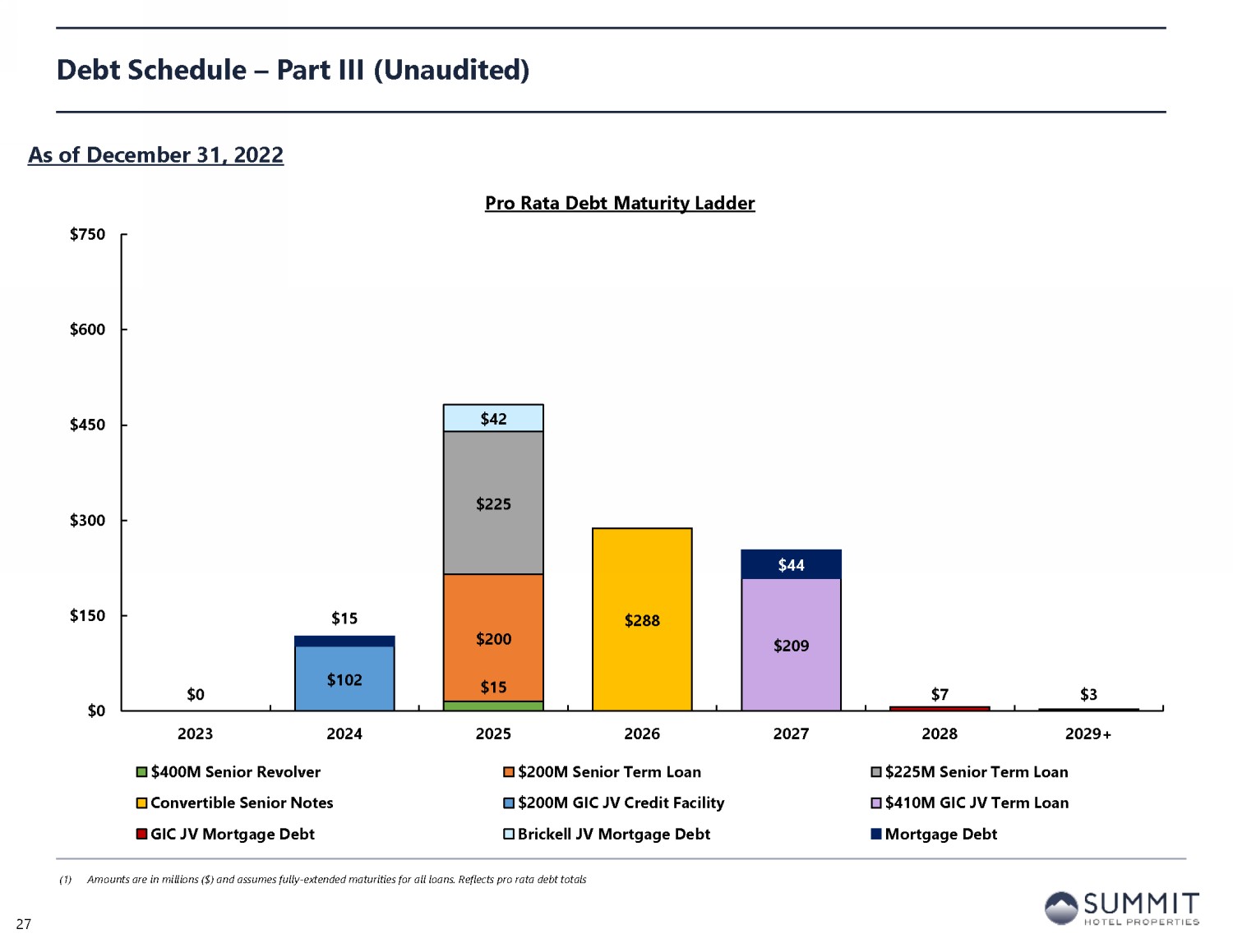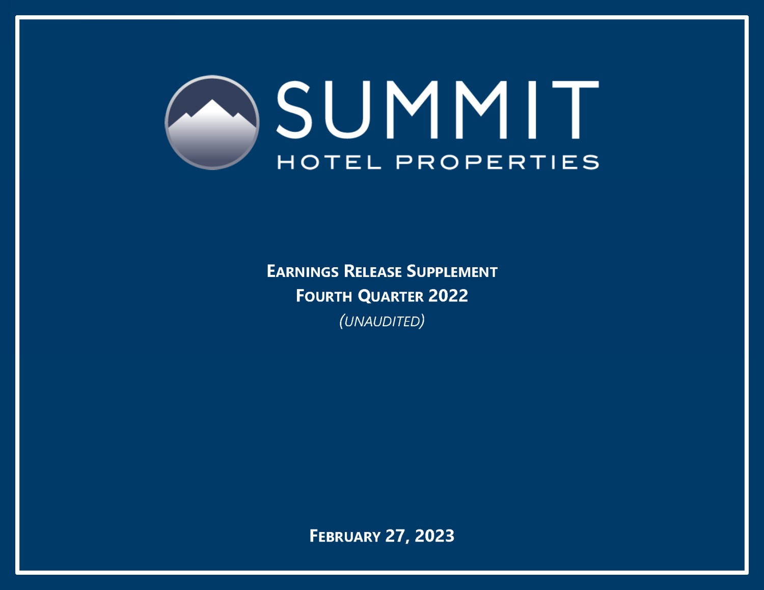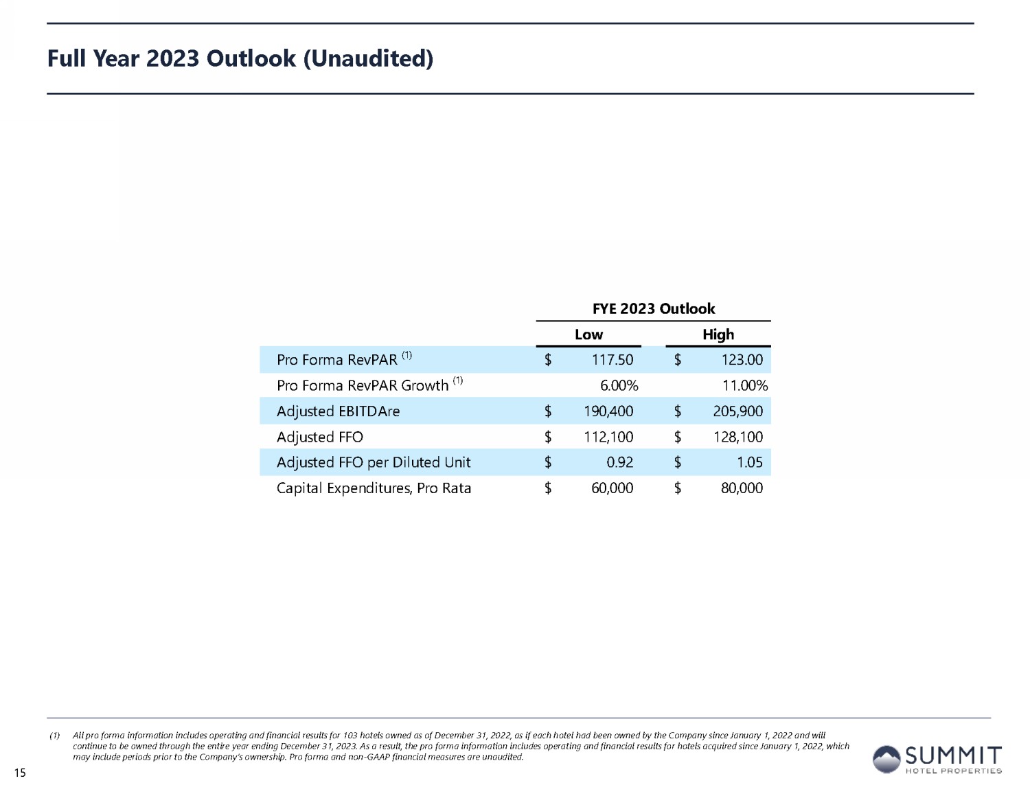 Reconciliation to Adjusted FFO – By Ownership Interest Full Year 2022 (1) The total of these line items represents depreciation and amortization as reported on the Company’s Condensed Consolidated St ate ments of Operations for the periods presented. (2) Non - cash interest income relates to the amortization of the discount on certain notes receivable. The discount on these notes re ceivable was recorded at inception of the related loans based on the estimated value of the embedded purchase options in the notes receivable. (3) The Company includes the outstanding OP units issued by Summit Hotel OP, LP, the Company’s operating partnership, held by lim ite d partners other than the Company because the OP units are redeemable for cash or, at the Company’s option, shares of the Company’s common stock on a one - for - one basis. (4) GIC Joint Venture is 51% owned by Summit while Other Joint Ventures are 90% owned by Summit. 14 Summit Wholly-Owned GIC Joint Venture (4) Other Joint Ventures (4) Consolidated GIC JV Pro Rata Adj Other JVs Pro Rata Adj Pro Rata FYE 2022 FYE 2021 FYE 2022 FYE 2021 FYE 2022 FYE 2021 FYE 2022 FYE 2021 FYE 2022 FYE 2021 FYE 2022 FYE 2021 FYE 2022 FYE 2021 Net (loss) income (3,969)$ (62,657)$ 6,364$ (5,927)$ (1,178)$ -$ 1,217$ (68,584)$ (2,439) 2,896 118 - (1,104)$ (65,688)$ Preferred dividends (15,875) (15,431) - - - - (15,875) (15,431) - - - - (15,875) (15,431) Distributions and accretion of redeemable non-controlling interests (2,520) - - - - - (2,520) - - - - - (2,520) - Premium on redemption of preferred stock - (2,710) - - - - - (2,710) - - - - - (2,710) Net loss applicable to common shares and common units (22,364)$ (80,798)$ 6,364$ (5,927)$ (1,178)$ -$ (17,178)$ (86,725)$ (2,439)$ 2,896$ 118$ -$ (19,499)$ (83,829)$ Real estate-related depreciation (1) 80,705 88,149 62,599 17,313 2,188 - 145,492 105,462 (30,673) (8,461) (219) - 114,600 97,001 Loss on impairment of assets 10,420 4,361 - - - - 10,420 4,361 - - - - 10,420 4,361 Loss (gain) on disposal of assets, net 190 (226) (20,505) (14) - - (20,315) (240) 10,047 7 - - (10,268) (233) FFO applicable to common shares and common units 68,951$ 11,486$ 48,458$ 11,372$ 1,010$ -$ 118,419$ 22,858$ (23,065)$ (5,558)$ (101)$ -$ 95,253$ 17,300$ Reversal of credit losses (1,100) (2,632) - - - - (1,100) (2,632) - - - - (1,100) (2,632) Amortization of lease-related intangible assets - 87 - - - - - 87 - - - - - 87 Amortization of deferred financing costs 3,815 3,730 1,858 623 35 - 5,708 4,353 (910) (305) (4) - 4,794 4,048 Amortization of franchise fees (1) 338 389 325 104 - - 663 493 (159) (51) - - 504 442 Amortization of intangible assets (1) - - 3,643 - - - 3,643 - (1,785) - - - 1,858 - Equity-based compensation 8,446 10,681 - - - - 8,446 10,681 - - - - 8,446 10,681 Transaction costs 12 2,007 737 1,842 - - 749 3,849 (361) (903) - - 388 2,946 Debt transaction costs 1,492 191 36 29 - - 1,528 220 (18) (14) - - 1,510 206 Premium on redemption of preferred stock - (2,710) - - - - - (2,710) - - - - - (2,710) Non-cash interest income (2) (113) (1,042) - - - - (113) (1,042) - - - - (113) (1,042) Non-cash lease expense, net 476 487 29 34 - - 505 521 (14) (17) - - 491 504 Casualty losses (recoveries), net 2,203 459 302 9 - - 2,505 468 (148) (4) - - 2,357 464 Other (2) 3,997 - - - - (2) 3,997 (416) 2,491 - - (418) 6,488 AFFO applicable to common shares and common units 84,518$ 27,130$ 55,388$ 14,013$ 1,045$ -$ 140,951$ 41,143$ (26,876)$ (4,361)$ (105)$ -$ 113,970$ 36,782$ FFO per common share / common unit 0.79$ 0.16$ AFFO per common share / common unit 0.94$ 0.35$ Weighted average diluted common shares / common units for FFO and AFFO (3) 121,163 105,455