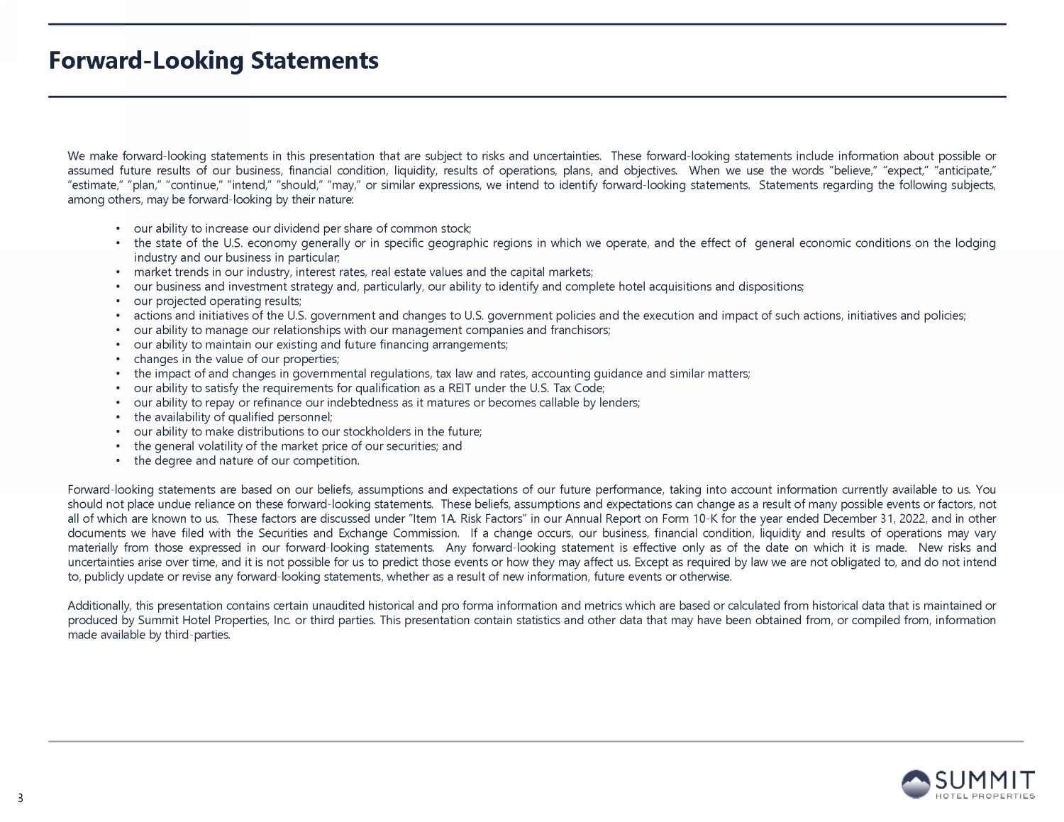 Forward - Looking Statements We make forward - looking statements in this presentation that are subject to risks and uncertainties . These forward - looking statements include information about possible or assumed future results of our business, financial condition, liquidity, results of operations, plans, and objectives . When we use the words “believe,” “expect,” “anticipate,” “estimate,” “plan,” “continue,” “intend,” “should,” “may,” or similar expressions, we intend to identify forward - looking statements . Statements regarding the following subjects, among others, may be forward - looking by their nature : • our ability to increase our dividend per share of common stock ; • the state of the U . S . economy generally or in specific geographic regions in which we operate, and the effect of general economic conditions on the lodging industry and our business in particular ; • market trends in our industry, interest rates, real estate values and the capital markets ; • our business and investment strategy and, particularly, our ability to identify and complete hotel acquisitions and dispositions ; • our projected operating results ; • actions and initiatives of the U . S . government and changes to U . S . government policies and the execution and impact of such actions, initiatives and policies ; • our ability to manage our relationships with our management companies and franchisors ; • our ability to maintain our existing and future financing arrangements ; • changes in the value of our properties ; • the impact of and changes in governmental regulations, tax law and rates, accounting guidance and similar matters ; • our ability to satisfy the requirements for qualification as a REIT under the U . S . Tax Code ; • our ability to repay or refinance our indebtedness as it matures or becomes callable by lenders ; • the availability of qualified personnel ; • our ability to make distributions to our stockholders in the future ; • the general volatility of the market price of our securities ; and • the degree and nature of our competition . Forward - looking statements are based on our beliefs, assumptions and expectations of our future performance, taking into account information currently available to us . You should not place undue reliance on these forward - looking statements . These beliefs, assumptions and expectations can change as a result of many possible events or factors, not all of which are known to us . These factors are discussed under “Item 1 A . Risk Factors” in our Annual Report on Form 10 - K for the year ended December 31 , 2022 , and in other documents we have filed with the Securities and Exchange Commission . If a change occurs, our business, financial condition, liquidity and results of operations may vary materially from those expressed in our forward - looking statements . Any forward - looking statement is effective only as of the date on which it is made . New risks and uncertainties arise over time, and it is not possible for us to predict those events or how they may affect us . Except as required by law we are not obligated to, and do not intend to, publicly update or revise any forward - looking statements, whether as a result of new information, future events or otherwise . Additionally, this presentation contains certain unaudited historical and pro forma information and metrics which are based or calculated from historical data that is maintained or produced by Summit or third parties . This presentation contain statistics and other data that may have been obtained from, or compiled from, information made available by third - parties . 3