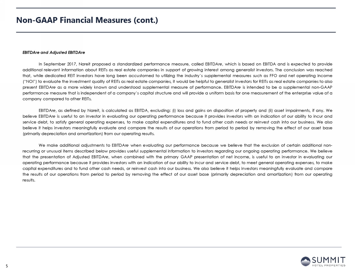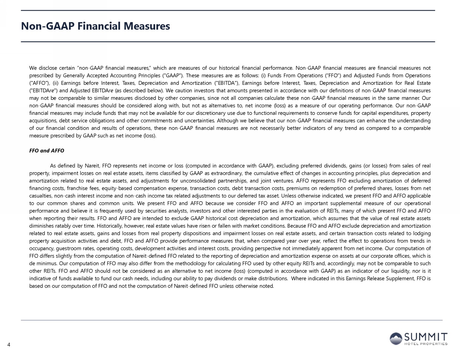Non - GAAP Financial Measures We disclose certain “non - GAAP financial measures,” which are measures of our historical financial performance . Non - GAAP financial measures are financial measures not prescribed by Generally Accepted Accounting Principles ("GAAP") . These measures are as follows : (i) Funds From Operations (“FFO”) and Adjusted Funds from Operations ("AFFO"), (ii) Earnings before Interest, Taxes, Depreciation and Amortization ("EBITDA"), Earnings before Interest, Taxes, Depreciation and Amortization for Real Estate (" EBITDA re ") and Adjusted EBITDA re (as described below) . We caution investors that amounts presented in accordance with our definitions of non - GAAP financial measures may not be comparable to similar measures disclosed by other companies, since not all companies calculate these non - GAAP financial measures in the same manner . Our non - GAAP financial measures should be considered along with, but not as alternatives to, net income (loss) as a measure of our operating performance . Our non - GAAP financial measures may include funds that may not be available for our discretionary use due to functional requirements to conserve funds for capital expenditures, property acquisitions, debt service obligations and other commitments and uncertainties . Although we believe that our non - GAAP financial measures can enhance the understanding of our financial condition and results of operations, these non - GAAP financial measures are not necessarily better indicators of any trend as compared to a comparable measure prescribed by GAAP such as net income (loss) . FFO and AFFO As defined by Nareit, FFO represents net income or loss (computed in accordance with GAAP), excluding preferred dividends, gains (or losses) from sales of real property, impairment losses on real estate assets, items classified by GAAP as extraordinary, the cumulative effect of changes in accounting principles, plus depreciation and amortization related to real estate assets, and adjustments for unconsolidated partnerships, and joint ventures . AFFO represents FFO excluding amortization of deferred financing costs, franchise fees, equity - based compensation expense, transaction costs, debt transaction costs, premiums on redemption of preferred shares, losses from net casualties, non - cash interest income and non - cash income tax related adjustments to our deferred tax asset . Unless otherwise indicated, we present FFO and AFFO applicable to our common shares and common units . We present FFO and AFFO because we consider FFO and AFFO an important supplemental measure of our operational performance and believe it is frequently used by securities analysts, investors and other interested parties in the evaluation of REITs, many of which present FFO and AFFO when reporting their results . FFO and AFFO are intended to exclude GAAP historical cost depreciation and amortization, which assumes that the value of real estate assets diminishes ratably over time . Historically, however, real estate values have risen or fallen with market conditions . Because FFO and AFFO exclude depreciation and amortization related to real estate assets, gains and losses from real property dispositions and impairment losses on real estate assets, and certain transaction costs related to lodging property acquisition activities and debt, FFO and AFFO provide performance measures that, when compared year over year, reflect the effect to operations from trends in occupancy, guestroom rates, operating costs, development activities and interest costs, providing perspective not immediately apparent from net income . Our computation of FFO differs slightly from the computation of Nareit - defined FFO related to the reporting of depreciation and amortization expense on assets at our corporate offices, which is de minimus . Our computation of FFO may also differ from the methodology for calculating FFO used by other equity REITs and, accordingly, may not be comparable to such other REITs . FFO and AFFO should not be considered as an alternative to net income (loss) (computed in accordance with GAAP) as an indicator of our liquidity, nor is it indicative of funds available to fund our cash needs, including our ability to pay dividends or make distributions . Where indicated in this Annual Report on Form 10 - K, FFO is based on our computation of FFO and not the computation of Nareit - defined FFO unless otherwise noted . 4