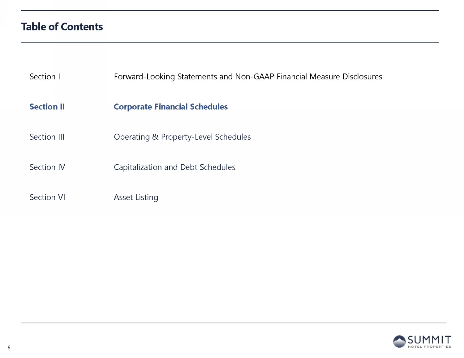 Table of Contents Section I Forward - Looking Statements and Non - GAAP Financial Measure Disclosures Section II Corporate Financial Schedules Section III Operating & Property - Level Schedules Section IV Capitalization and Debt Schedules Section VI Asset Listing 6