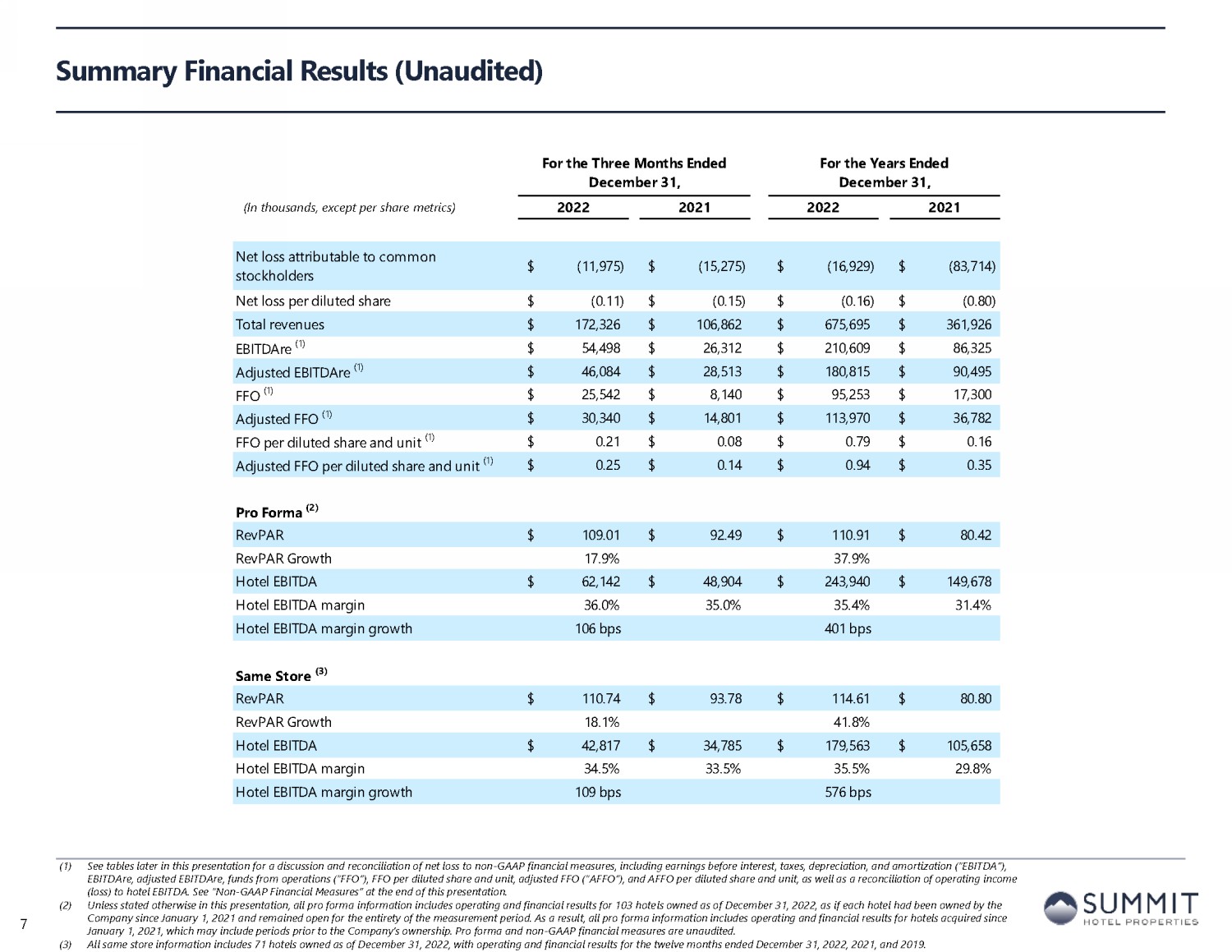Summary Financial Results (1) See tables later in this presentation for a discussion and reconciliation of net loss to non - GAAP financial measures, including earnings before interest, taxes, depreciation, and amortization (“EBITDA”), EBITDAre, adjusted EBITDAre, funds from operations (“FFO”), FFO per diluted share and unit, adjusted FFO (“AFFO”), and AFFO p er diluted share and unit, as well as a reconciliation of operating income ( loss) to hotel EBITDA. See “Non - GAAP Financial Measures” at the end of this presentation. (2) Unless stated otherwise in this presentation, all pro forma information includes operating and financial results for 103 hote ls owned as of December 31, 2022, as if each hotel had been owned by the Company since January 1, 2021 and remained open for the entirety of the measurement period. As a result, all pro forma inform ati on includes operating and financial results for hotels acquired since January 1, 2021, which may include periods prior to the Company’s ownership. Pro forma and non - GAAP financial measures are unaud ited. (3) All same store information includes 71 hotels owned as of December 31, 2022, with operating and financial results for the twe lve months ended December 31, 2022, 2021, and 2019. (In thousands, except per share metrics) For the Three Months Ended December 31, For the Years Ended December 31, 2022 2021 2022 2021 (unaudited) Net loss attributable to common stockholders (11,975)$ (15,275)$ (16,929)$ (83,714)$ Net loss per diluted share (0.11)$ (0.15)$ (0.16)$ (0.80)$ Total revenues 172,326$ 106,862$ 675,695$ 361,926$ EBITDAre (1) 54,498$ 26,312$ 210,609$ 86,325$ Adjusted EBITDAre (1) 46,084$ 28,513$ 180,815$ 90,495$ FFO (1) 25,542$ 8,140$ 95,253$ 17,300$ Adjusted FFO (1) 30,340$ 14,801$ 113,970$ 36,782$ FFO per diluted share and unit (1) 0.21$ 0.08$ 0.79$ 0.16$ Adjusted FFO per diluted share and unit (1) 0.25$ 0.14$ 0.94$ 0.35$ Pro Forma (2) RevPAR 109.01$ 92.49$ 110.91$ 80.42$ RevPAR Growth 17.9% 37.9% Hotel EBITDA 62,142$ 48,904$ 243,940$ 149,678$ Hotel EBITDA margin 36.0% 35.0% 35.4% 31.4% Hotel EBITDA margin growth 106 bps 401 bps Same Store (3) RevPAR 110.74$ 93.78$ 114.61$ 80.80$ RevPAR Growth 18.1% 41.8% Hotel EBITDA 42,817$ 34,785$ 179,563$ 105,658$ Hotel EBITDA margin 34.5% 33.5% 35.5% 29.8% Hotel EBITDA margin growth 109 bps 576 bps 7