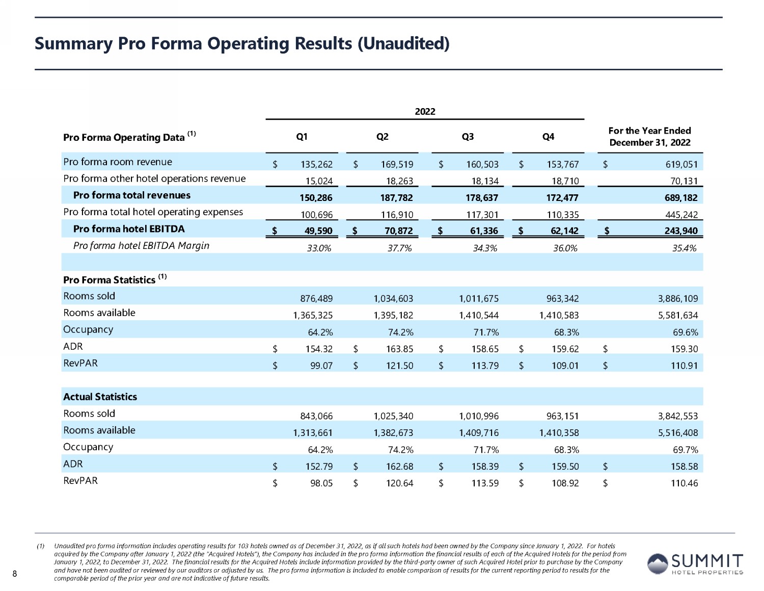 Summary Pro Forma Operating Results (1) Unaudited pro forma information includes operating results for 103 hotels owned as of December 31, 2022, as if all such hotel s h ad been owned by the Company since January 1, 2022. For hotels acquired by the Company after January 1, 2022 (the “Acquired Hotels”), the Company has included in the pro forma information the financial results of each of the Acquired Hotels for the period from January 1, 2022, to December 31, 2022. The financial results for the Acquired Hotels include information provided by the thi rd - party owner of such Acquired Hotel prior to purchase by the Company and have not been audited or reviewed by our auditors or adjusted by us. The pro forma information is included to enable com par ison of results for the current reporting period to results for the comparable period of the prior year and are not indicative of future results. 2022 Pro Forma Operating Data (1) Q1 Q2 Q3 Q4 Year Ended December 31, 2022 Pro forma room revenue 135,262$ 169,519$ 160,503$ 153,767$ 619,051$ Pro forma other hotel operations revenue 15,024 18,263 18,134 18,710 70,131 Pro forma total revenues 150,286 187,782 178,637 172,477 689,182 Pro forma total hotel operating expenses 100,696 116,910 117,301 110,335 445,242 Pro forma hotel EBITDA 49,590$ 70,872$ 61,336$ 62,142$ 243,940$ Pro forma hotel EBITDA Margin 33.0% 37.7% 34.3% 36.0% 35.4% Pro Forma Statistics (1) Rooms sold 876,489 1,034,603 1,011,675 963,342 3,886,109 Rooms available 1,365,325 1,395,182 1,410,544 1,410,583 5,581,634 Occupancy 64.2% 74.2% 71.7% 68.3% 69.6% ADR 154.32$ 163.85$ 158.65$ 159.62$ 159.30$ RevPAR 99.07$ 121.50$ 113.79$ 109.01$ 110.91$ Actual Statistics Rooms sold 843,066 1,025,340 1,010,996 963,151 3,842,553 Rooms available 1,313,661 1,382,673 1,409,716 1,410,358 5,516,408 Occupancy 64.2% 74.2% 71.7% 68.3% 69.7% ADR 152.79$ 162.68$ 158.39$ 159.50$ 158.58$ RevPAR 98.05$ 120.64$ 113.59$ 108.92$ 110.46$ 8