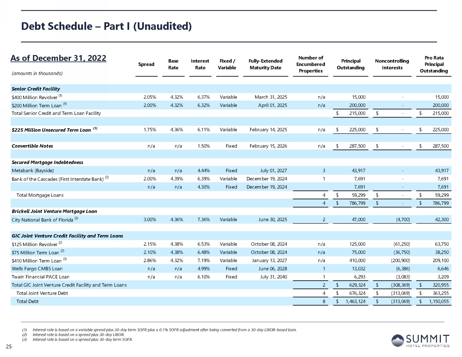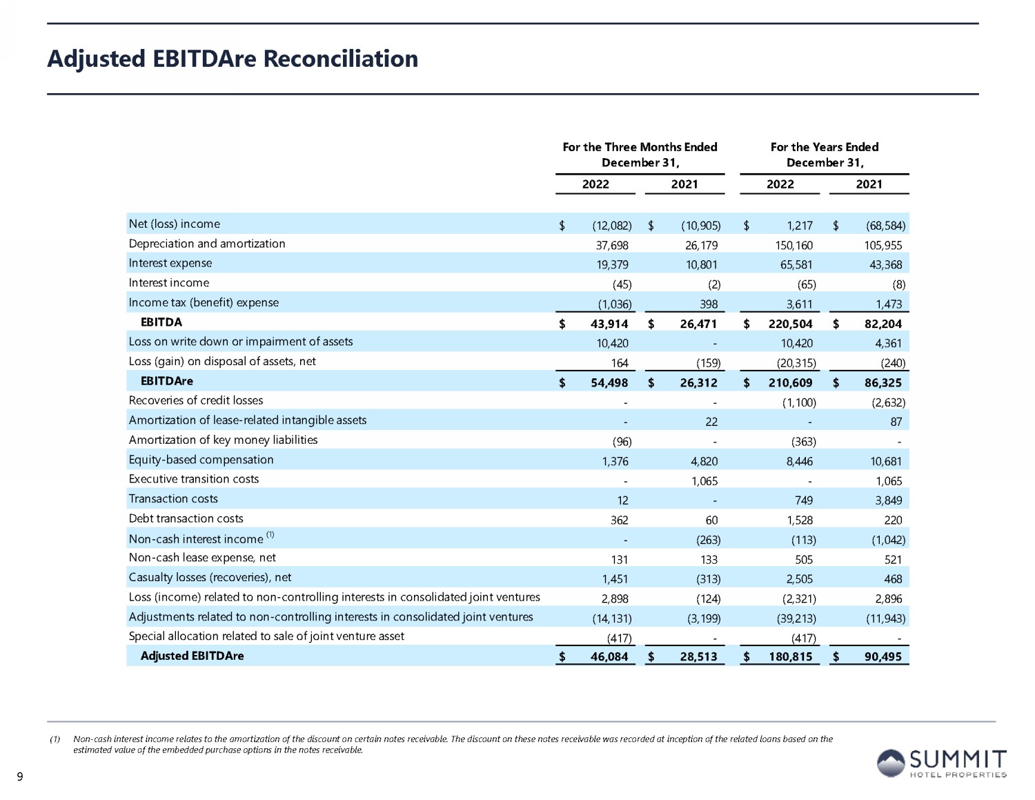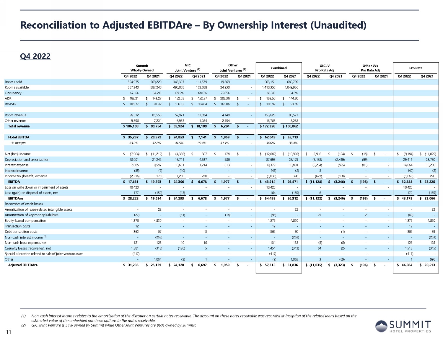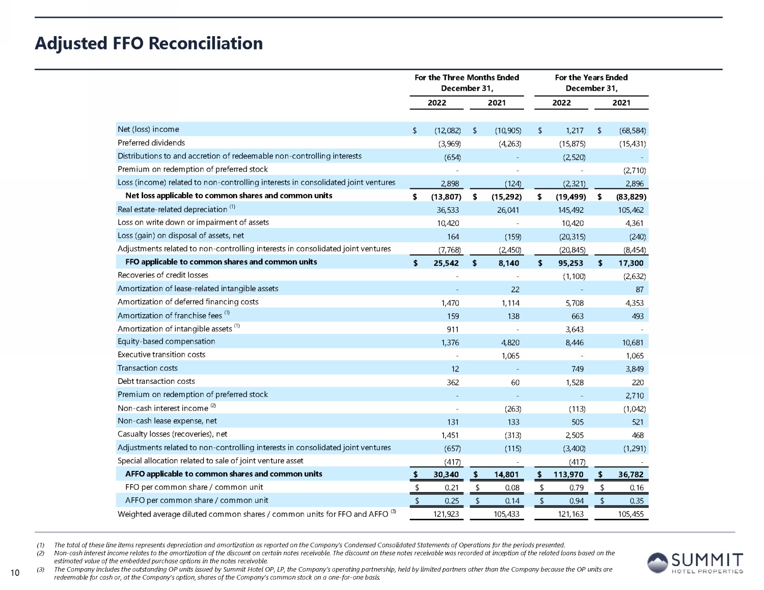 Adjusted FFO Reconciliation (1) The total of these line items represents depreciation and amortization as reported on the Company’s Condensed Consolidated St ate ments of Operations for the periods presented. (2) Non - cash interest income relates to the amortization of the discount on certain notes receivable. The discount on these notes re ceivable was recorded at inception of the related loans based on the estimated value of the embedded purchase options in the notes receivable. (3) The Company includes the outstanding OP units issued by Summit Hotel OP, LP, the Company’s operating partnership, held by lim ite d partners other than the Company because the OP units are redeemable for cash or, at the Company’s option, shares of the Company’s common stock on a one - for - one basis. 10 For the Three Months Ended December 31, For the Years Ended December 31, 2022 2021 2022 2021 Net (loss) income (12,082)$ (10,905)$ 1,217$ (68,584)$ Preferred dividends (3,969) (4,263) (15,875) (15,431) Distributions to and accretion of redeemable non-controlling interests (654) - (2,520) - Premium on redemption of preferred stock - - - (2,710) Loss (income) related to non-controlling interests in consolidated joint ventures 2,898 (124) (2,321) 2,896 Net loss applicable to common shares and common units (13,807)$ (15,292)$ (19,499)$ (83,829)$ Real estate-related depreciation (1) 36,533 26,041 145,492 105,462 Loss on write down or impairment of assets 10,420 - 10,420 4,361 Loss (gain) on disposal of assets, net 164 (159) (20,315) (240) Adjustments related to non-controlling interests in consolidated joint ventures (7,768) (2,450) (20,845) (8,454) FFO applicable to common shares and common units 25,542$ 8,140$ 95,253$ 17,300$ Recoveries of credit losses - - (1,100) (2,632) Amortization of lease-related intangible assets - 22 - 87 Amortization of deferred financing costs 1,470 1,114 5,708 4,353 Amortization of franchise fees (1) 159 138 663 493 Amortization of intangible assets (1) 911 - 3,643 - Equity-based compensation 1,376 4,820 8,446 10,681 Executive transition costs - 1,065 - 1,065 Transaction costs 12 - 749 3,849 Debt transaction costs 362 60 1,528 220 Premium on redemption of preferred stock - - - 2,710 Non-cash interest income (2) - (263) (113) (1,042) Non-cash lease expense, net 131 133 505 521 Casualty losses (recoveries), net 1,451 (313) 2,505 468 Adjustments related to non-controlling interests in consolidated joint ventures (657) (115) (3,400) (1,291) Special allocation related to sale of joint venture asset (417) - (417) - AFFO applicable to common shares and common units 30,340$ 14,801$ 113,970$ 36,782$ FFO per common share / common unit 0.21$ 0.08$ 0.79$ 0.16$ AFFO per common share / common unit 0.25$ 0.14$ 0.94$ 0.35$ Weighted average diluted common shares / common units for FFO and AFFO (3) 121,923 105,433 121,163 105,455