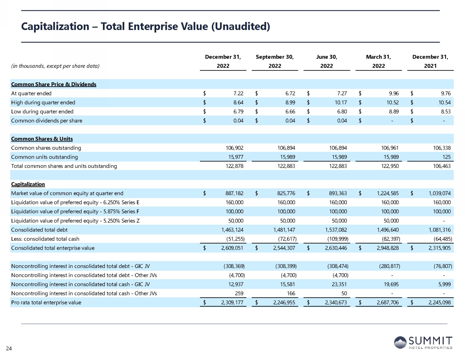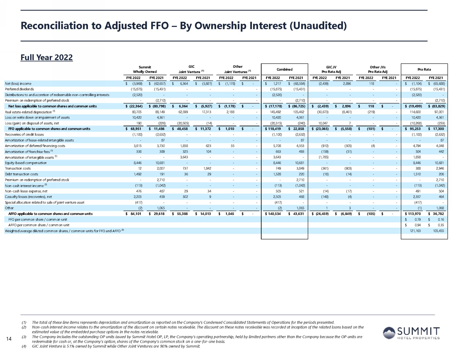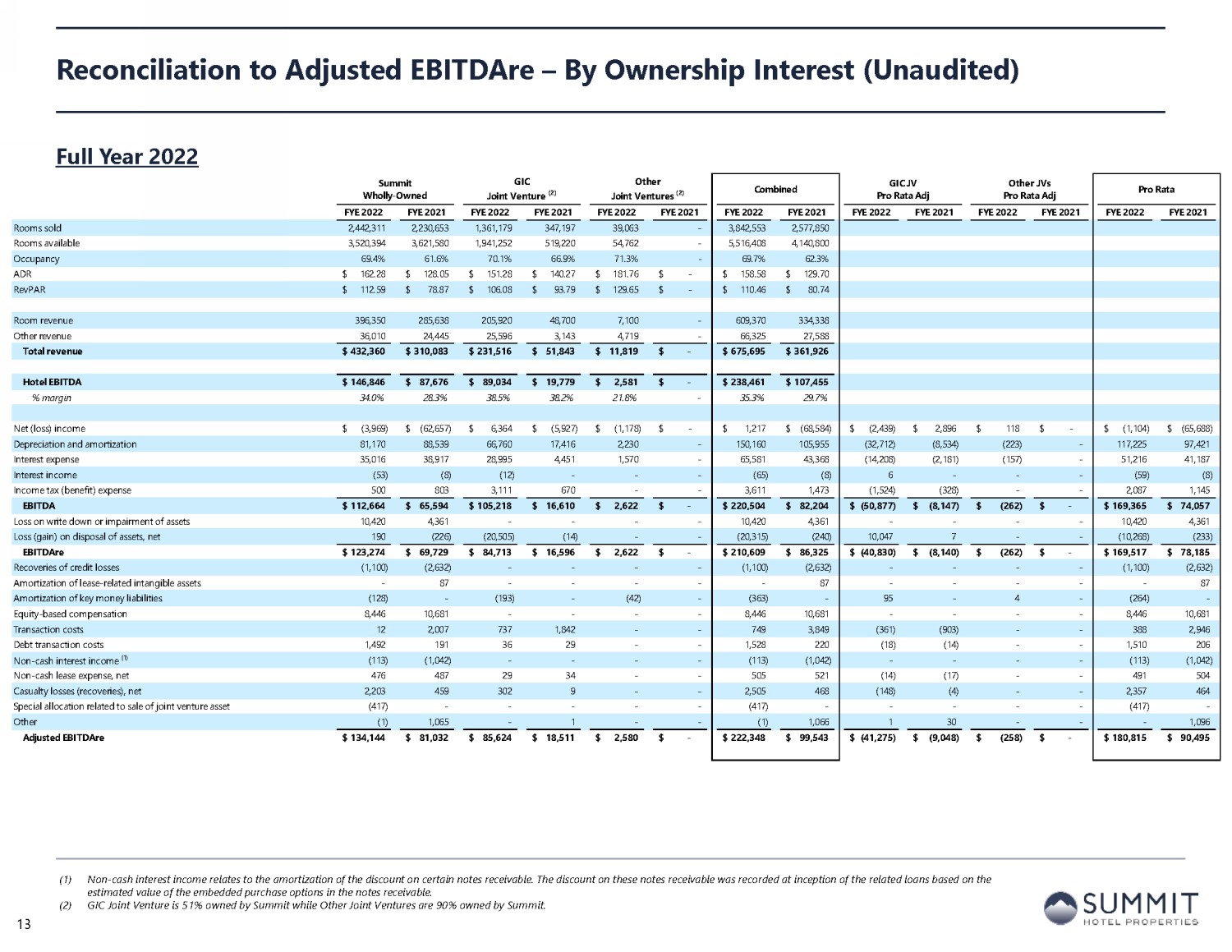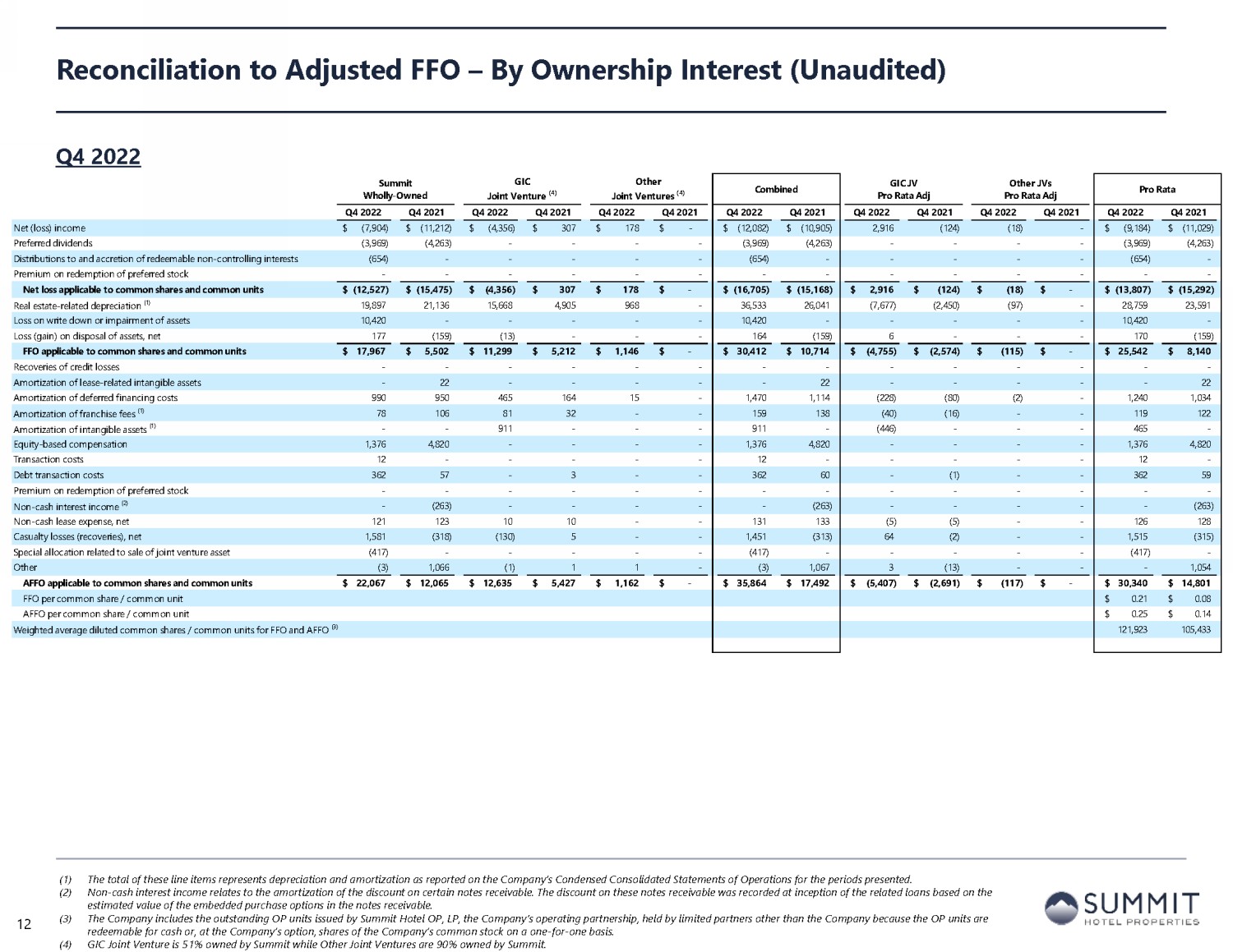 Summit Wholly-Owned GIC Joint Venture (4) Other Joint Ventures (4) Consolidated GIC JV Pro Rata Adj Other JVs Pro Rata Adj Pro Rata Q4 2022 Q4 2021 Q4 2022 Q4 2021 Q4 2022 Q4 2021 Q4 2022 Q4 2021 Q4 2022 Q4 2021 Q4 2022 Q4 2021 Q4 2022 Q4 2021 Net (loss) income (7,904)$ (11,212)$ (4,356)$ 307$ 178$ -$ (12,082)$ (10,905)$ 2,916 (124) (18) - (9,184)$ (11,029)$ Preferred dividends (3,969) (4,263) - - - - (3,969) (4,263) - - - - (3,969) (4,263) Distributions and accretion of redeemable non-controlling interests (654) - - - - - (654) - - - - - (654) - Premium on redemption of preferred stock - - - - - - - - - - - - - - Net loss applicable to common shares and common units (12,527)$ (15,475)$ (4,356)$ 307$ 178$ -$ (16,705)$ (15,168)$ 2,916$ (124)$ (18)$ -$ (13,807)$ (15,292)$ Real estate-related depreciation (1) 19,897 21,136 15,668 4,905 968 - 36,533 26,041 (7,677) (2,450) (97) - 28,759 23,591 Loss on impairment of assets 10,420 - - - - - 10,420 - - - - - 10,420 - Loss (gain) on disposal of assets, net 177 (159) (13) - - - 164 (159) 6 - - - 170 (159) FFO applicable to common shares and common units 17,967$ 5,502$ 11,299$ 5,212$ 1,146$ -$ 30,412$ 10,714$ (4,755)$ (2,574)$ (115)$ -$ 25,542$ 8,140$ Reversal of credit losses - - - - - - - - - - - - - - Amortization of lease-related intangible assets - 22 - - - - - 22 - - - - - 22 Amortization of deferred financing costs 990 950 465 164 15 - 1,470 1,114 (228) (80) (2) - 1,240 1,034 Amortization of franchise fees (1) 78 106 81 32 - - 159 138 (40) (16) - - 119 122 Amortization of intangible assets (1) - - 911 - - - 911 - (446) - - - 465 - Equity-based compensation 1,376 4,820 - - - - 1,376 4,820 - - - - 1,376 4,820 Transaction costs 12 - - - - - 12 - - - - - 12 - Debt transaction costs 362 57 - 3 - - 362 60 - (1) - - 362 59 Premium on redemption of preferred stock - - - - - - - - - - - - - - Non-cash interest income (2) - (263) - - - - - (263) - - - - - (263) Non-cash lease expense, net 121 123 10 10 - - 131 133 (5) (5) - - 126 128 Casualty losses (recoveries), net 1,581 (318) (130) 5 - - 1,451 (313) 64 (2) - - 1,515 (315) Other (3) 3,998 (1) 1 1 - (3) 3,999 (414) (2,945) - - (417) 1,054 AFFO applicable to common shares and common units 22,484$ 14,997$ 12,635$ 5,427$ 1,162$ -$ 36,281$ 20,424$ (5,824)$ (5,623)$ (117)$ -$ 30,340$ 14,801$ FFO per common share / common unit 0.21$ 0.08$ AFFO per common share / common unit 0.25$ 0.14$ Weighted average diluted common shares / common units for FFO and AFFO (3) 121,923 105,433 Reconciliation to Adjusted FFO – By Ownership Interest Q4 2022 (1) The total of these line items represents depreciation and amortization as reported on the Company’s Condensed Consolidated St ate ments of Operations for the periods presented. (2) Non - cash interest income relates to the amortization of the discount on certain notes receivable. The discount on these notes re ceivable was recorded at inception of the related loans based on the estimated value of the embedded purchase options in the notes receivable. (3) The Company includes the outstanding OP units issued by Summit Hotel OP, LP, the Company’s operating partnership, held by lim ite d partners other than the Company because the OP units are redeemable for cash or, at the Company’s option, shares of the Company’s common stock on a one - for - one basis. (4) GIC Joint Venture is 51% owned by Summit while Other Joint Ventures are 90% owned by Summit. 12