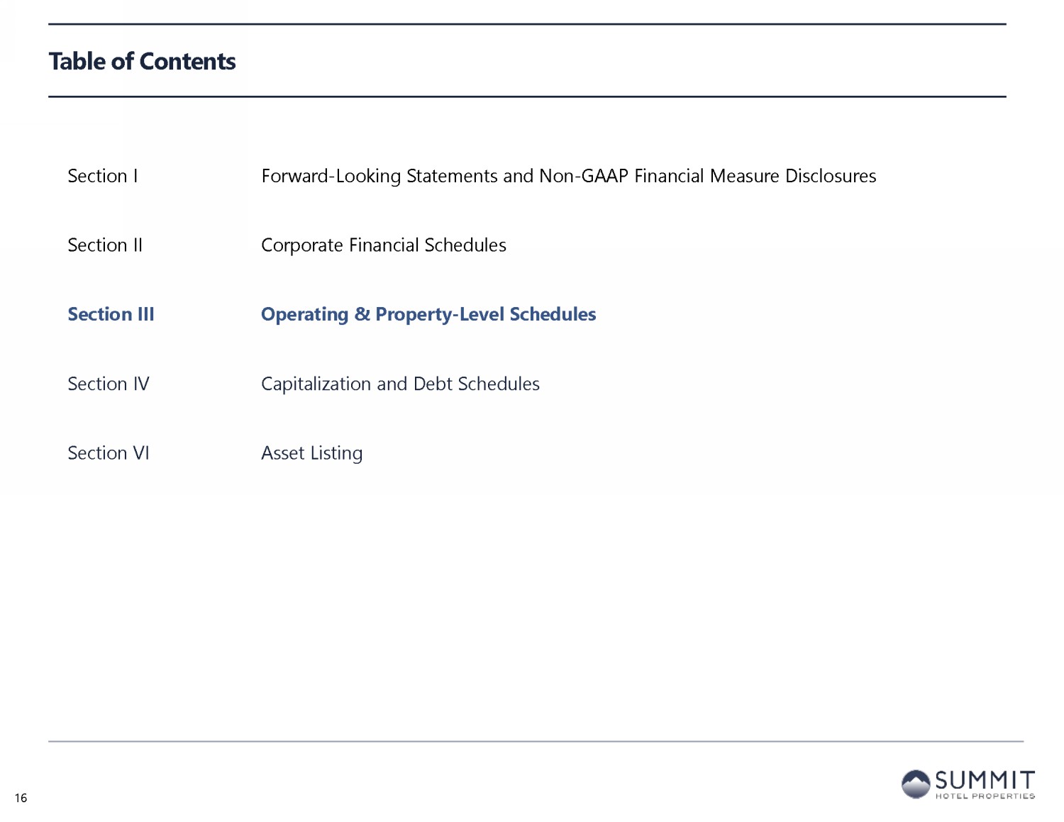 Table of Contents Section I Forward - Looking Statements and Non - GAAP Financial Measure Disclosures Section II Corporate Financial Schedules Section III Operating & Property - Level Schedules Section IV Capitalization and Debt Schedules Section VI Asset Listing 16