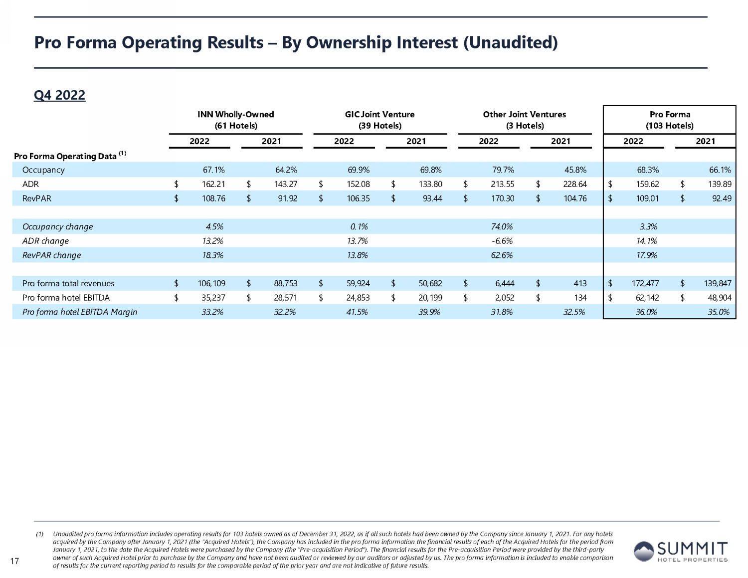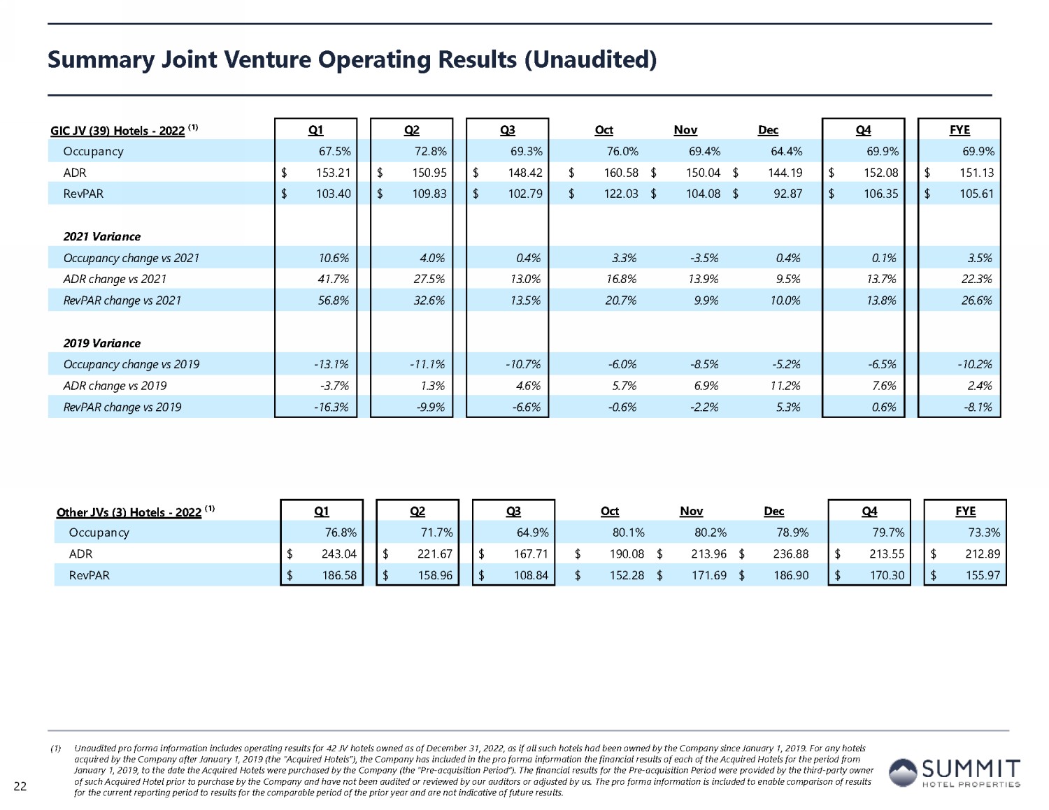 Summary Joint Venture Operating Results (1) Unaudited pro forma information includes operating results for 42 JV hotels owned as of December 31, 2022, as if all such hotels had been owned by the Company since January 1, 2019. For any h ot els acquired by the Company after January 1, 2019 (the “Acquired Hotels”), the Company has included in the pro forma information the financial results of each of the Acquired Hotels for the period from January 1, 2019, to the date the Acquired Hotels were purchased by the Company (the “Pre - acquisition Period”). The financial res ults for the Pre - acquisition Period were provided by the third - party owner of such Acquired Hotel prior to purchase by the Company and have not been audited or reviewed by our auditors or adjusted by us. The pro forma information is included to enable comparison of results for the current reporting period to results for the comparable period of the prior year and are not indicative of future resu lts . 22 GIC JV (39) Hotels - 2022 (1) Q1 Q2 Q3 Oct Nov Dec Q4 FYE Occupancy 67.5% 72.8% 69.3% 76.0% 69.4% 64.4% 69.9% 69.9% ADR 153.21$ 150.95$ 148.42$ 160.58$ 150.04$ 144.19$ 152.08$ 151.13$ RevPAR 103.40$ 109.83$ 102.79$ 122.03$ 104.08$ 92.87$ 106.35$ 105.61$ 2021 Variance Occupancy change vs 2021 10.6% 4.0% 0.4% 3.3% -3.5% 0.4% 0.1% 3.5% ADR change vs 2021 41.7% 27.5% 13.0% 16.8% 13.9% 9.5% 13.7% 22.3% RevPAR change vs 2021 56.8% 32.6% 13.5% 20.7% 9.9% 10.0% 13.8% 26.6% 2019 Variance Occupancy change vs 2019 -13.1% -11.1% -10.7% -6.0% -8.5% -5.2% -6.5% -10.2% ADR change vs 2019 -3.7% 1.3% 4.6% 5.7% 6.9% 11.2% 7.6% 2.4% RevPAR change vs 2019 -16.3% -9.9% -6.6% -0.6% -2.2% 5.3% 0.6% -8.1% Other JVs (3) Hotels - 2022 (1) Q1 Q2 Q3 Oct Nov Dec Q4 FYE Occupancy 76.8% 71.7% 64.9% 80.1% 80.2% 78.9% 79.7% 73.3% ADR 243.04$ 221.67$ 167.71$ 190.08$ 213.96$ 236.88$ 213.55$ 212.89$ RevPAR 186.58$ 158.96$ 108.84$ 152.28$ 171.69$ 186.90$ 170.30$ 155.97$ GIC JV (39) Hotels - 2022 (1) Q1 Q2 Q3 Oct Nov Dec Q4 FYE Occupancy 67.5% 72.8% 69.3% 76.0% 69.4% 64.4% 69.9% 69.9% ADR 153.21$ 150.95$ 148.42$ 160.58$ 150.04$ 144.19$ 152.08$ 151.13$ RevPAR 103.40$ 109.83$ 102.79$ 122.03$ 104.08$ 92.87$ 106.35$ 105.61$ 2021 Variance Occupancy change vs 2021 10.6% 4.0% 0.4% 3.3% -3.5% 0.4% 0.1% 3.5% ADR change vs 2021 41.7% 27.5% 13.0% 16.8% 13.9% 9.5% 13.7% 22.3% RevPAR change vs 2021 56.8% 32.6% 13.5% 20.7% 9.9% 10.0% 13.8% 26.6% 2019 Variance Occupancy change vs 2019 -13.1% -11.1% -10.7% -6.0% -8.5% -5.2% -6.5% -10.2% ADR change vs 2019 -3.7% 1.3% 4.6% 5.7% 6.9% 11.2% 7.6% 2.4% RevPAR change vs 2019 -16.3% -9.9% -6.6% -0.6% -2.2% 5.3% 0.6% -8.1% Other JVs (3) Hotels - 2022 (1) Q1 Q2 Q3 Oct Nov Dec Q4 FYE Occupancy 76.8% 71.7% 64.9% 80.1% 80.2% 78.9% 79.7% 73.3% ADR 243.04$ 221.67$ 167.71$ 190.08$ 213.96$ 236.88$ 213.55$ 212.89$ RevPAR 186.58$ 158.96$ 108.84$ 152.28$ 171.69$ 186.90$ 170.30$ 155.97$