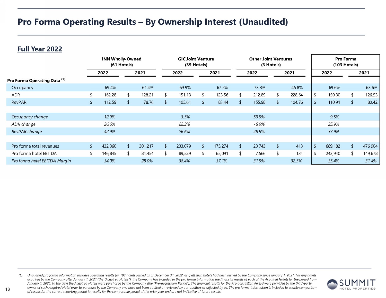 INN Wholly-Owned (61 Hotels) GIC Joint Venture (39 Hotels) Other Joint Ventures (3 Hotels) Pro Forma (103 Hotels) 2022 2021 2022 2021 2022 2021 2022 2021 Pro Forma Operating Data (1) Occupancy 67.1% 64.2% 69.9% 69.8% 79.7% 45.8% 68.3% 66.1% ADR 162.21$ 143.27$ 152.08$ 133.80$ 213.55$ 228.64$ 159.62$ 139.89$ RevPAR 108.76$ 91.92$ 106.35$ 93.44$ 170.30$ 104.76$ 109.01$ 92.49$ Occupancy change 4.5% 0.1% 74.0% 3.3% ADR change 13.2% 13.7% -6.6% 14.1% RevPAR change 18.3% 13.8% 62.6% 17.9% Pro forma total revenues 106,109$ 88,753$ 59,924$ 50,682$ 6,444$ 413$ 172,477$ 139,847$ Pro forma hotel EBITDA 35,237$ 28,571$ 24,853$ 20,199$ 2,052$ 134$ 62,142$ 48,904$ Pro forma hotel EBITDA Margin 33.2% 32.2% 41.5% 39.9% 31.8% 32.5% 36.0% 35.0% Pro Forma Operating Results – By Ownership Interest (1) Unaudited pro forma information includes operating results for 103 hotels owned as of December 31, 2022, as if all such hotel s h ad been owned by the Company since January 1, 2021. For any hotels acquired by the Company after January 1, 2021 (the “Acquired Hotels”), the Company has included in the pro forma information the financial results of each of the Acquired Hotels for the period from January 1, 2021, to the date the Acquired Hotels were purchased by the Company (the “Pre - acquisition Period”). The financial res ults for the Pre - acquisition Period were provided by the third - party owner of such Acquired Hotel prior to purchase by the Company and have not been audited or reviewed by our auditors or adjust ed by us. The pro forma information is included to enable comparison of results for the current reporting period to results for the comparable period of the prior year and are not indicative of fut ure results. Q4 2022 17