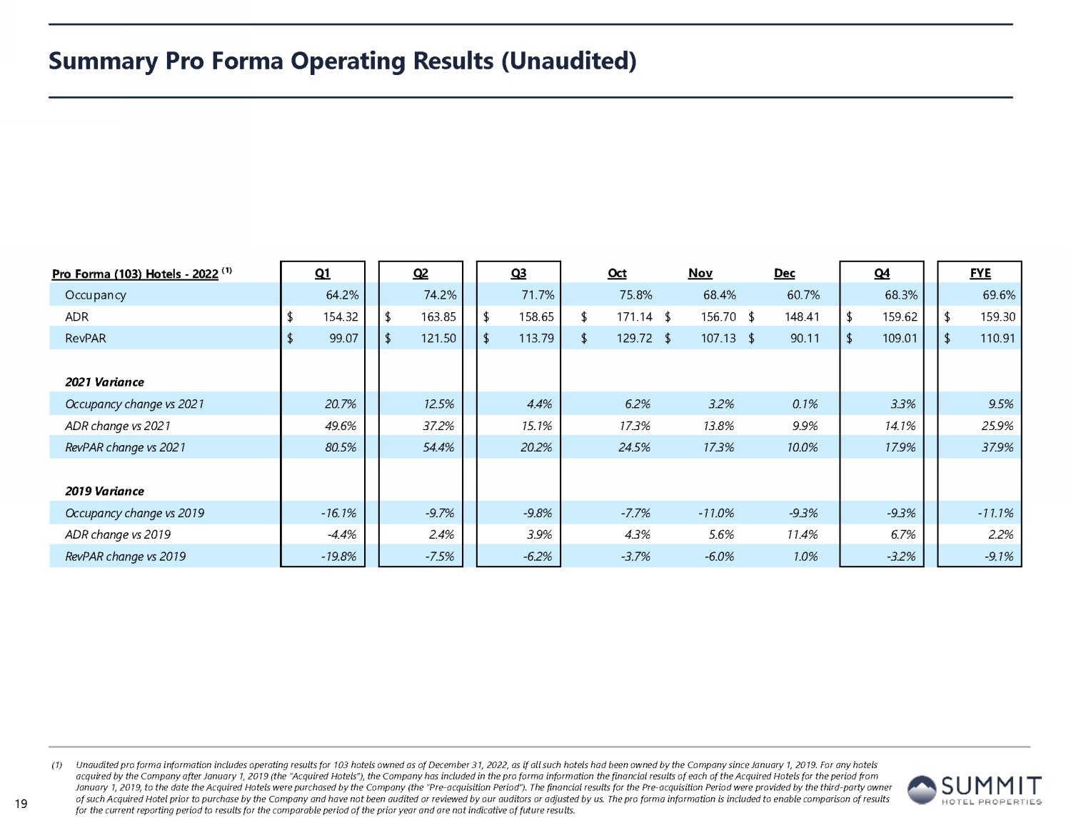 Summary Pro Forma Operating Results (1) Unaudited pro forma information includes operating results for 103 hotels owned as of December 31, 2022, as if all such hotel s h ad been owned by the Company since January 1, 2019. For any hotels acquired by the Company after January 1, 2019 (the “Acquired Hotels”), the Company has included in the pro forma information the financial results of each of the Acquired Hotels for the period from January 1, 2019, to the date the Acquired Hotels were purchased by the Company (the “Pre - acquisition Period”). The financial res ults for the Pre - acquisition Period were provided by the third - party owner of such Acquired Hotel prior to purchase by the Company and have not been audited or reviewed by our auditors or adjusted by us. The pro forma information is included to enable comparison of results for the current reporting period to results for the comparable period of the prior year and are not indicative of future resu lts . Pro Forma (103) Hotels - 2022 (1) Q1 Q2 Q3 Oct Nov Dec Q4 FYE Occupancy 64.2% 74.2% 71.7% 75.8% 68.4% 60.7% 68.3% 69.6% ADR 154.32$ 163.85$ 158.65$ 171.14$ 156.70$ 148.41$ 159.62$ 159.30$ RevPAR 99.07$ 121.50$ 113.79$ 129.72$ 107.13$ 90.11$ 109.01$ 110.91$ 2021 Variance Occupancy change vs 2021 20.7% 12.5% 4.4% 6.2% 3.2% 0.1% 3.3% 9.5% ADR change vs 2021 49.6% 37.2% 15.1% 17.3% 13.8% 9.9% 14.1% 25.9% RevPAR change vs 2021 80.5% 54.4% 20.2% 24.5% 17.3% 10.0% 17.9% 37.9% 2019 Variance Occupancy change vs 2019 -16.1% -9.7% -9.8% -7.7% -11.0% -9.3% -9.3% -11.1% ADR change vs 2019 -4.4% 2.4% 3.9% 4.3% 5.6% 11.4% 6.7% 2.2% RevPAR change vs 2019 -19.8% -7.5% -6.2% -3.7% -6.0% 1.0% -3.2% -9.1% 19